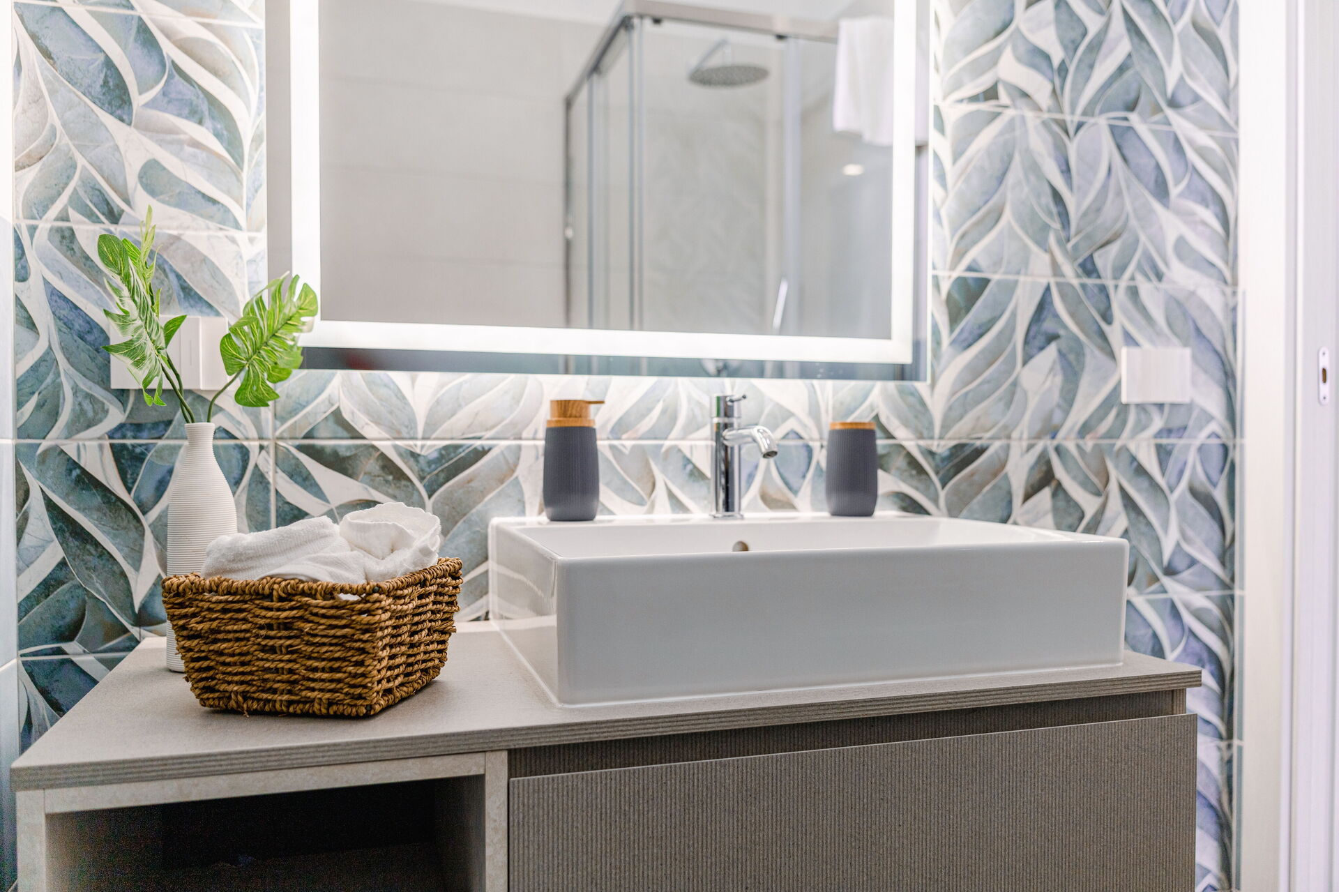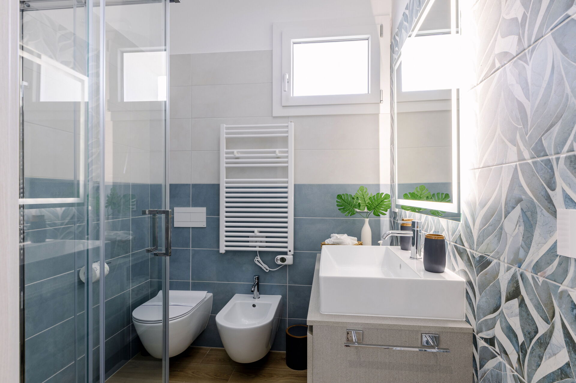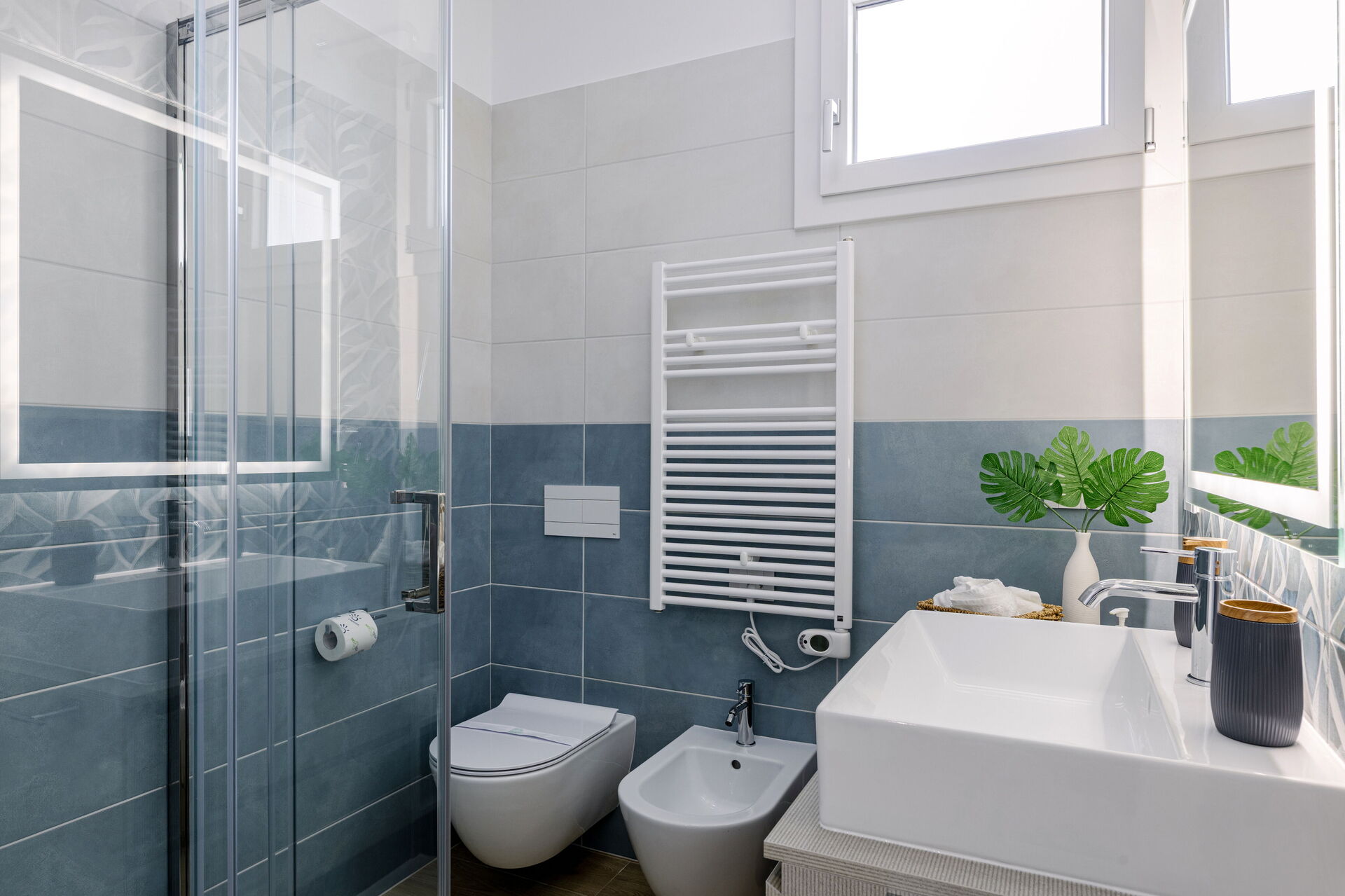 Badezimmer: Waschbecken, WC, Bidet, Dusche, Fön.