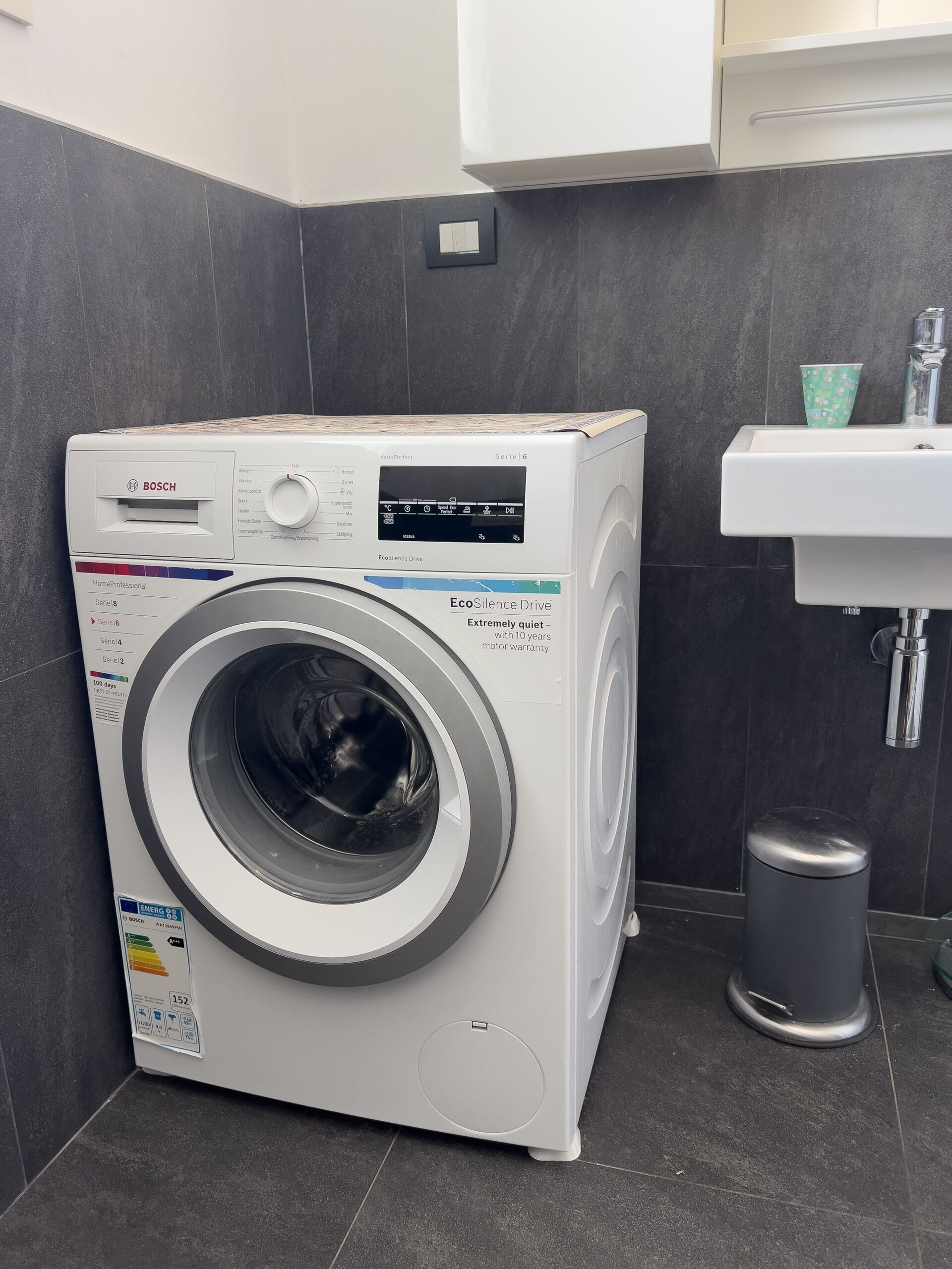 Badezimmer mit Dusche, Waschbecken, WC und Bidet sowie Waschmaschine.