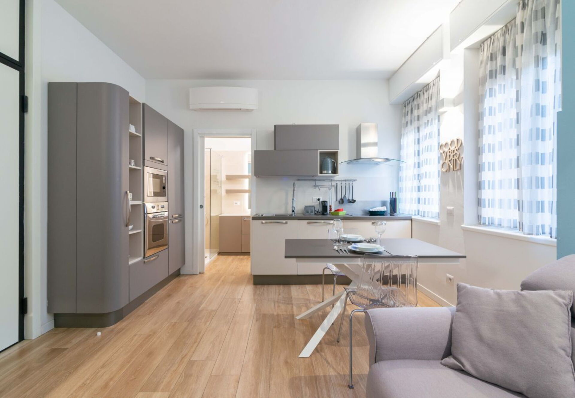 Wohnküche: gut ausgestattete Küche, Esstisch, Spülmaschine, Kühlschrank, Tiefkühler, Herd, Ofen, Italienische Kaffeemaschine, Sofa, WiFi Internet, Internet, Klimaanlage, Fliegengitter, Satelliten-TV, CO2 Detektor.