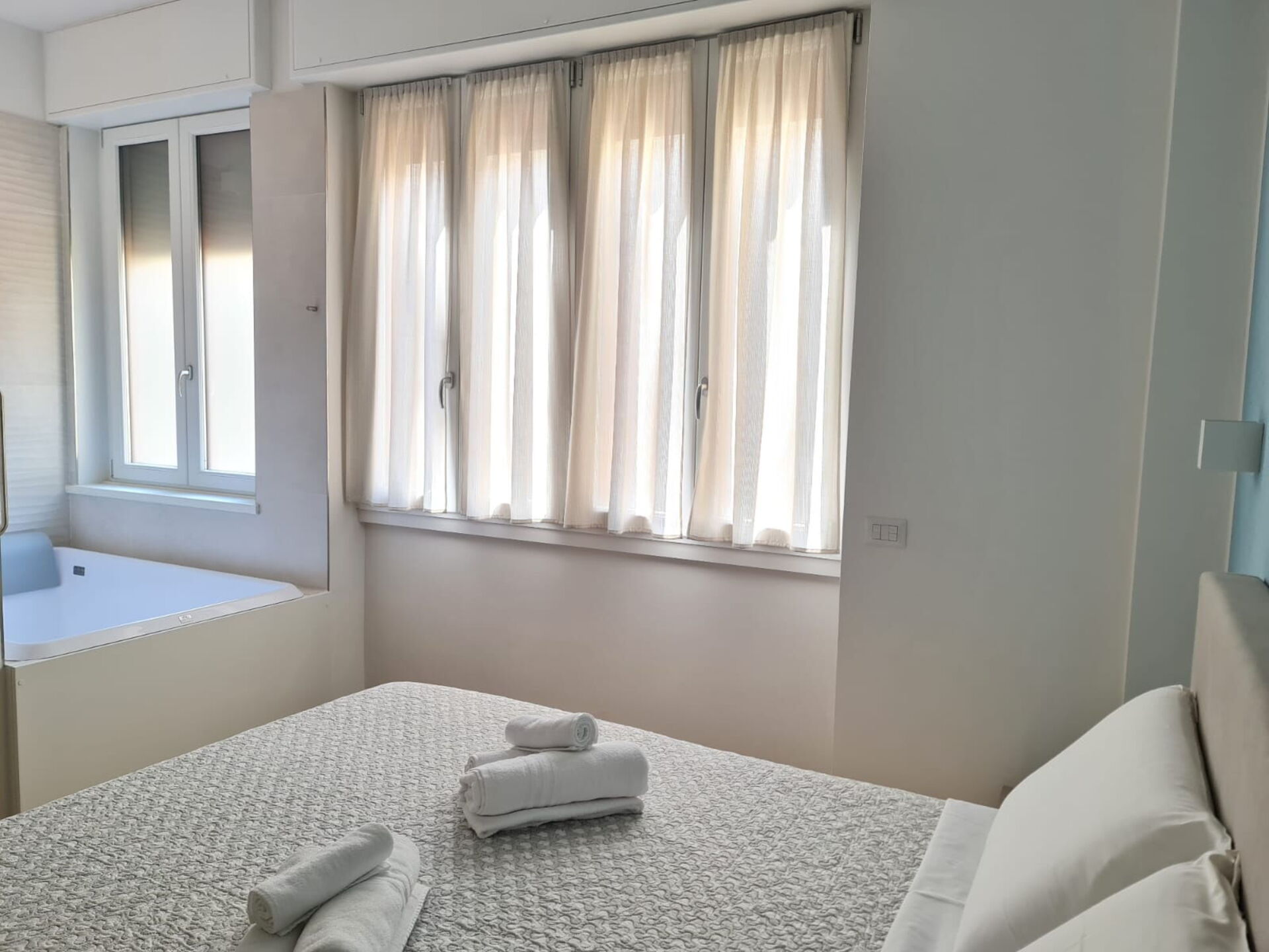 Schlafzimmer mit Bad: Doppelbett, WiFi Internet, Klimaanlage, Whirlpool-Badewanne.