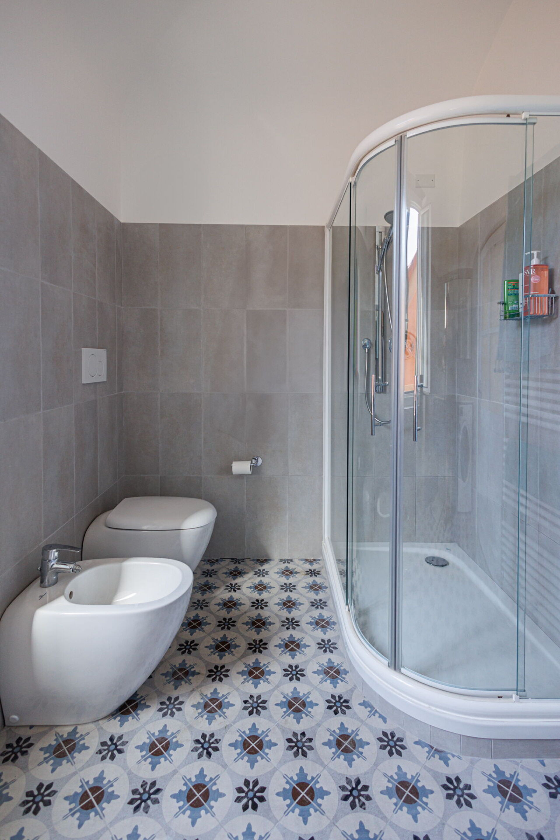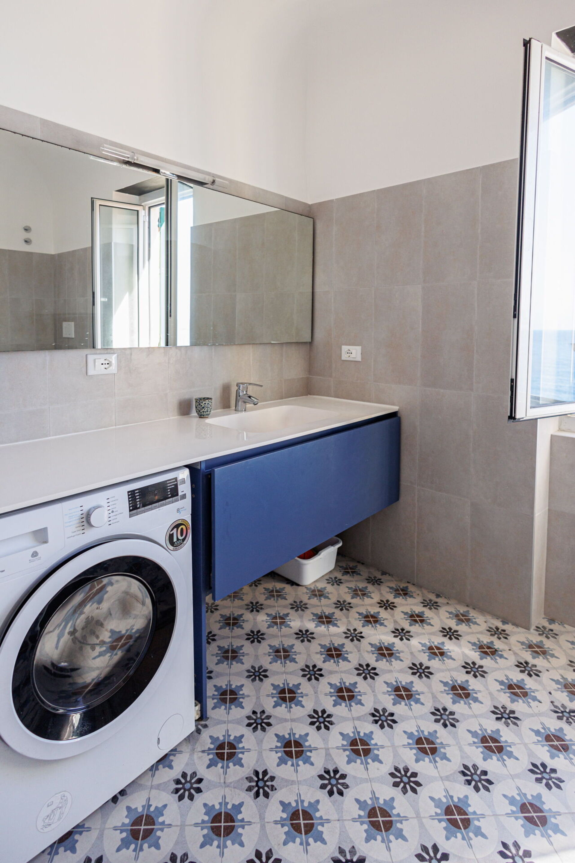 Badezimmer: Waschbecken, WC, Bidet, Dusche, Fön, Waschmaschine, WiFi Internet.