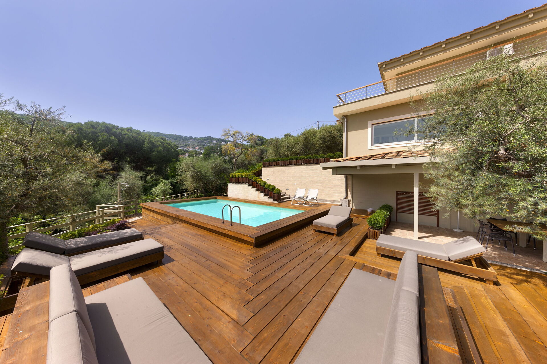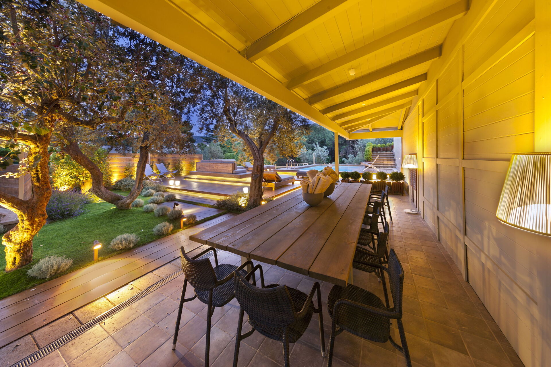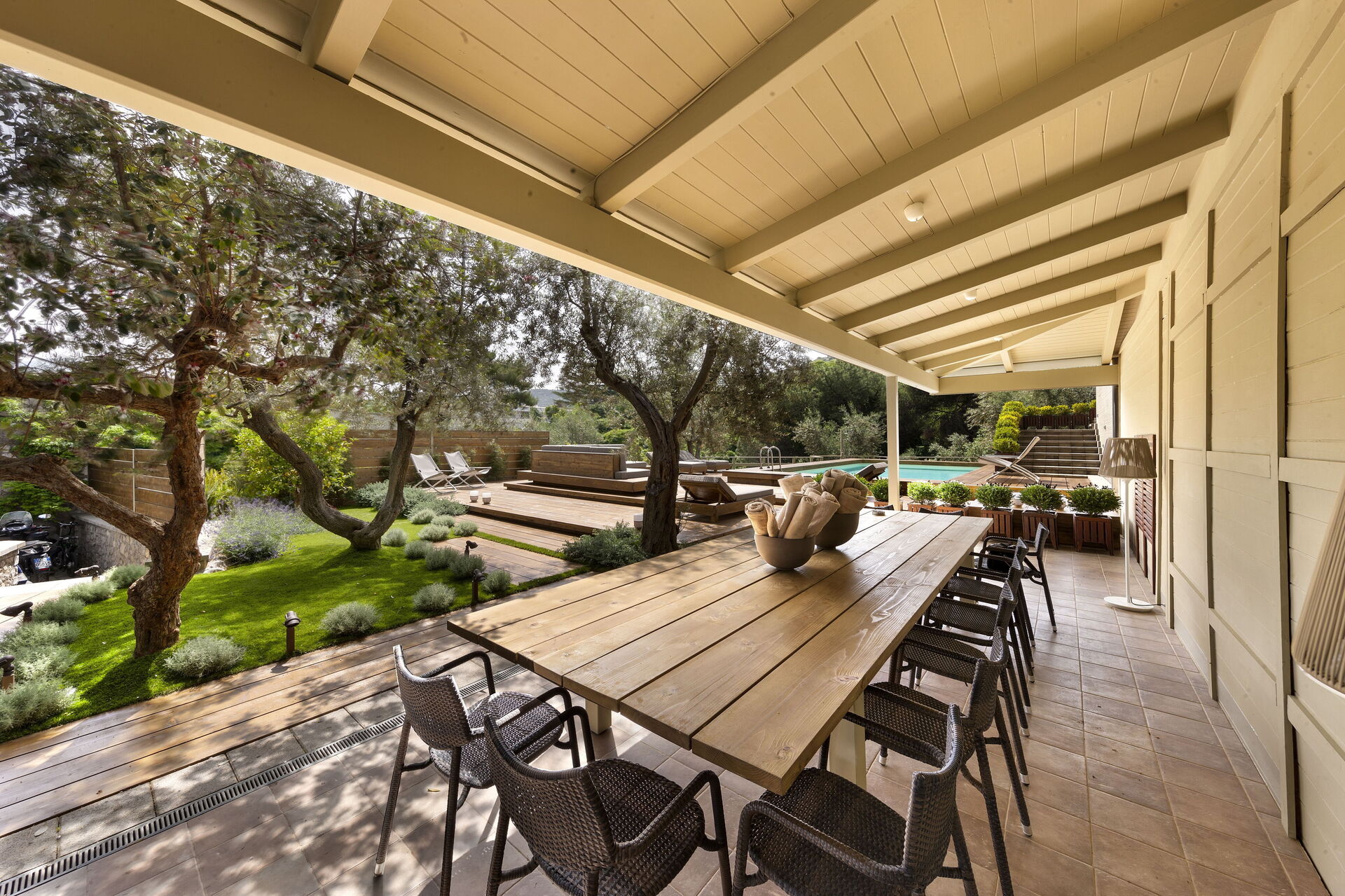 Garten: Schwimmbad (Breite: 4m, Länge: 9m, max. Tiefe: 1.2m, min. Tiefe: 1.2m, Tiefe: 1.2m, Außen), Dusche, WiFi Internet, Grill, Außenbereich für das Essen im Freien, Esstisch (Personen: 12), Pavillon, Sonnenliege.