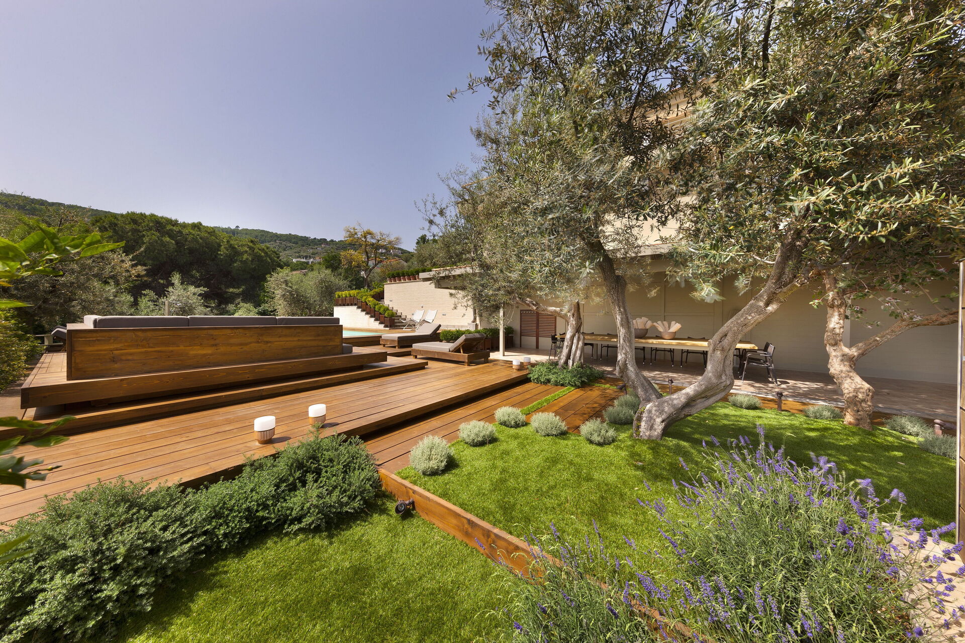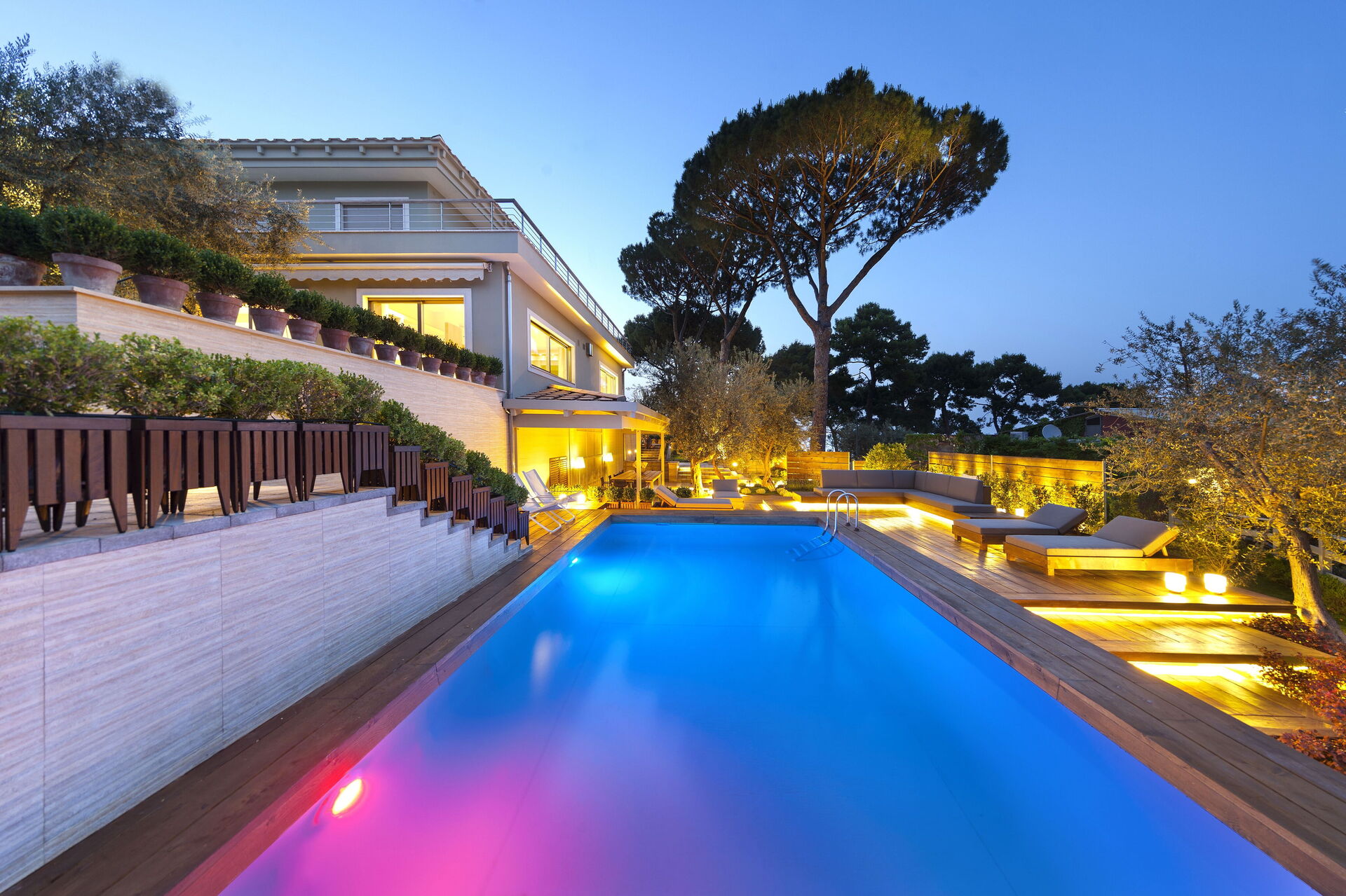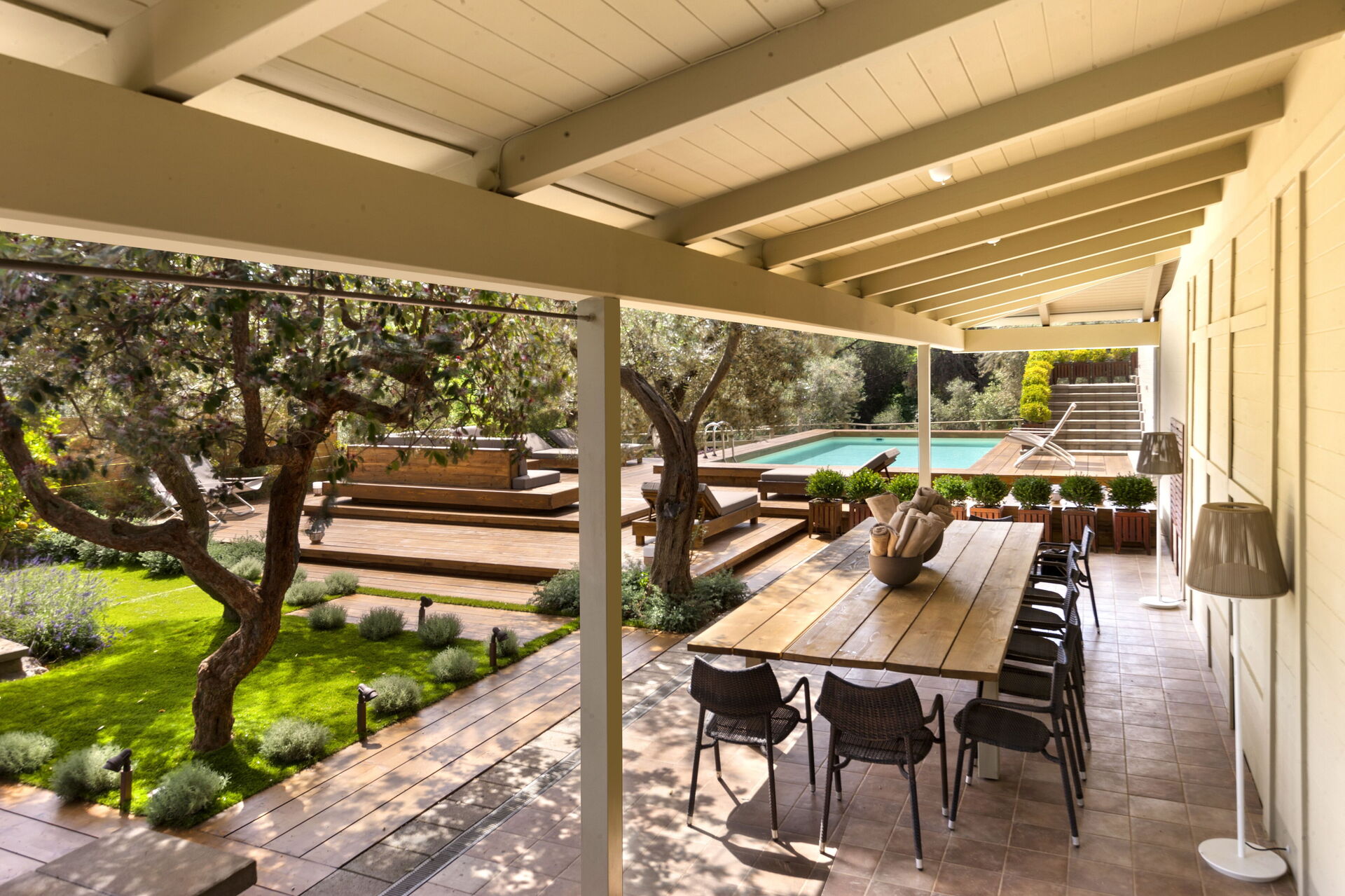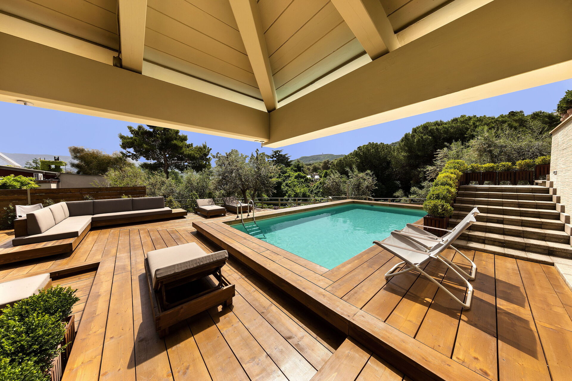 Garten: Schwimmbad (Breite: 4m, Länge: 9m, max. Tiefe: 1.2m, min. Tiefe: 1.2m, Tiefe: 1.2m, Außen), Dusche, WiFi Internet, Grill, Außenbereich für das Essen im Freien, Esstisch (Personen: 12), Pavillon, Sonnenliege.