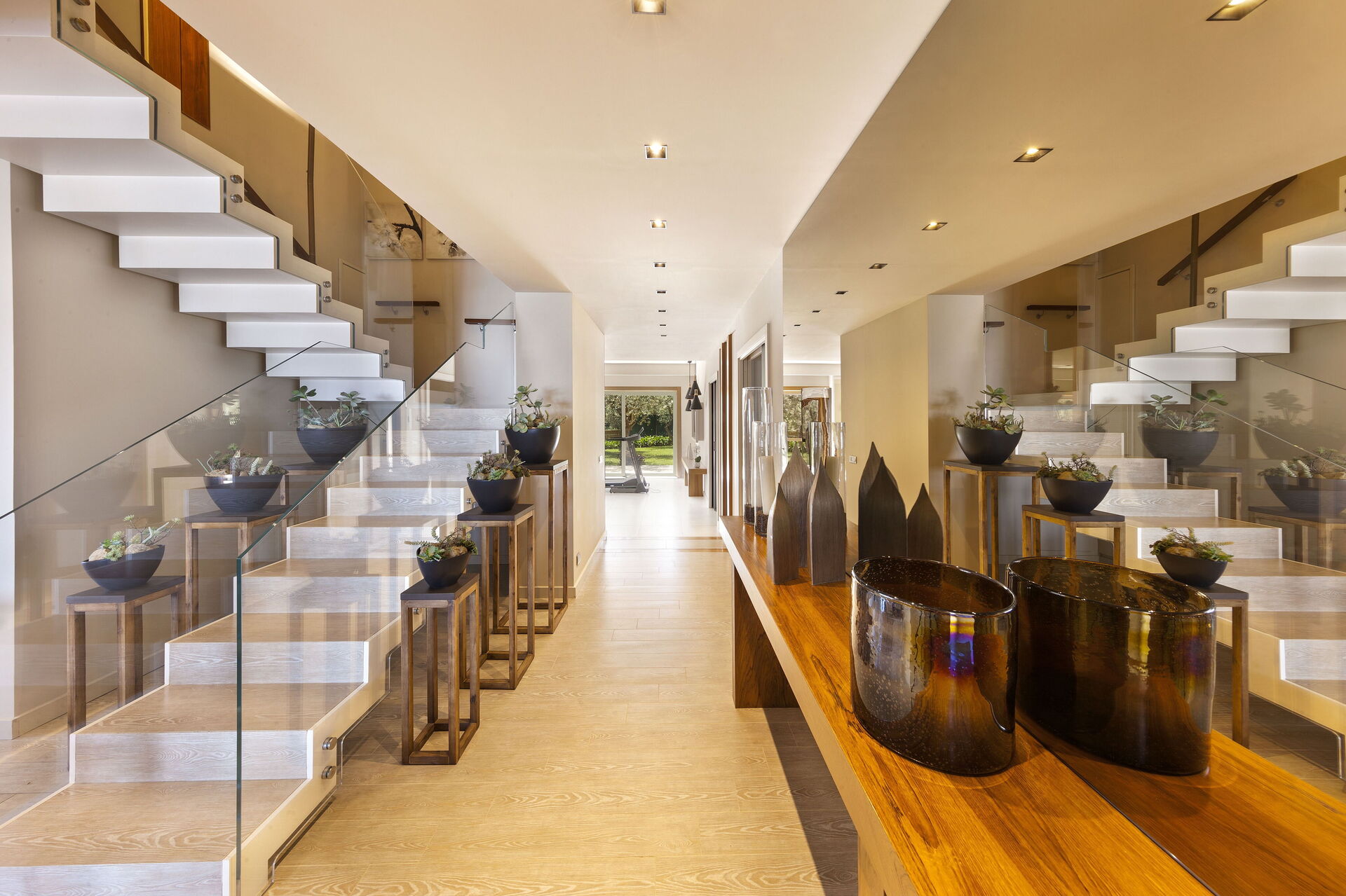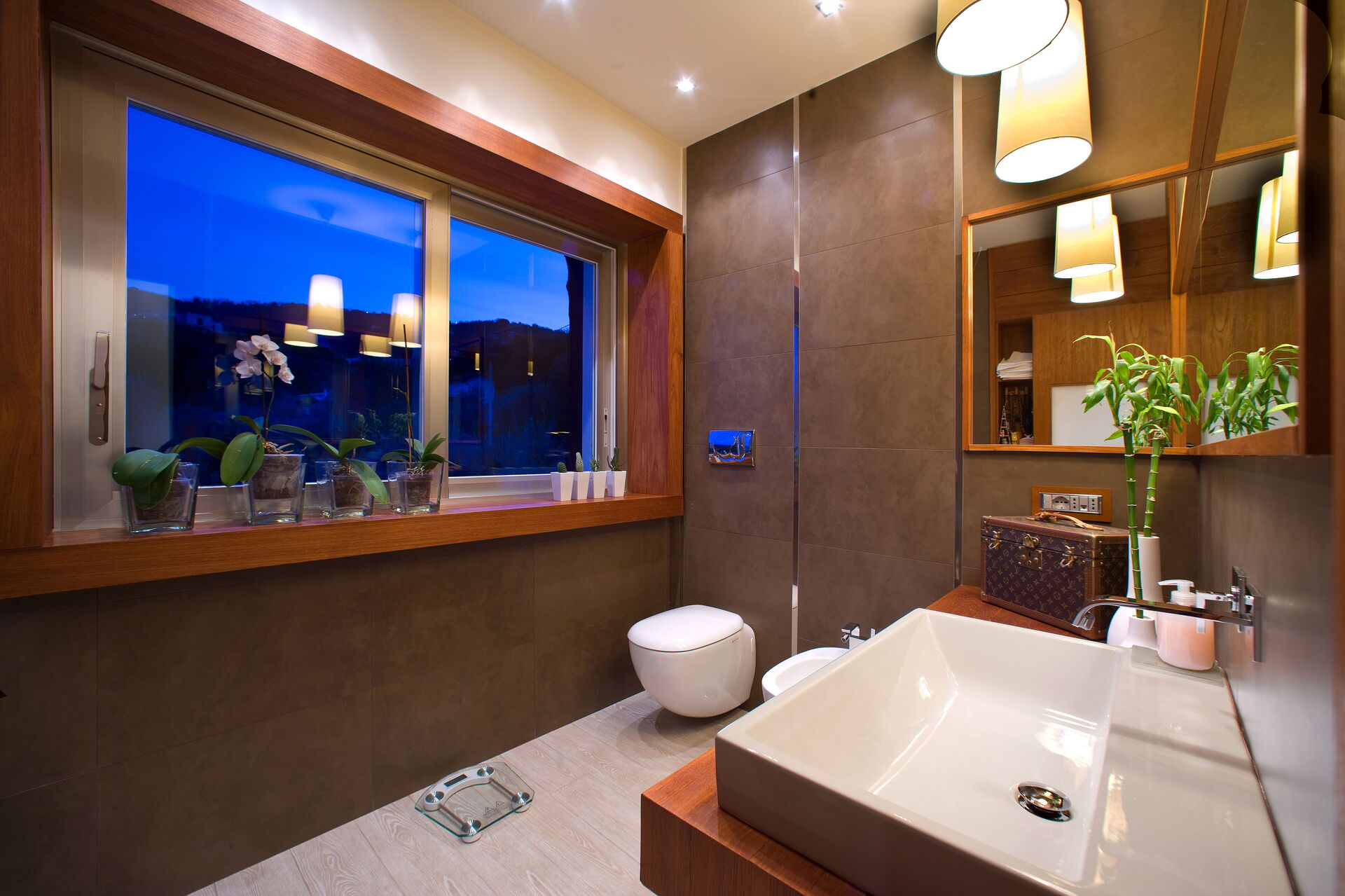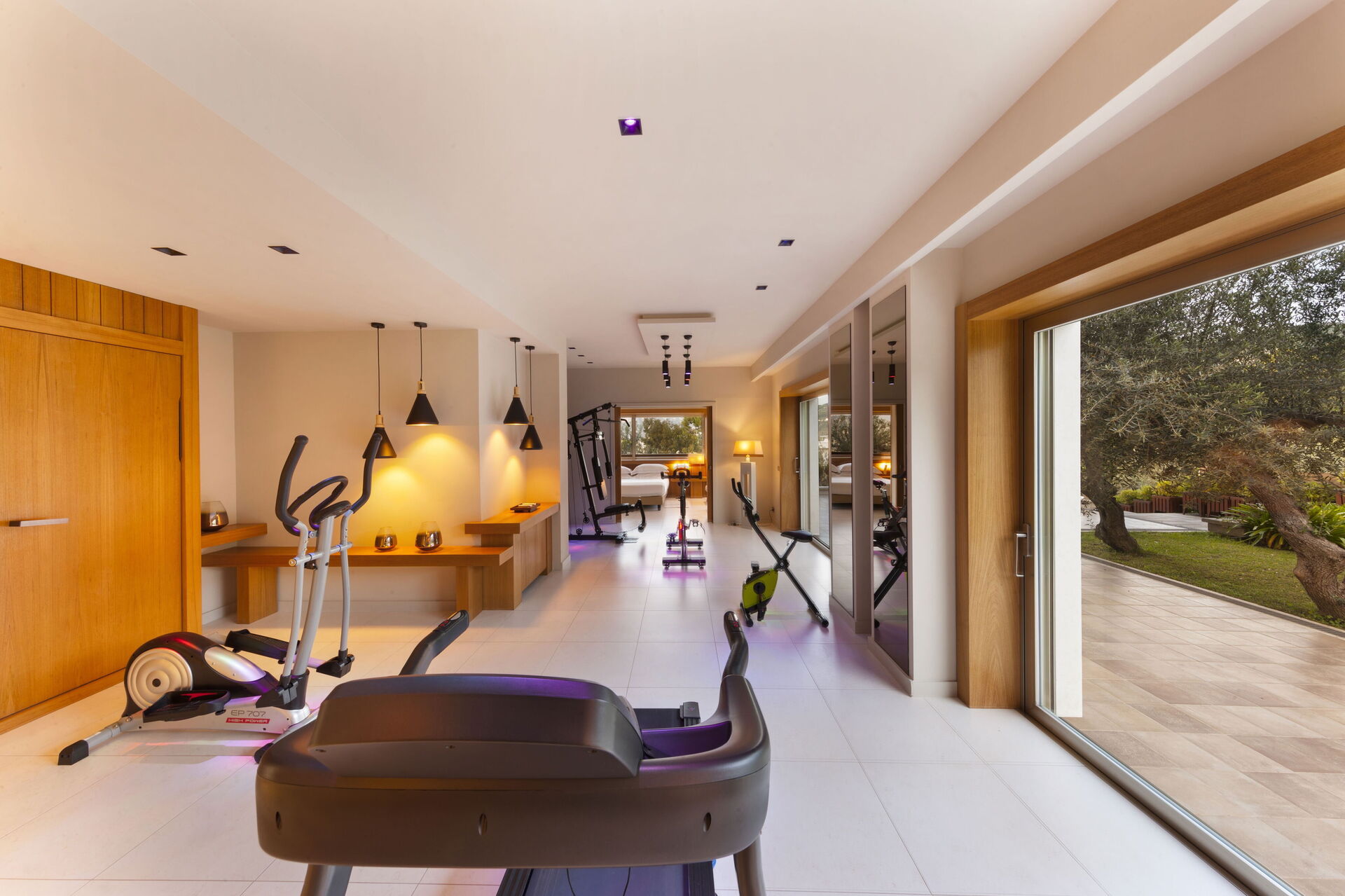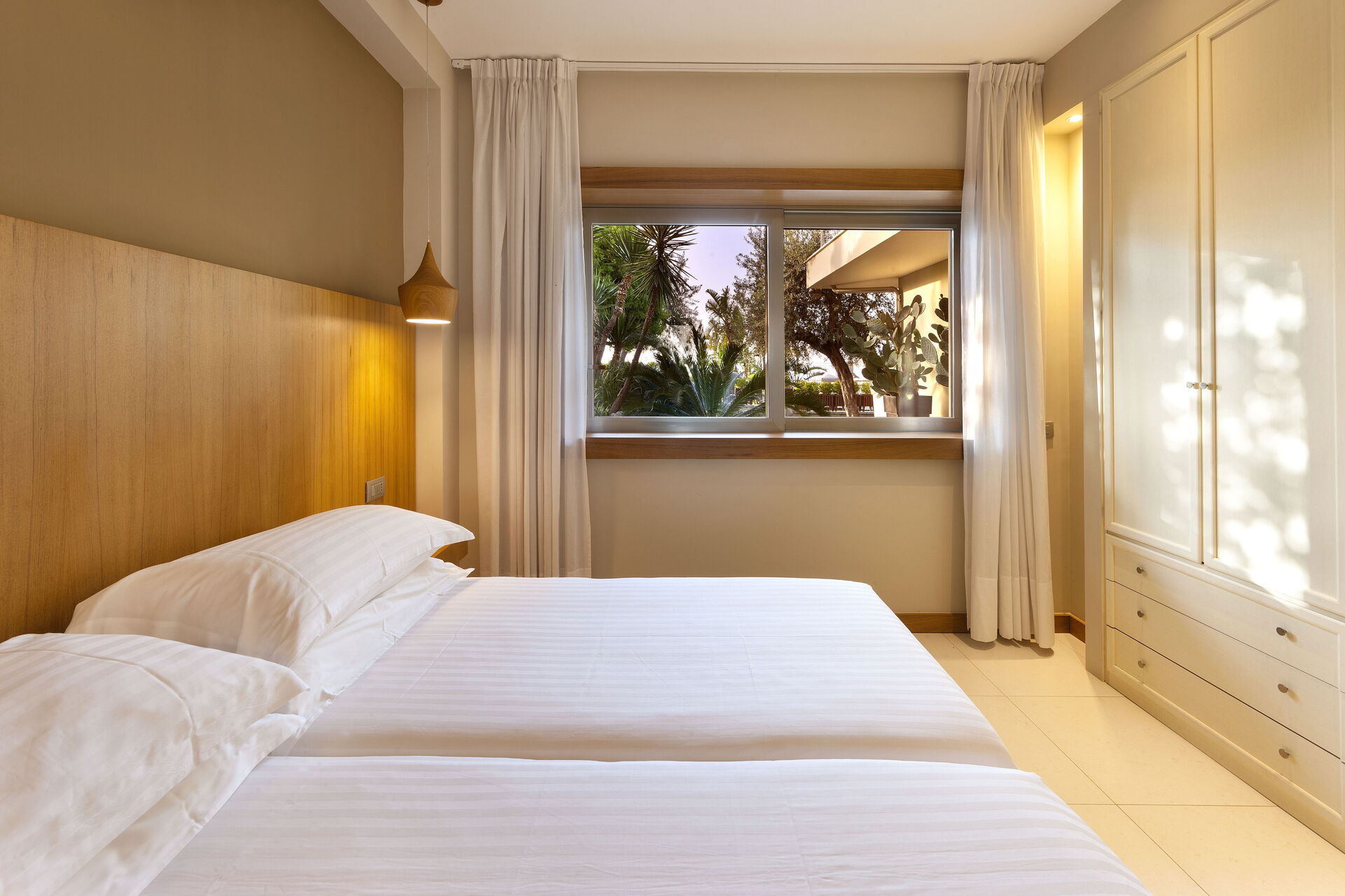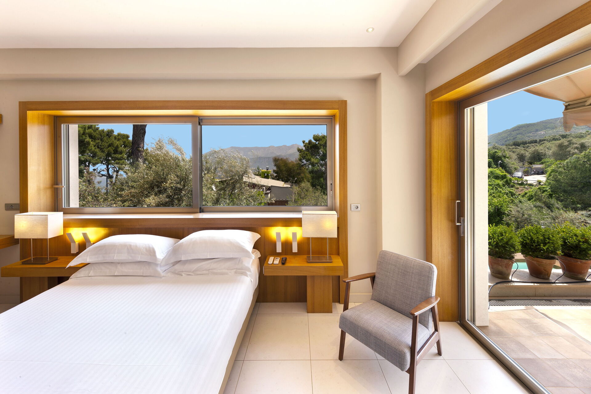 Schlafzimmer mit Bad 1: großes Doppelbett (Breite: 1.8m, Länge: 2m), WiFi Internet, Klimaanlage, TV, Schreibtisch, Safe, Whirlpool-Badewanne, Waschbecken, Doppelwaschbecken, zwei WCs, Bidet, Dusche, Fön, Rauchmelder, Ausgang auf die Terrasse.