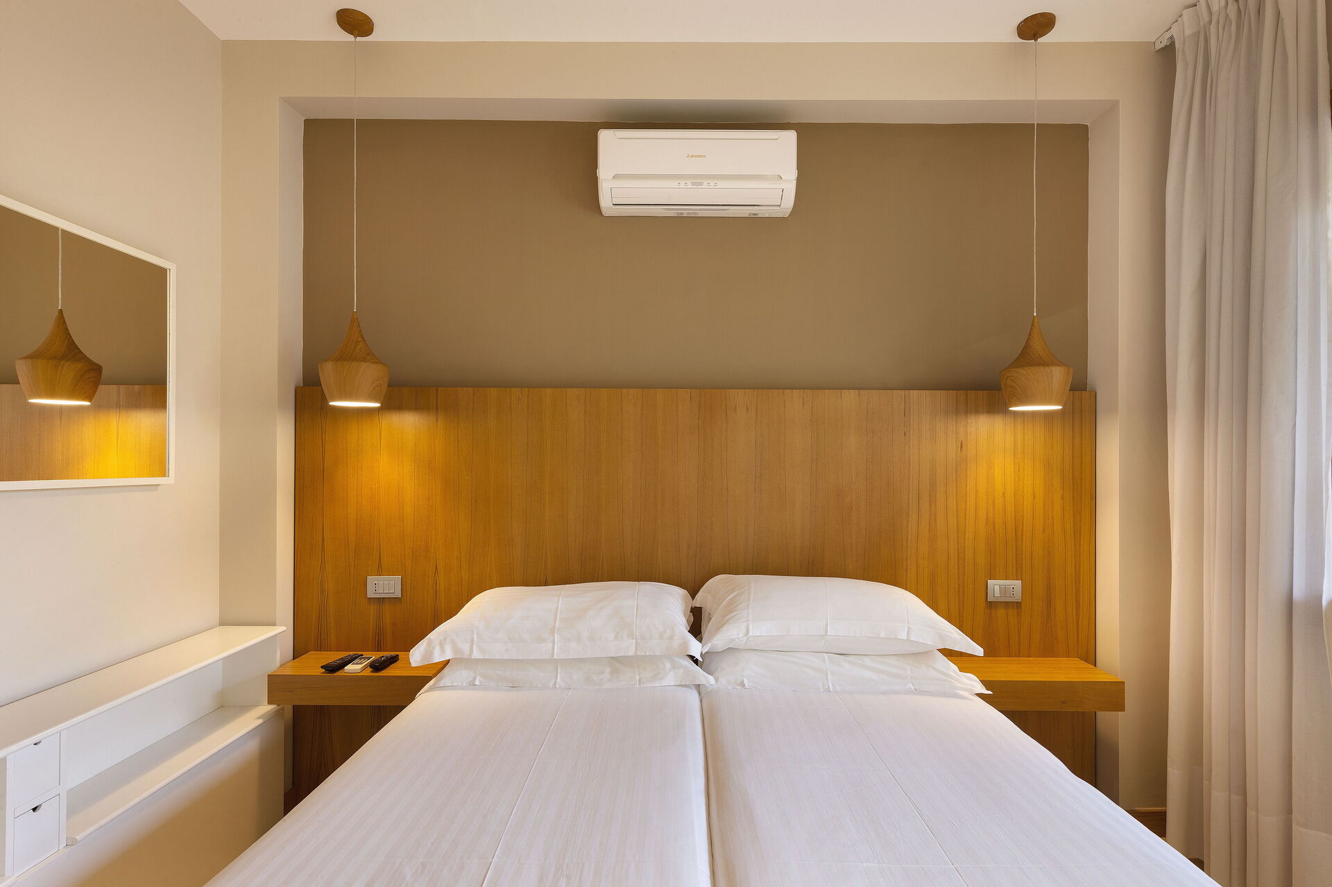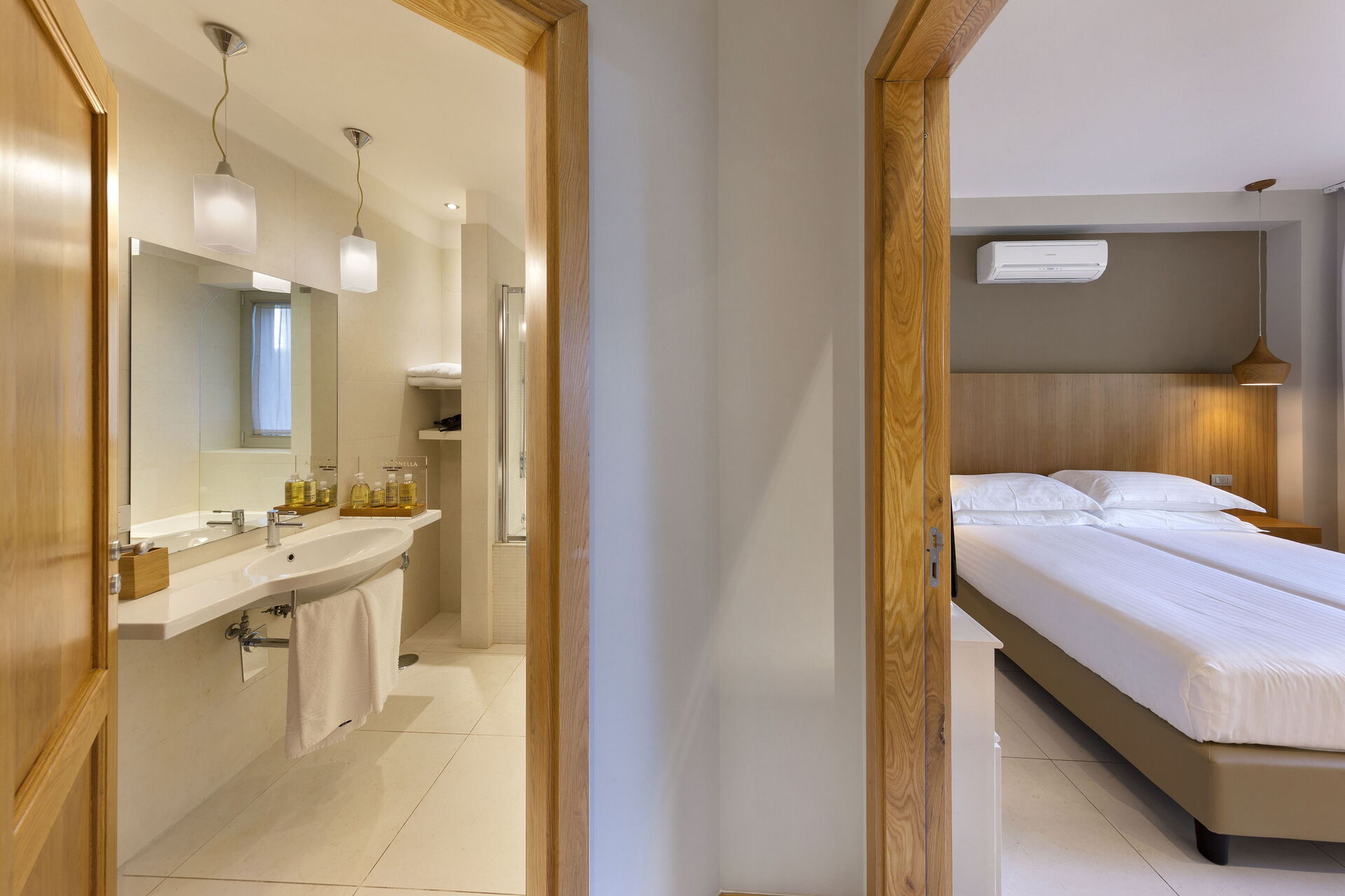 Schlafzimmer mit Bad 6: großes Doppelbett (Breite: 1.8m, Länge: 2m), Krippe, WiFi Internet, Klimaanlage, TV, Waschbecken, WC, Dusche, Fön.
