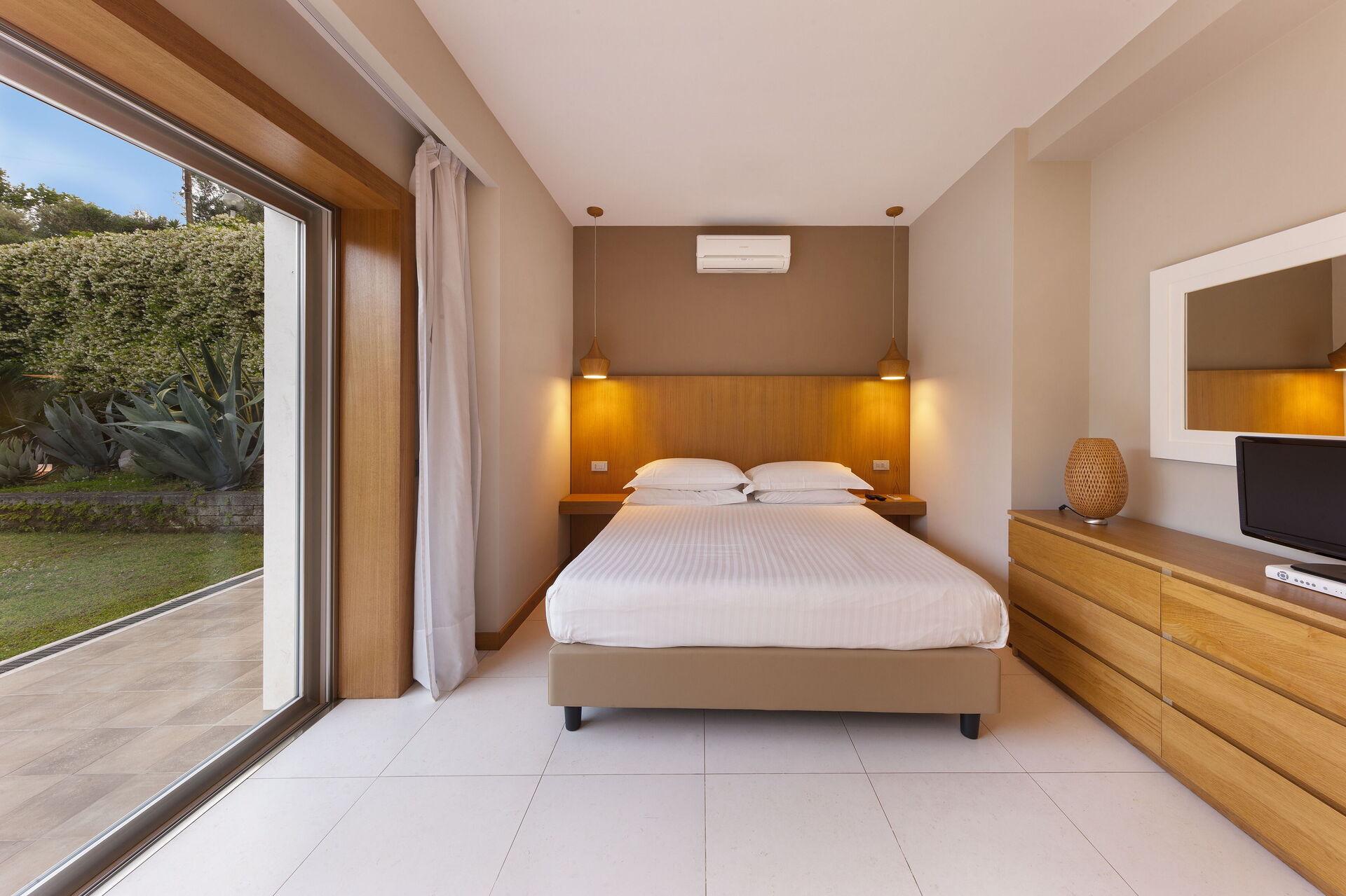 Schlafzimmer mit Bad 4: großes Doppelbett (Breite: 1.8m, Länge: 2m), WiFi Internet, Klimaanlage, TV, Sessel, Schreibtisch, Waschbecken, WC, Bidet, Dusche, Fön, Ausgang auf den Garten.