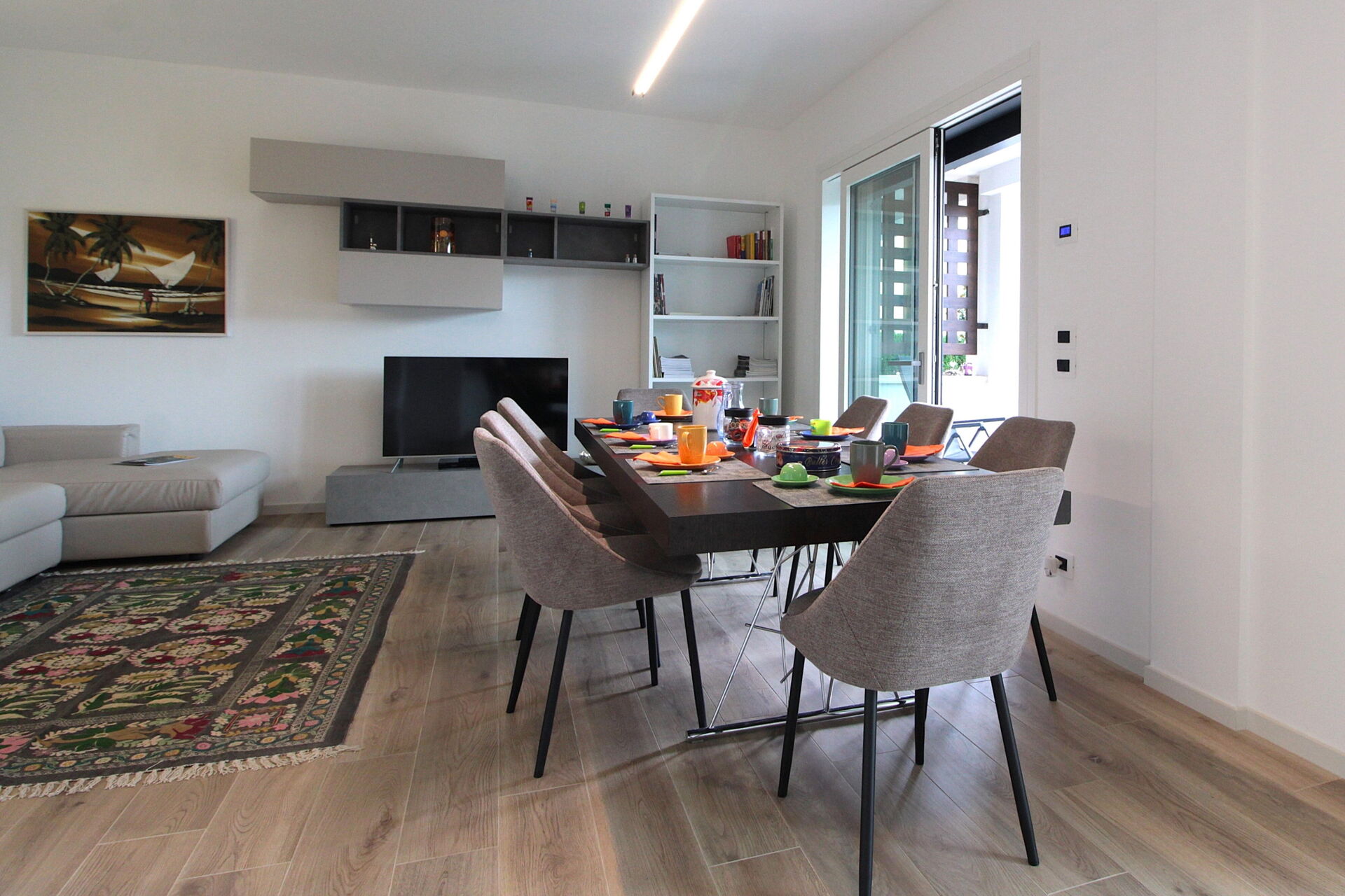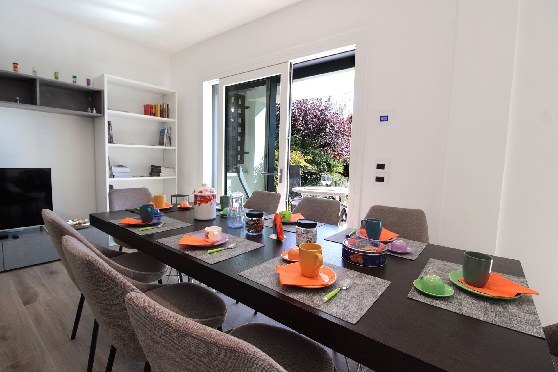 Wohnküche: gut ausgestattete Küche, Esstisch, Spülmaschine, Kühlschrank, Tiefkühler, Mikrowelle, Herd, Ofen, Italienische Kaffeemaschine, Sofa, WiFi Internet, Klimaanlage, TV, Ausgang auf den Garten.