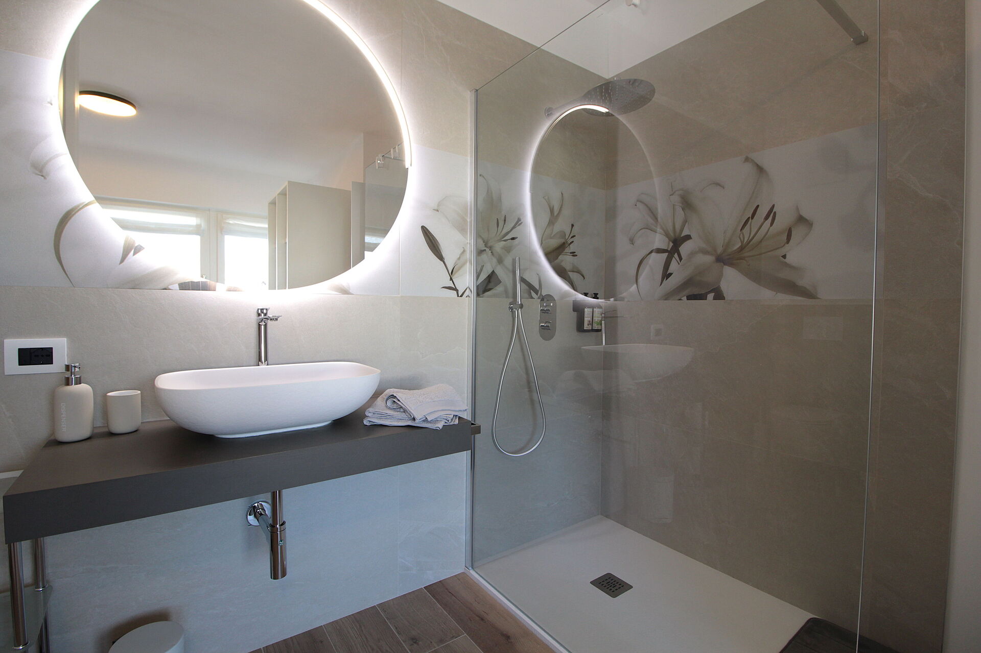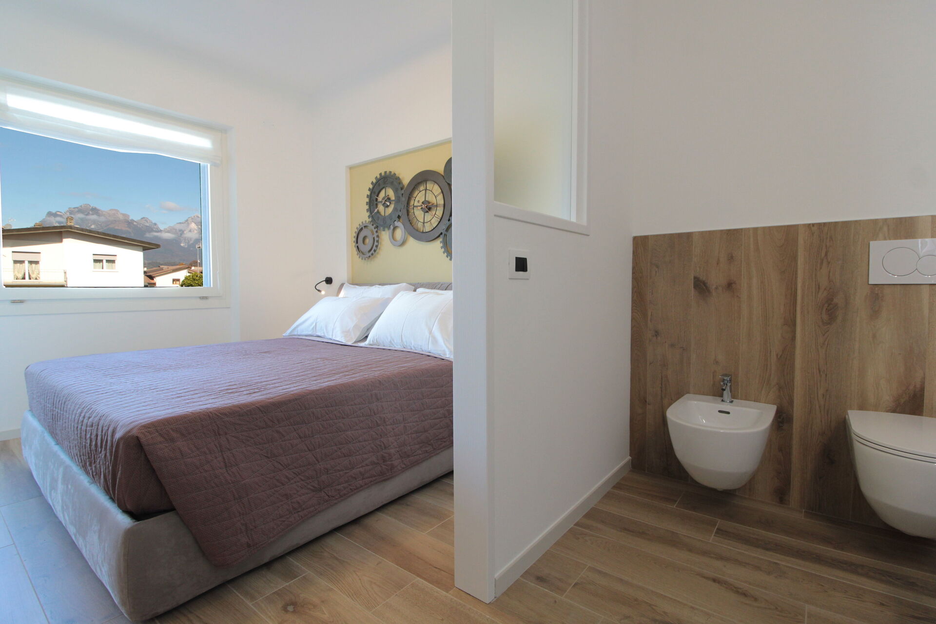 Schlafzimmer mit Bad: Doppelbett, WiFi Internet, Klimaanlage, behindertengerecht, Waschbecken, WC, Bidet, Dusche, Fön.