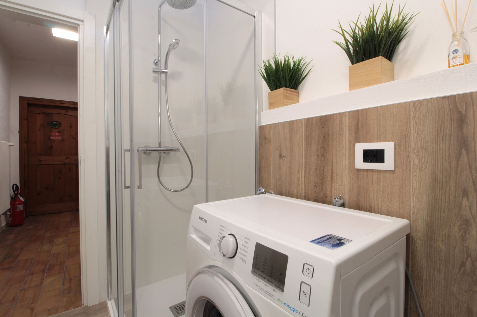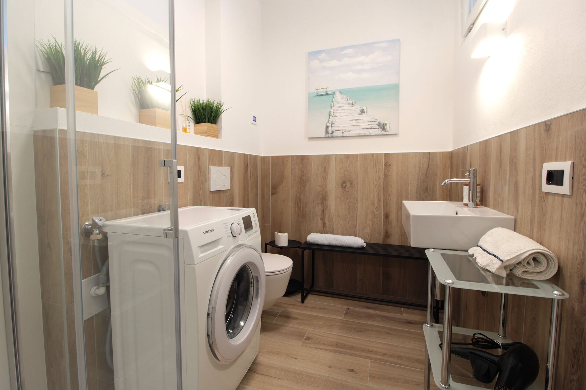 Badezimmer: Waschbecken, WC, Dusche, Fön, Waschmaschine, WiFi Internet.