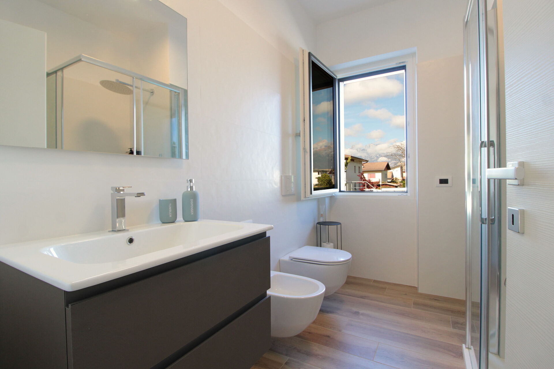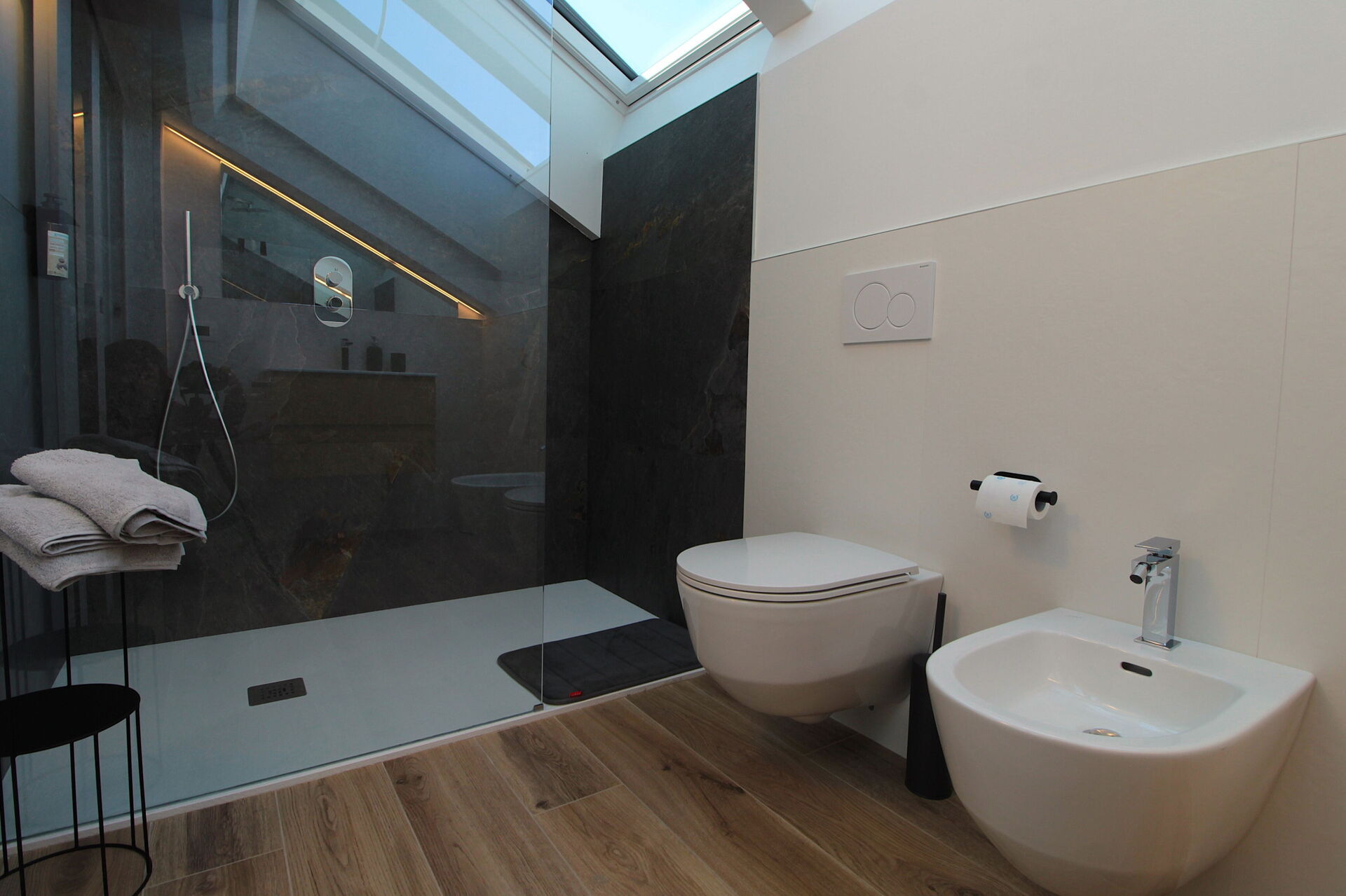 Badezimmer: Waschbecken, WC, Bidet, Dusche, Fön, WiFi Internet.