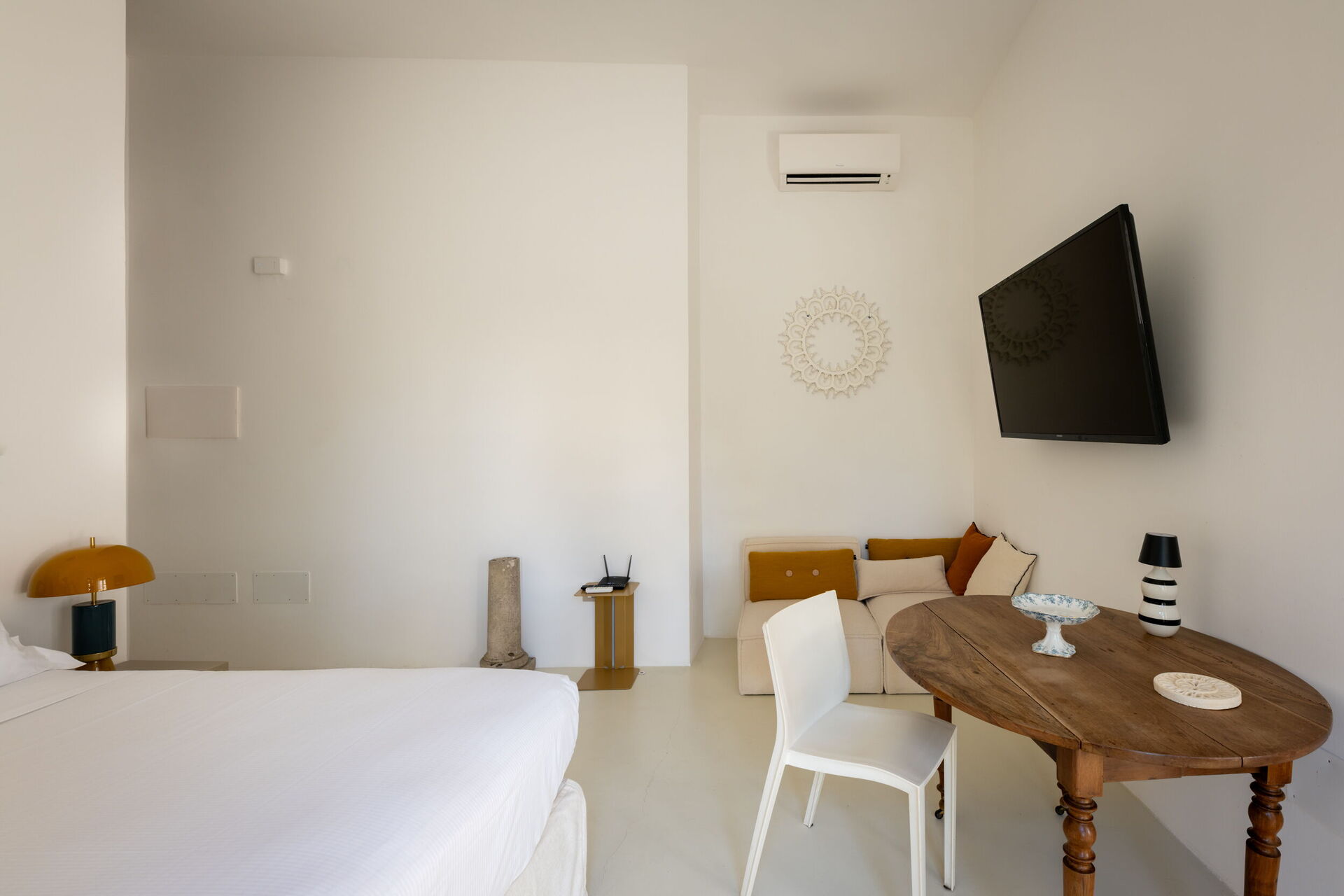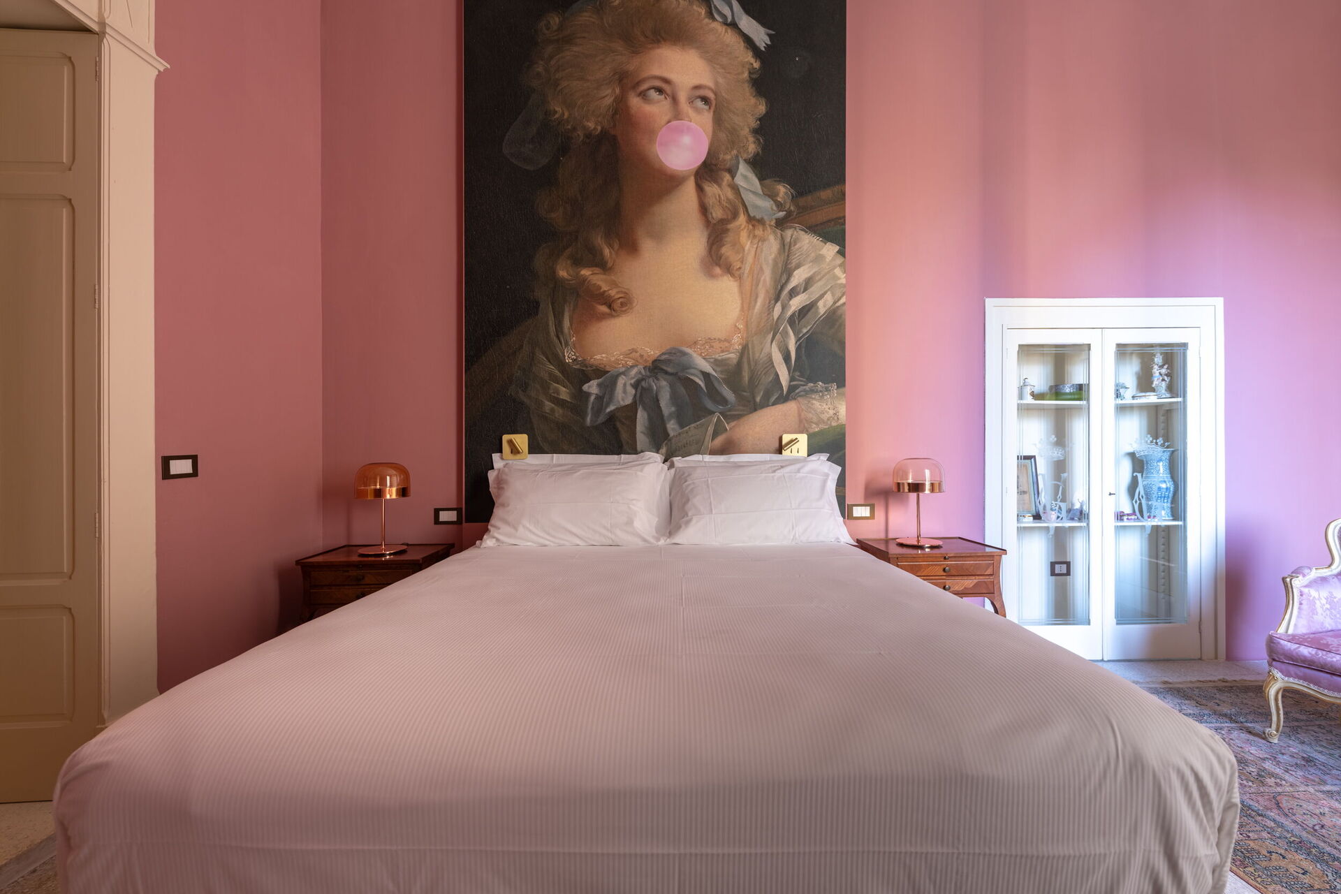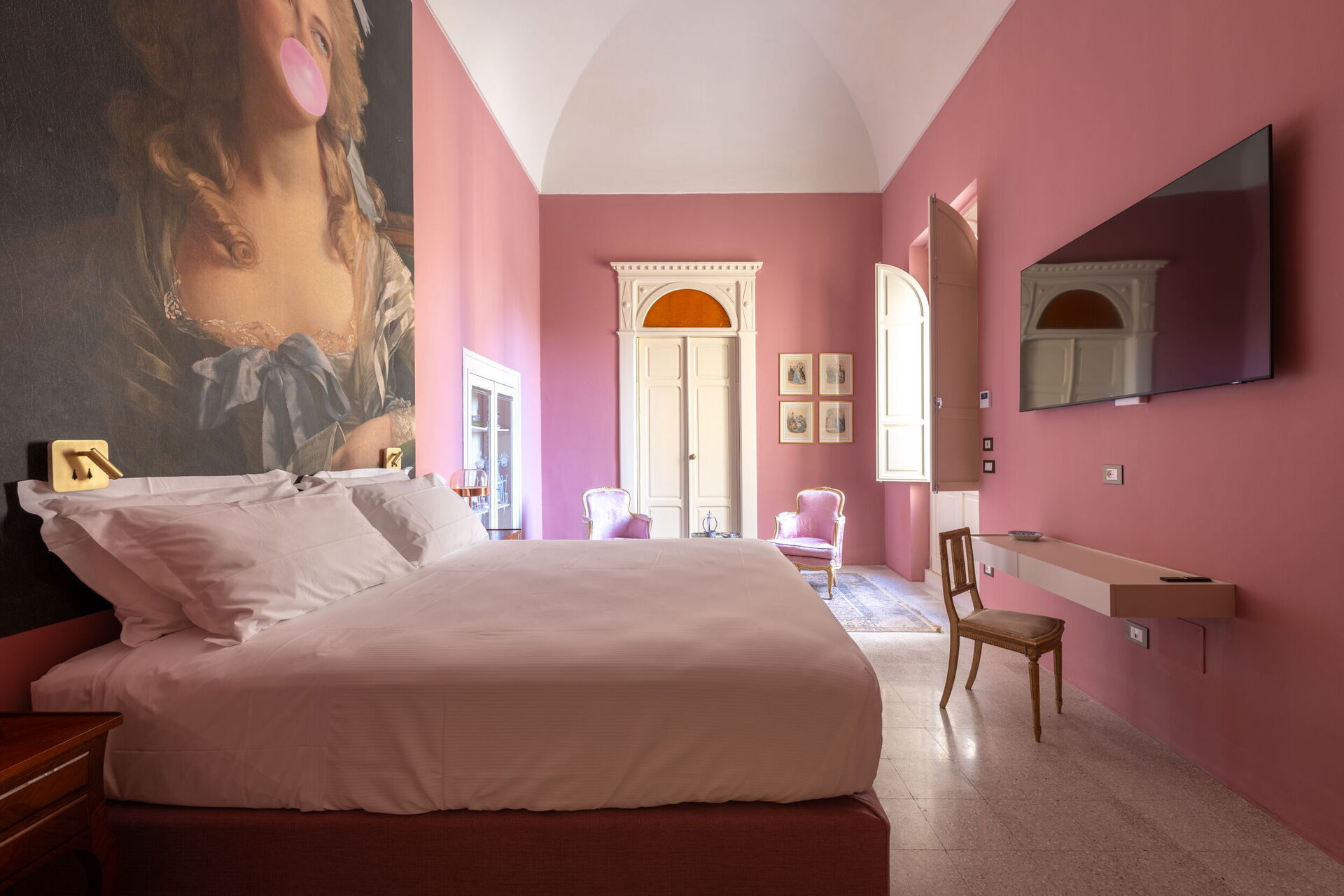 Der erste Stock, der repräsentative Bereich des Gebäudes, ist in zwei Flügel unterteilt. Der erste umfasst das Bubble Apartment mit zwei Doppelzimmern, zwei Badezimmern, einem Wohnzimmer mit Schlafsofa, einer ausgestatteten Küche mit Blick auf ein großes Wohnzimmer mit Essbereich und einer Terrasse. Der zweite Flügel bietet die Royal Suite mit einem Hauptschlafzimmer, das mit einer Nespresso-Maschine mit Kapseln, einem Wasserkocher und einer Minibar ausgestattet ist. Die Terrasse und der Balkon mit Panoramablick auf den Garten umrahmen sowohl das Bubble Apartment als auch die Suite.