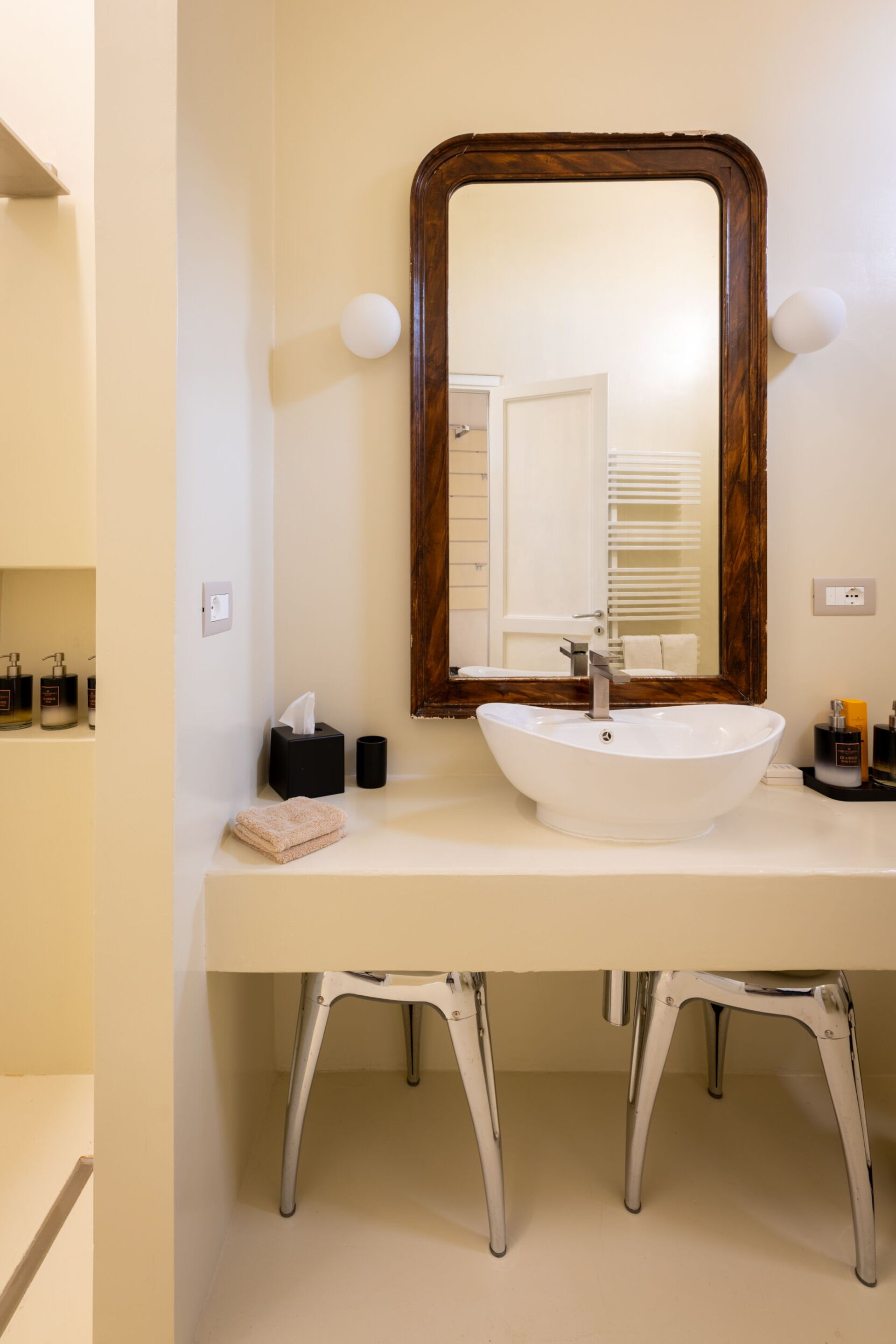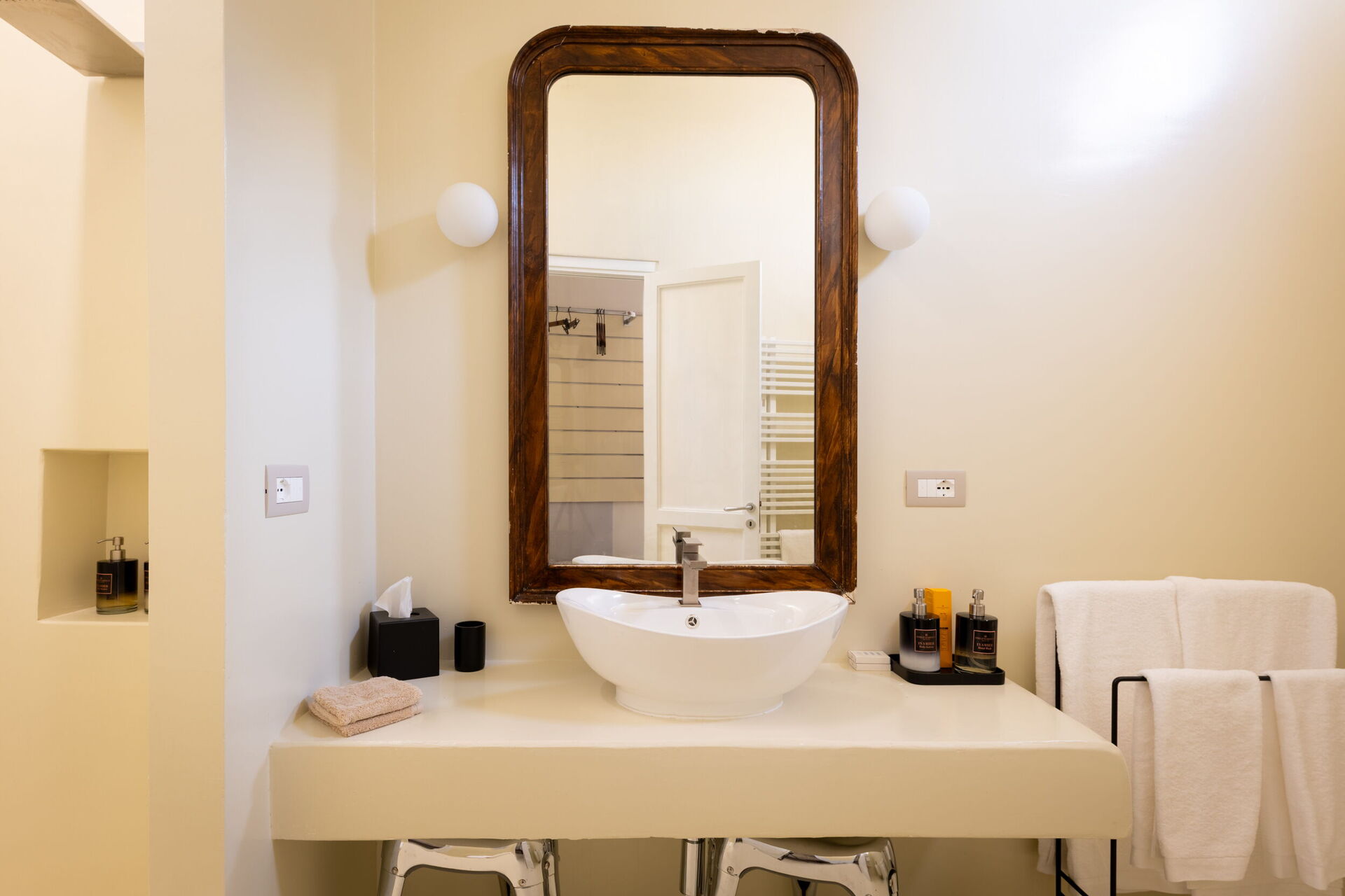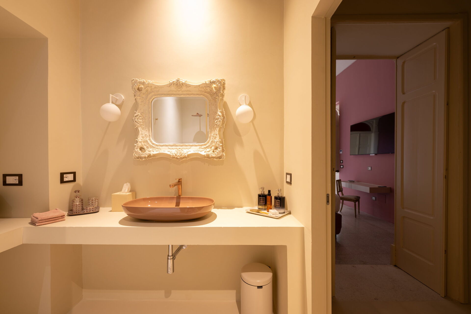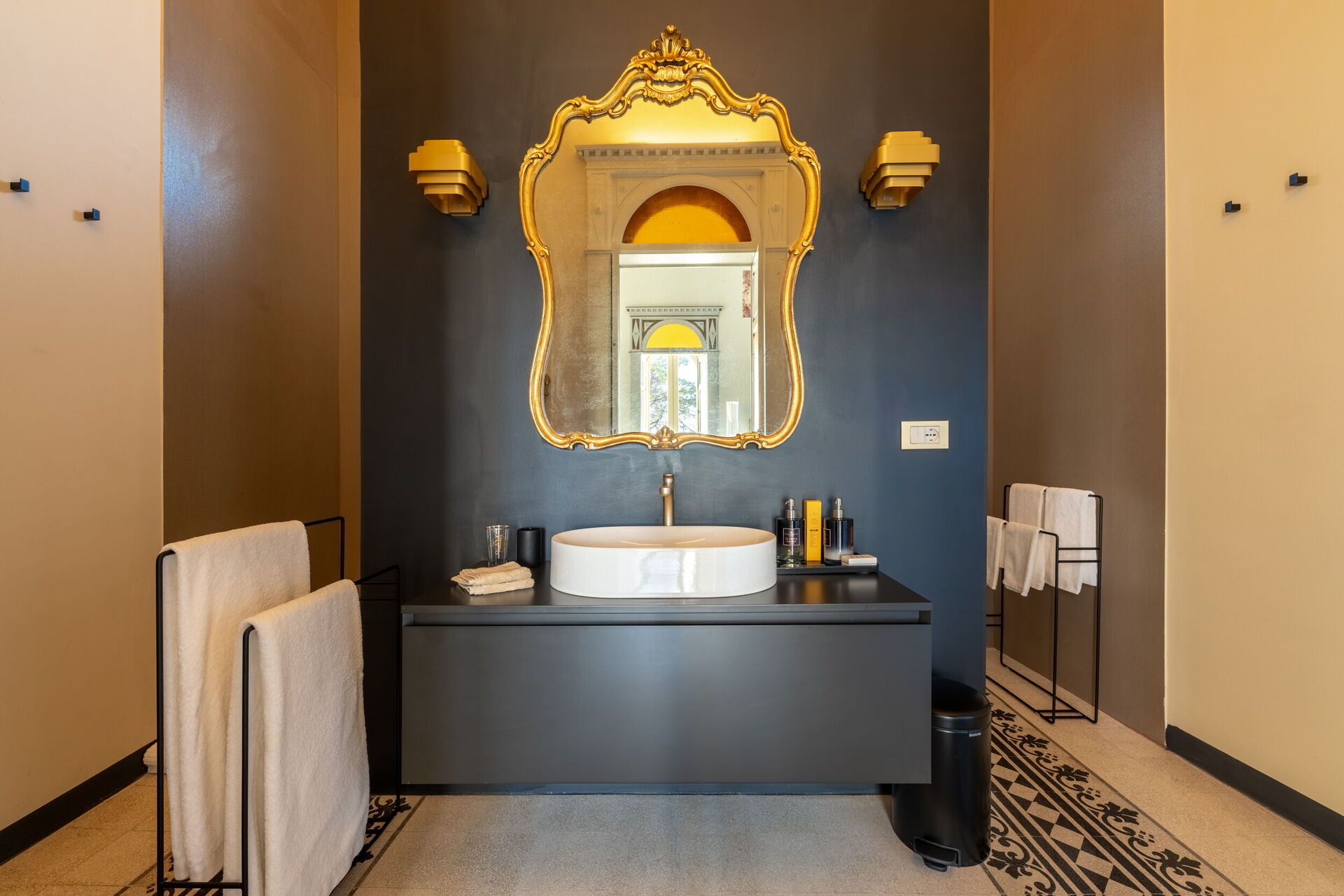 Der erste Stock, der repräsentative Bereich des Gebäudes, ist in zwei Flügel unterteilt. Der erste umfasst das Bubble Apartment mit zwei Doppelzimmern, zwei Badezimmern, einem Wohnzimmer mit Schlafsofa, einer ausgestatteten Küche mit Blick auf ein großes Wohnzimmer mit Essbereich und einer Terrasse. Der zweite Flügel bietet die Royal Suite mit einem Hauptschlafzimmer, das mit einer Nespresso-Maschine mit Kapseln, einem Wasserkocher und einer Minibar ausgestattet ist. Die Terrasse und der Balkon mit Panoramablick auf den Garten umrahmen sowohl das Bubble Apartment als auch die Suite.