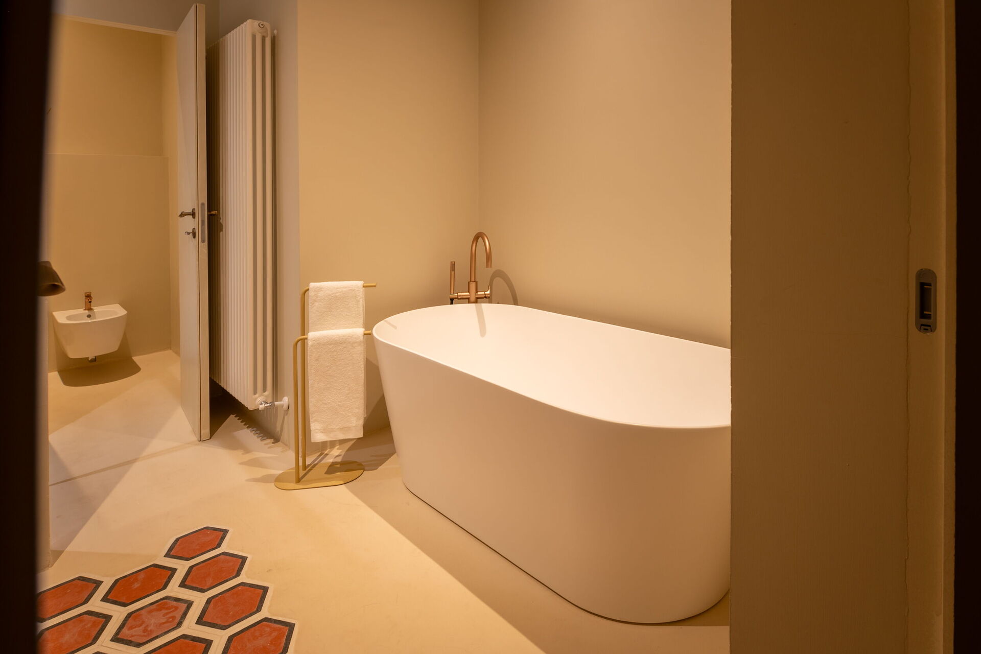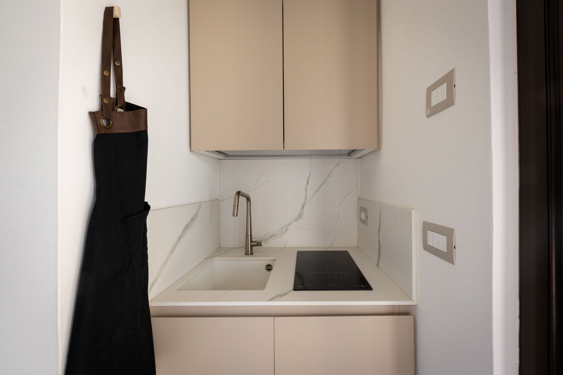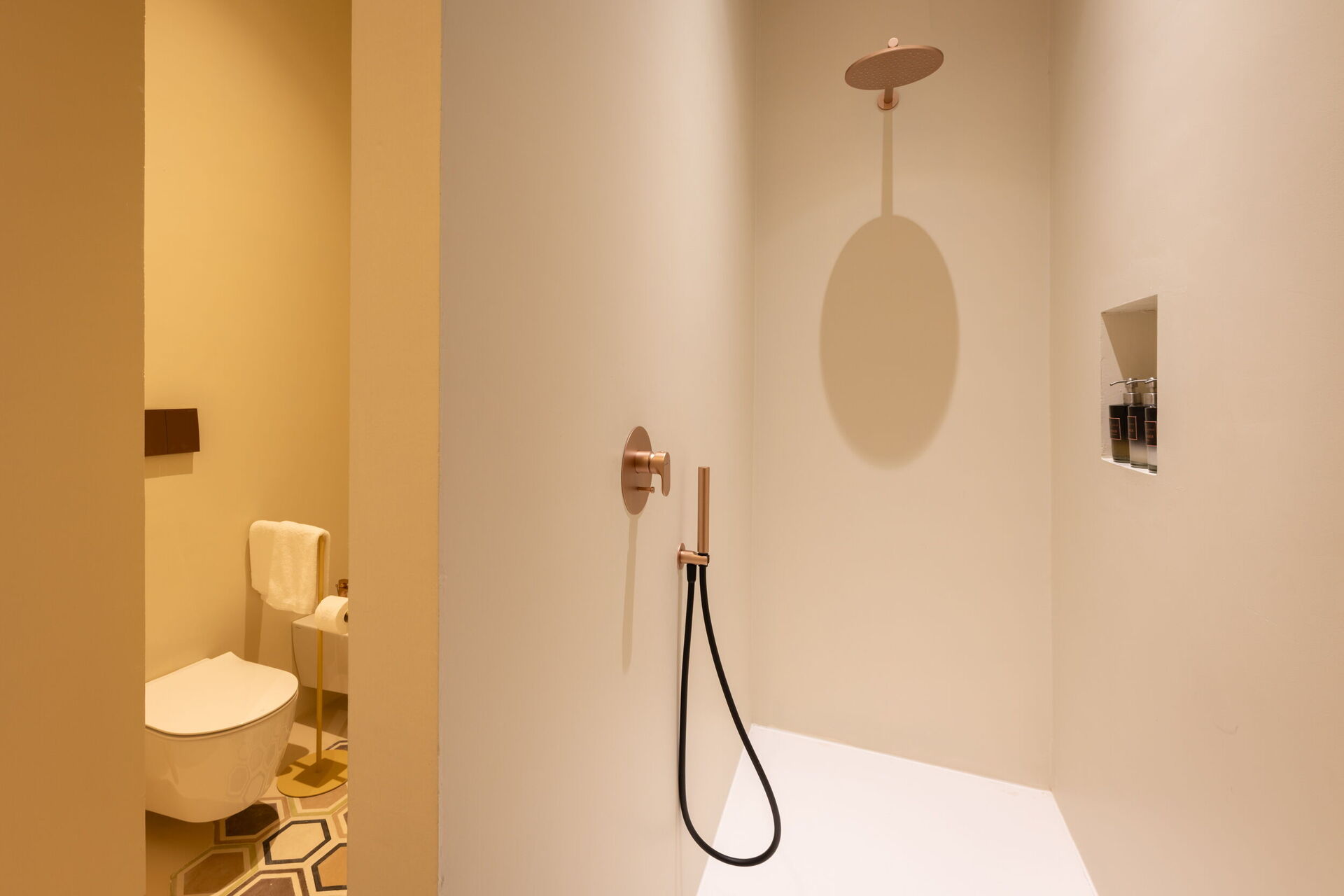 Das Erdgeschoss bietet elegante und funktionale Räume, darunter eine große Küche, einen schönen Salon mit Bürobereich und ein Gäste-WC, das als Einzelzimmer genutzt werden kann. Außerdem gibt es die Garden Suite mit Blick auf den Garten, die eine helle und entspannte Atmosphäre bietet und mit einer Nespresso-Maschine mit Kapseln, einem Wasserkocher und einer Minibar ausgestattet ist.