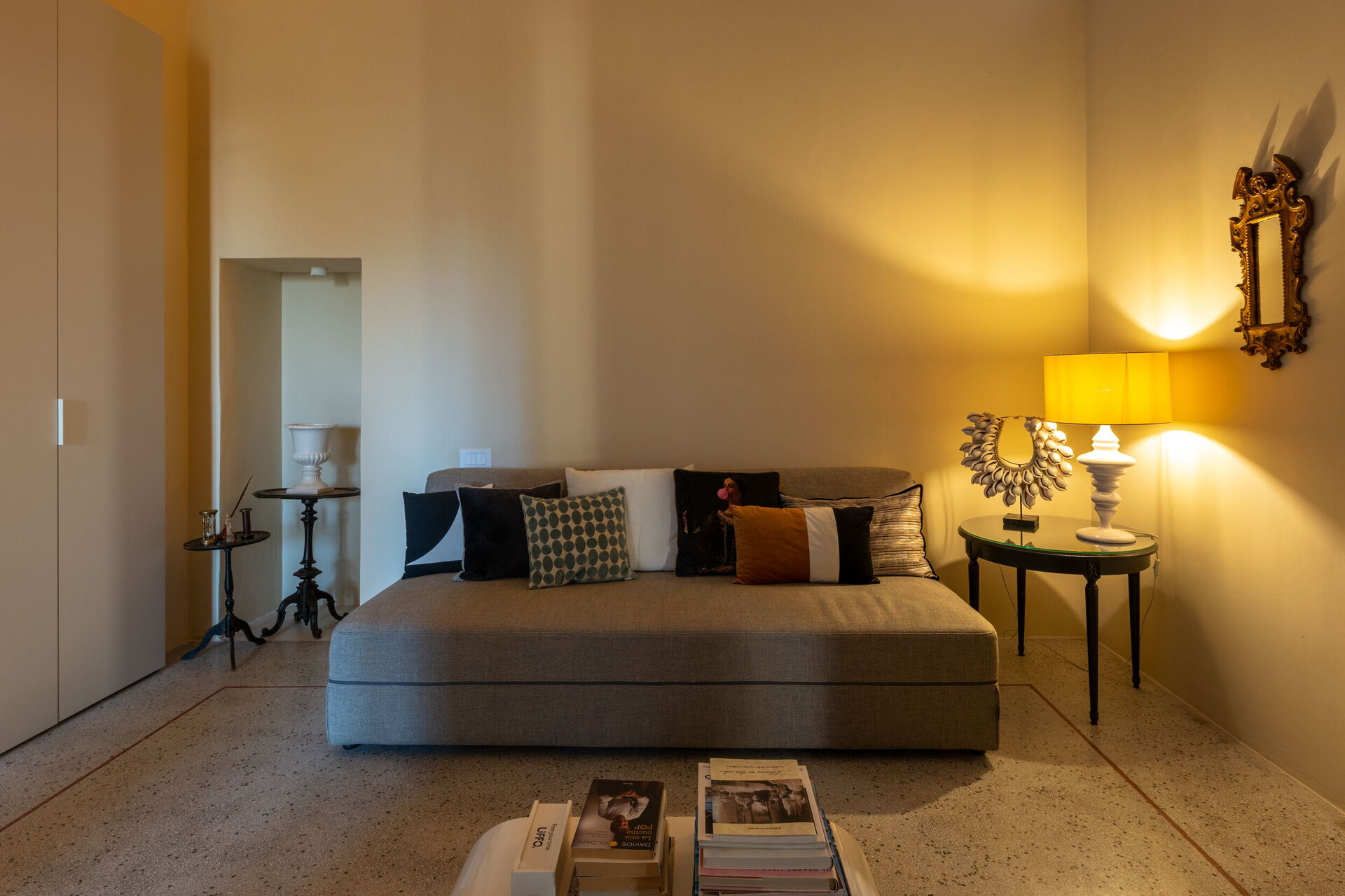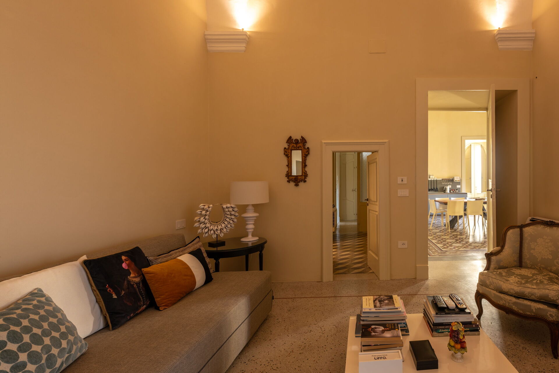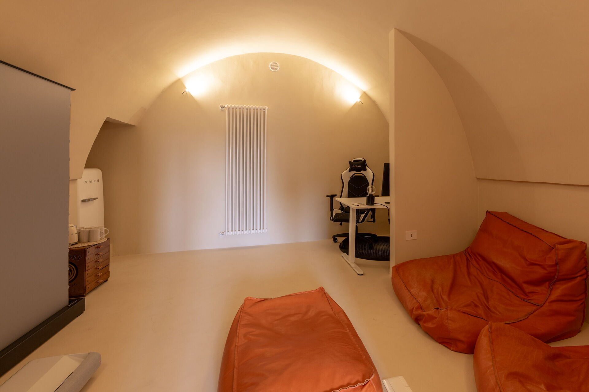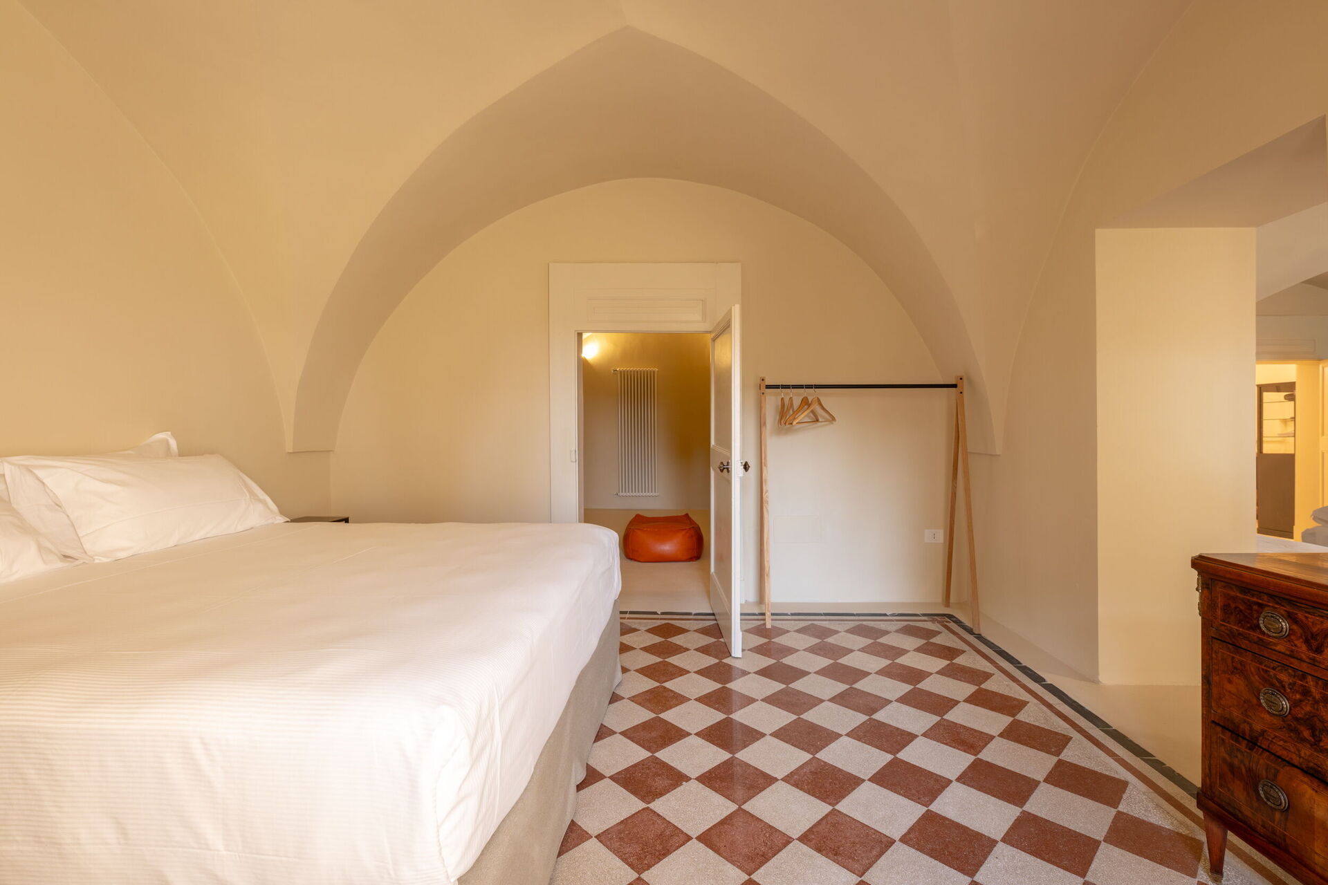 Casa 4 Venti ist ein ruhiger Rückzugsort im Herzen des Gartens, der zum stillen Lesen oder einfach zum Entspannen einlädt. Mit seinen gewölbten Steindecken und dem natürlichen Licht, das durch die großen Fenster hereinströmt, bietet dieser gemütliche Raum eine ruhige Atmosphäre, in der die Zeit langsamer vergeht und die Natur sanft Teil des Erlebnisses wird.