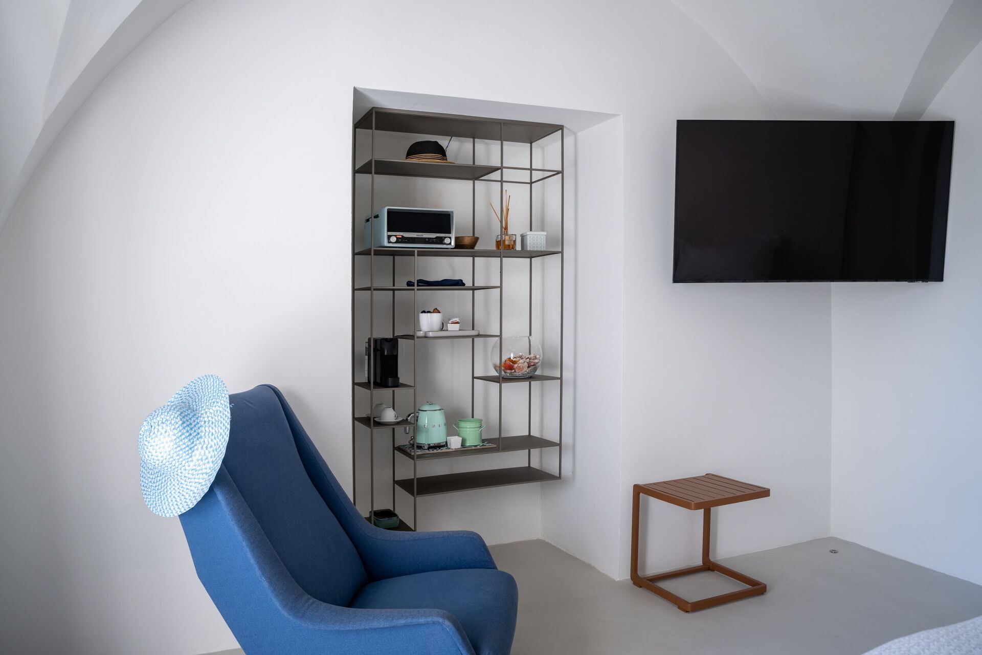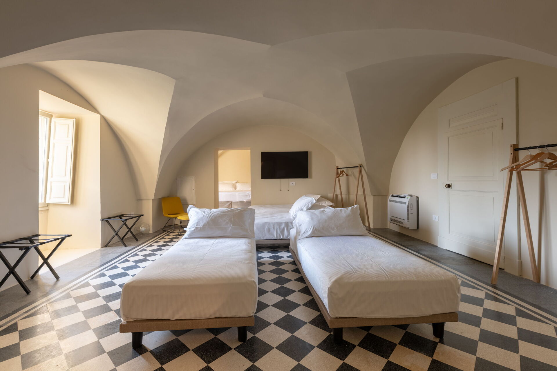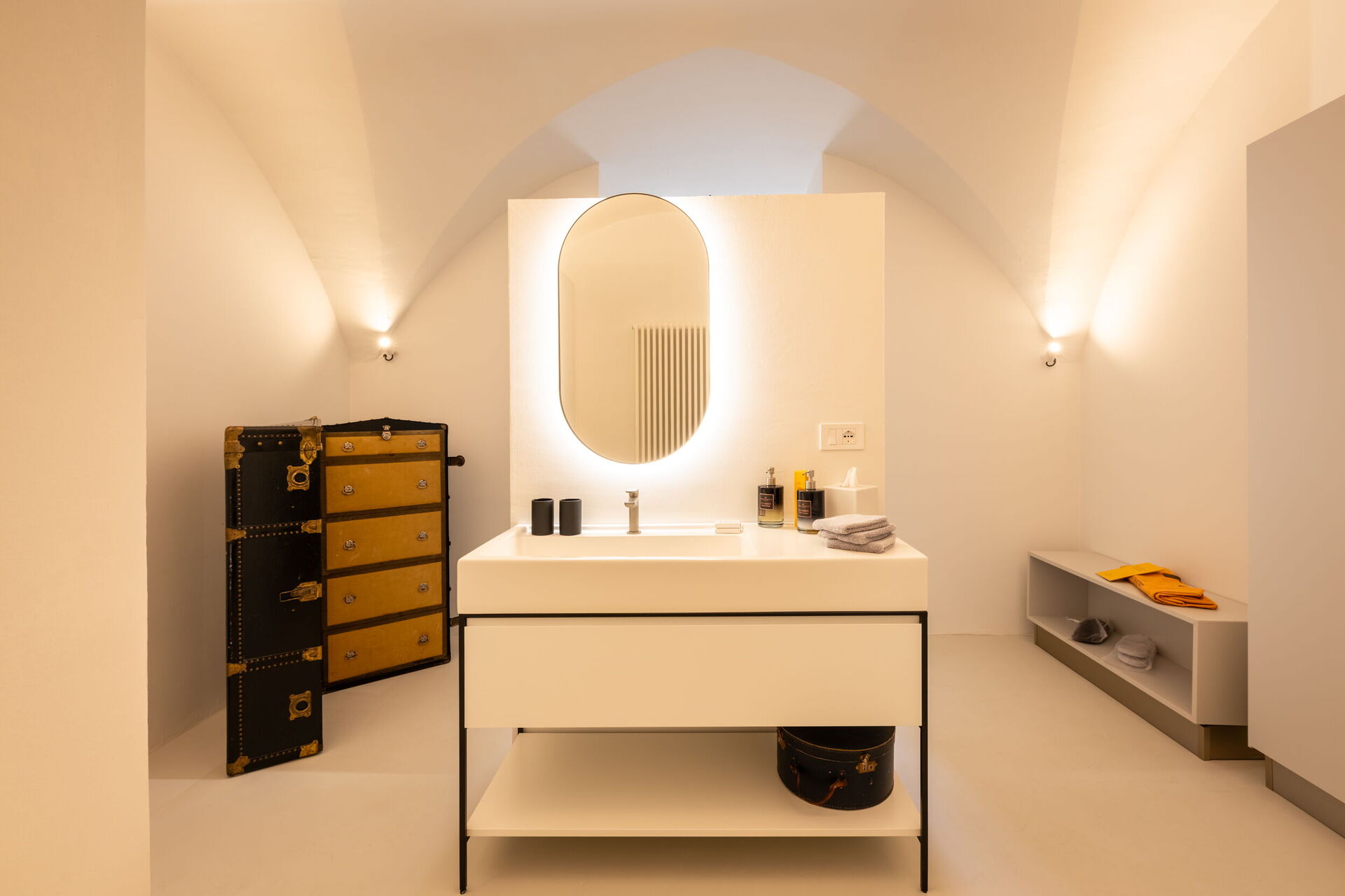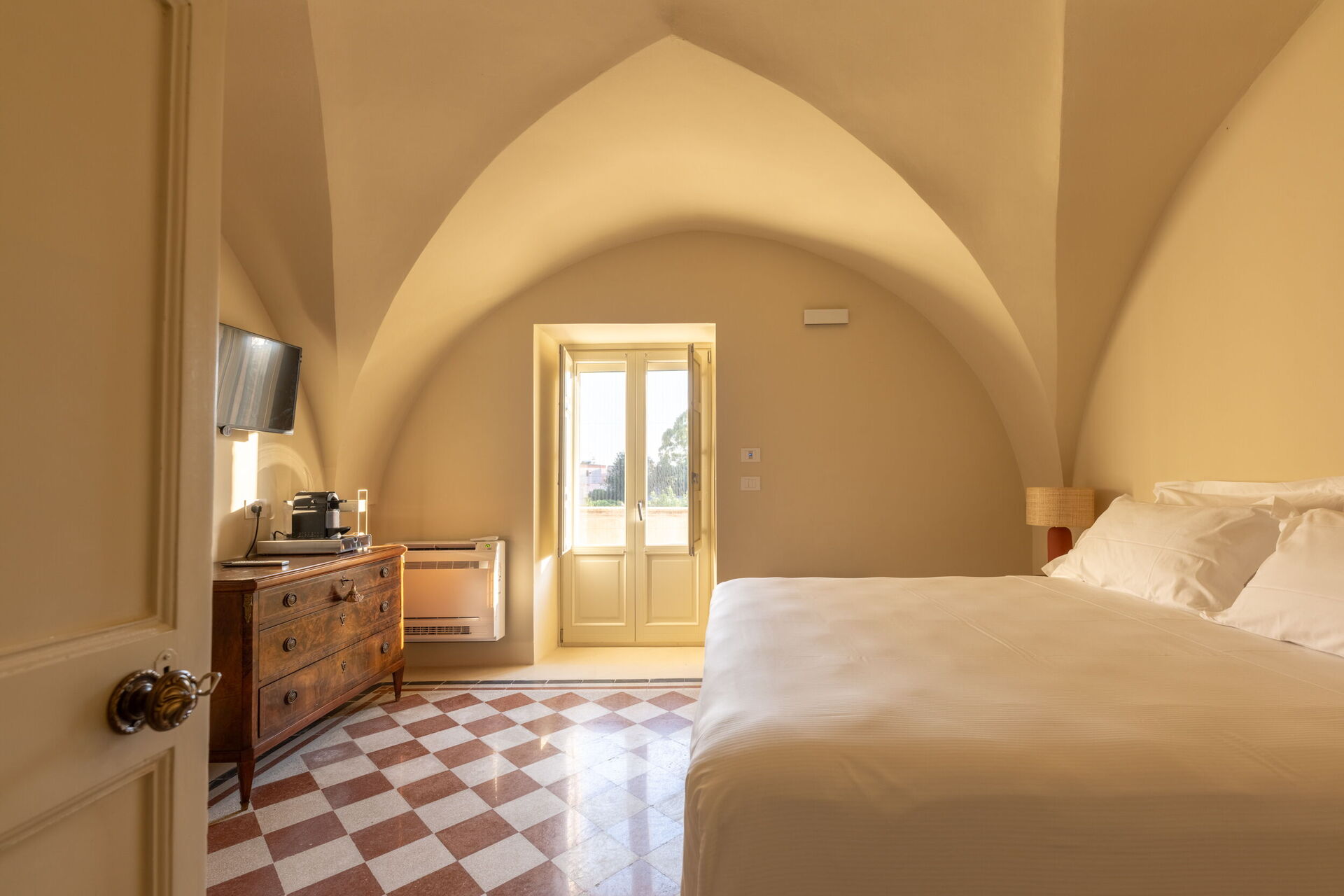 Casa 4 Venti ist ein ruhiger Rückzugsort im Herzen des Gartens, der zum stillen Lesen oder einfach zum Entspannen einlädt. Mit seinen gewölbten Steindecken und dem natürlichen Licht, das durch die großen Fenster hereinströmt, bietet dieser gemütliche Raum eine ruhige Atmosphäre, in der die Zeit langsamer vergeht und die Natur sanft Teil des Erlebnisses wird.