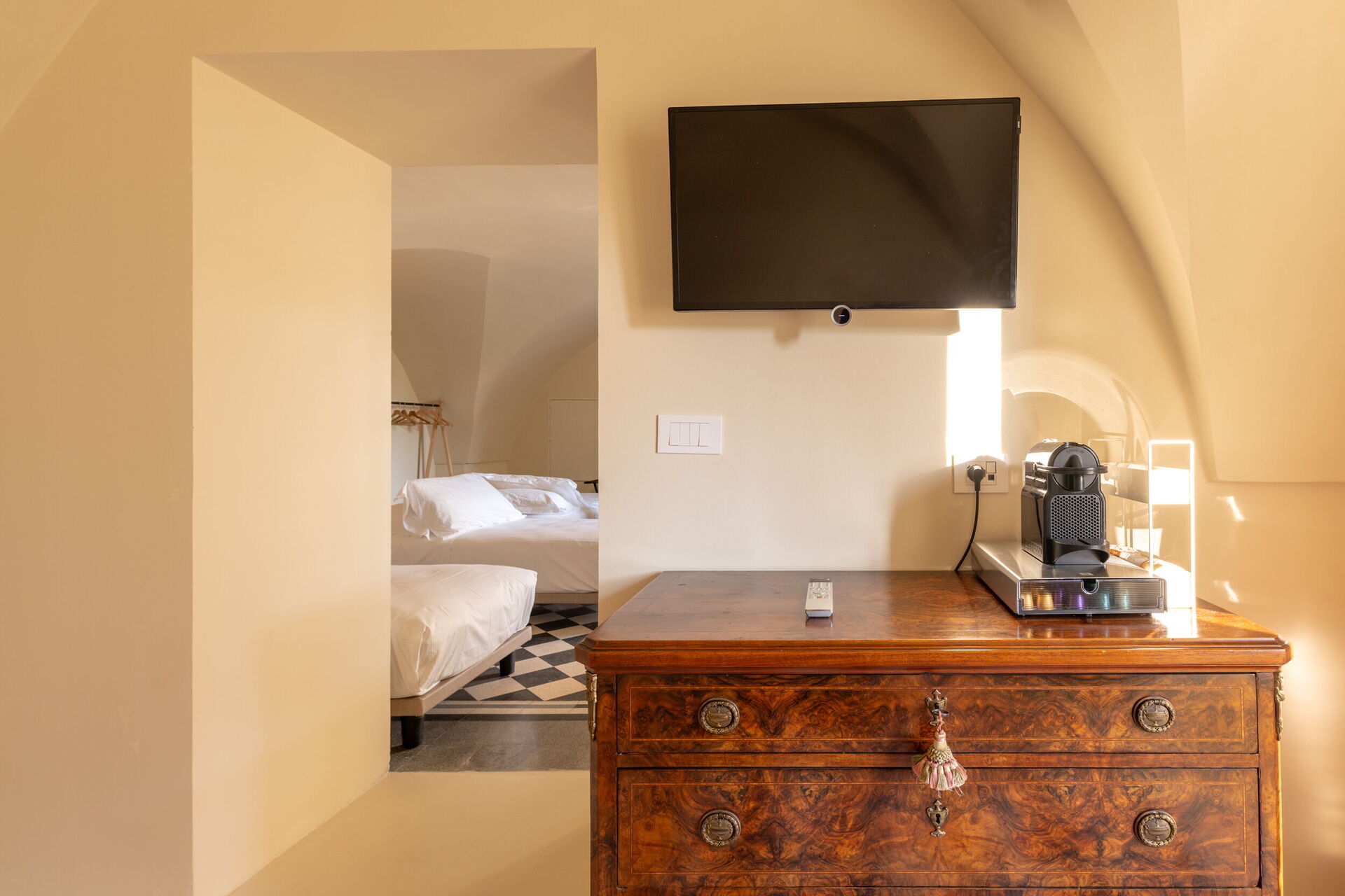 Im Zwischengeschoss (Mezzanine) befindet sich die Family Suite, ideal für bis zu sechs Erwachsene, mit zwei Schlafzimmern, zwei Badezimmern und einem gemütlichen Kino- und Spielzimmer mit 100-Zoll-Bildschirm, 4K-Projektor und PlayStation 5. Auch hier finden wir eine Nespresso-Maschine mit Kapseln, Wasserkocher und Kühlschrank.