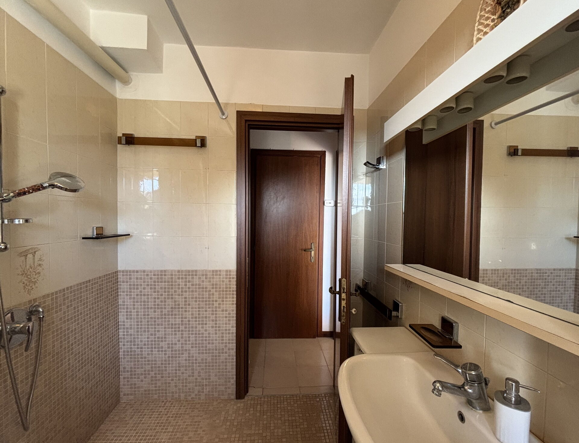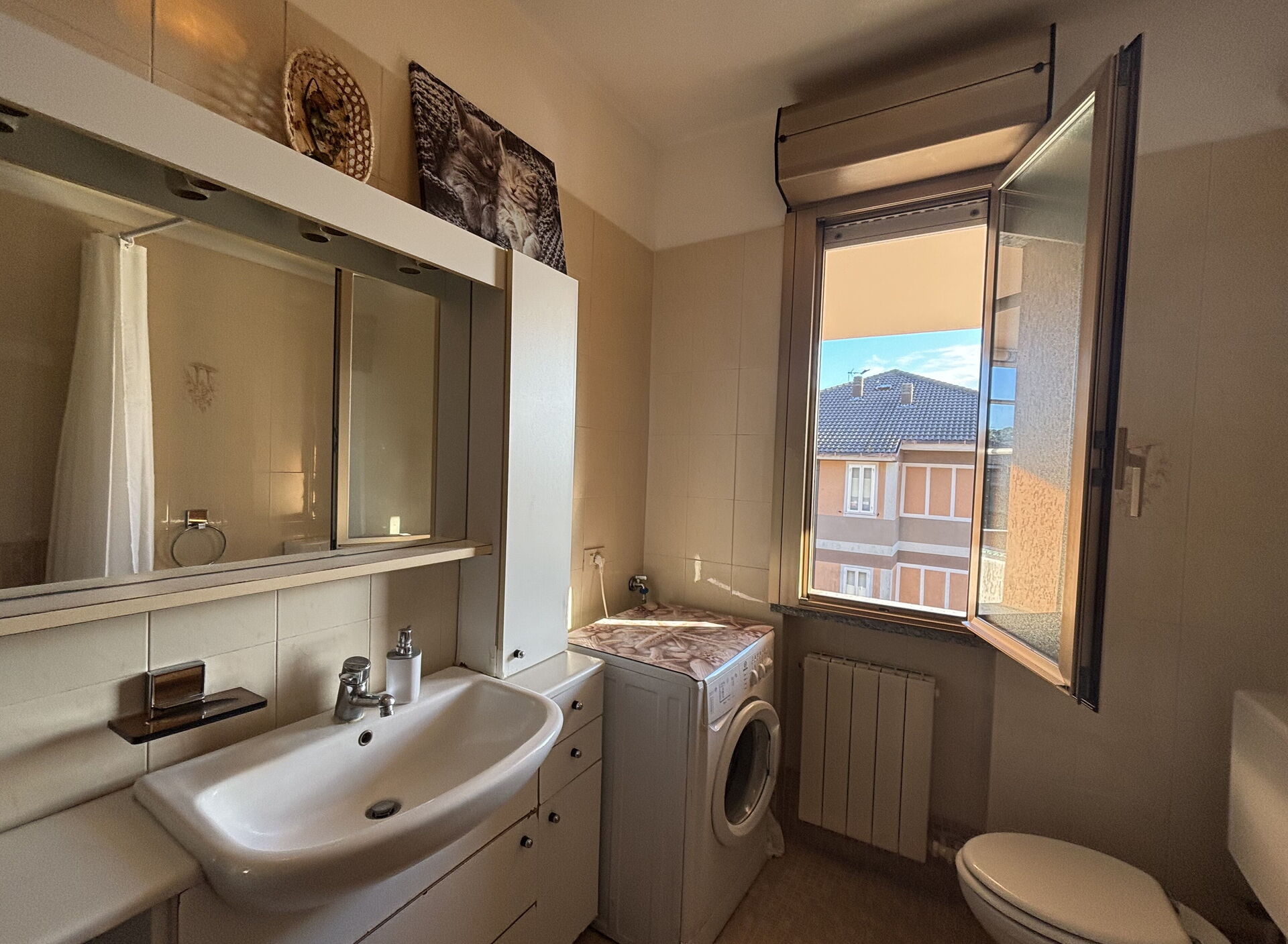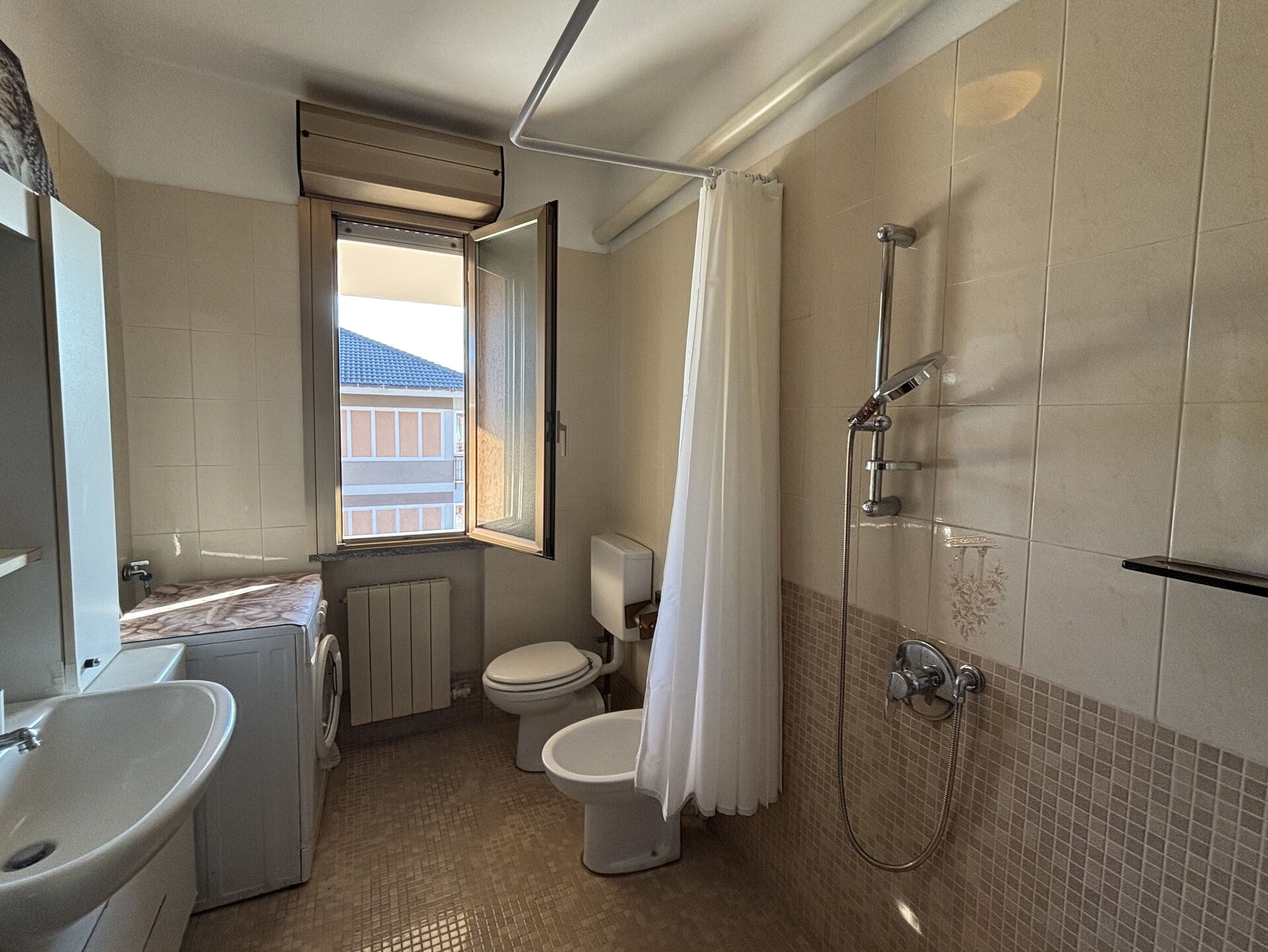 Badezimmer: Waschbecken, WC, Bidet, Dusche, Fön, Waschmaschine.