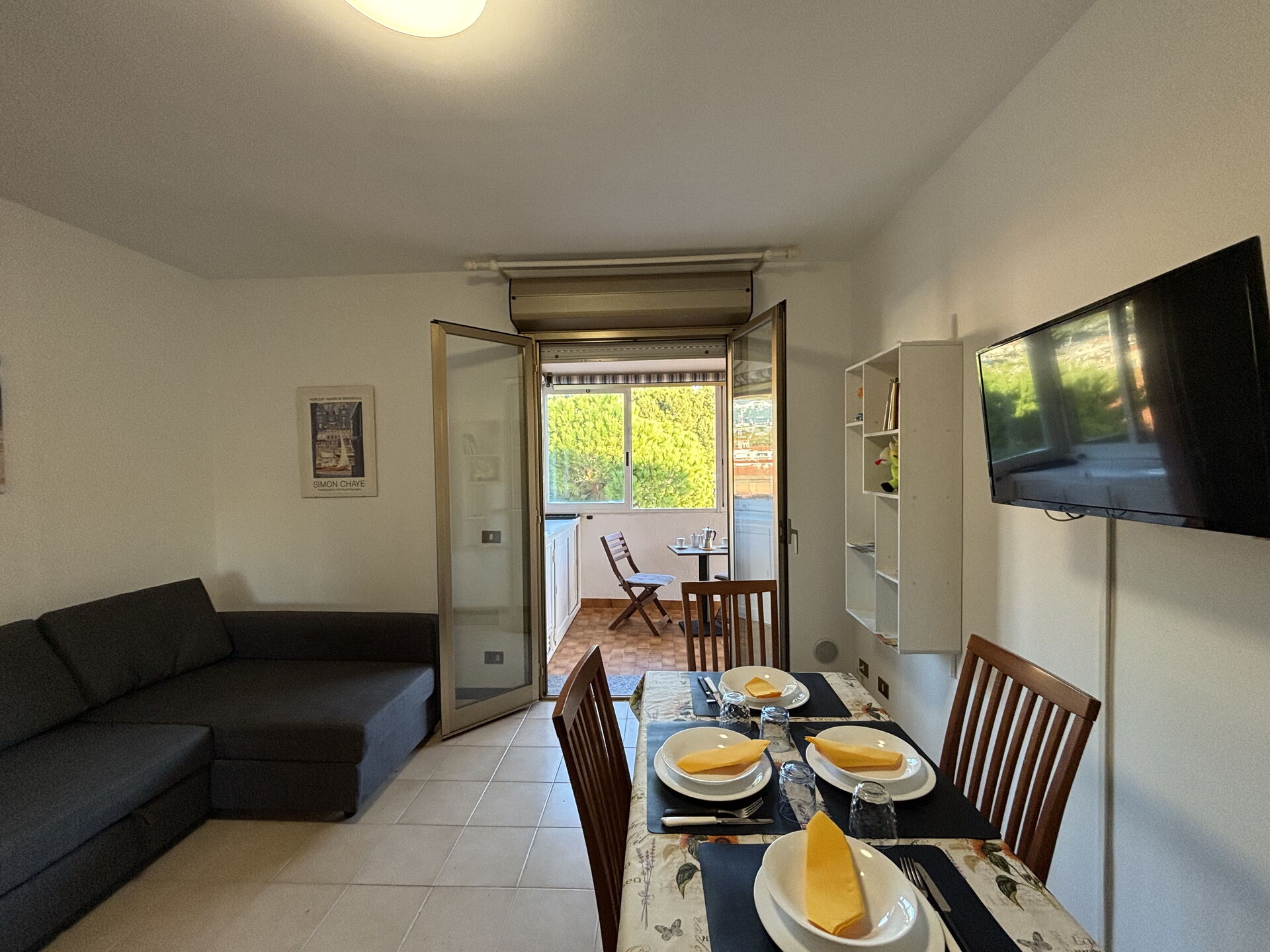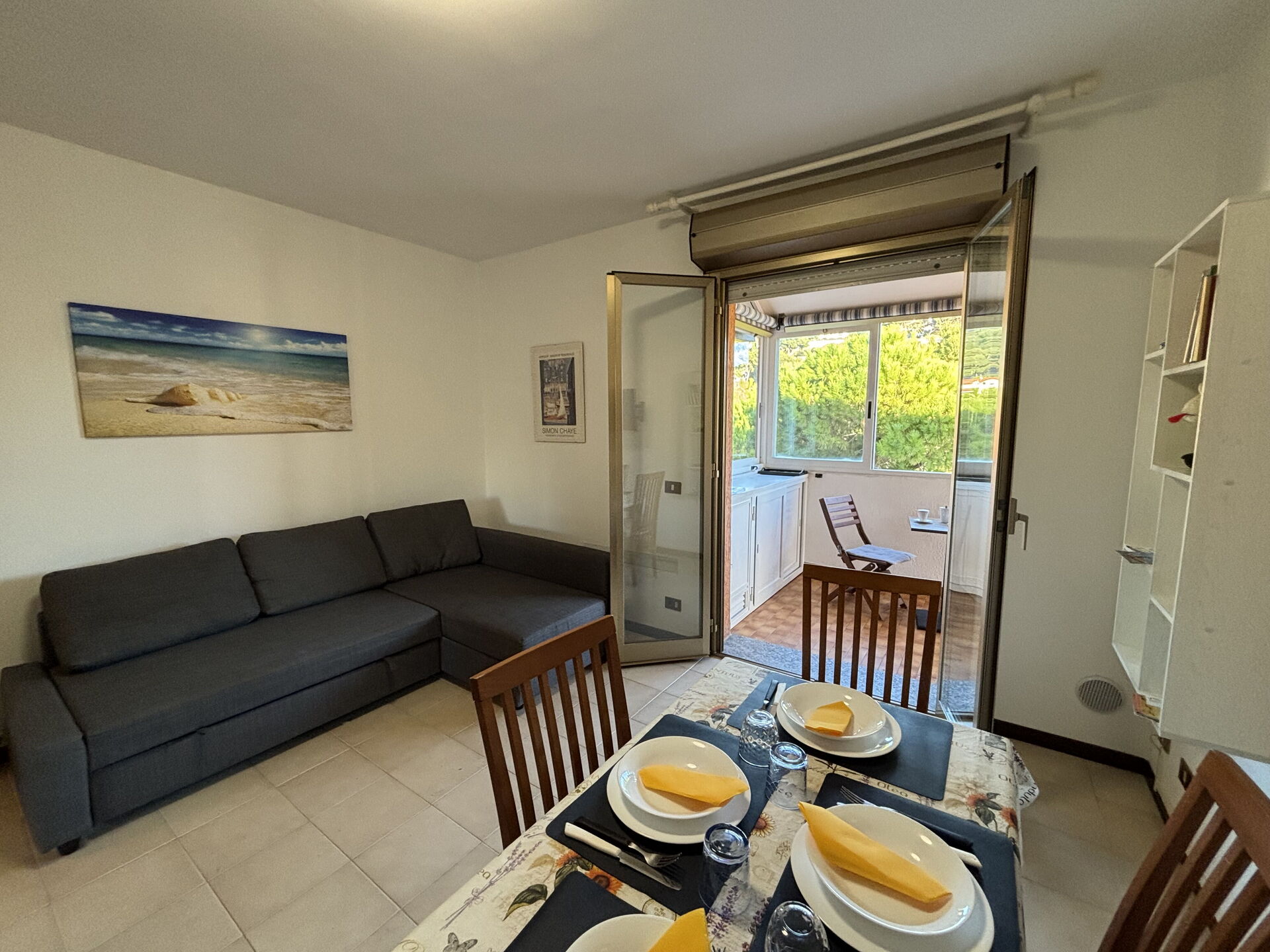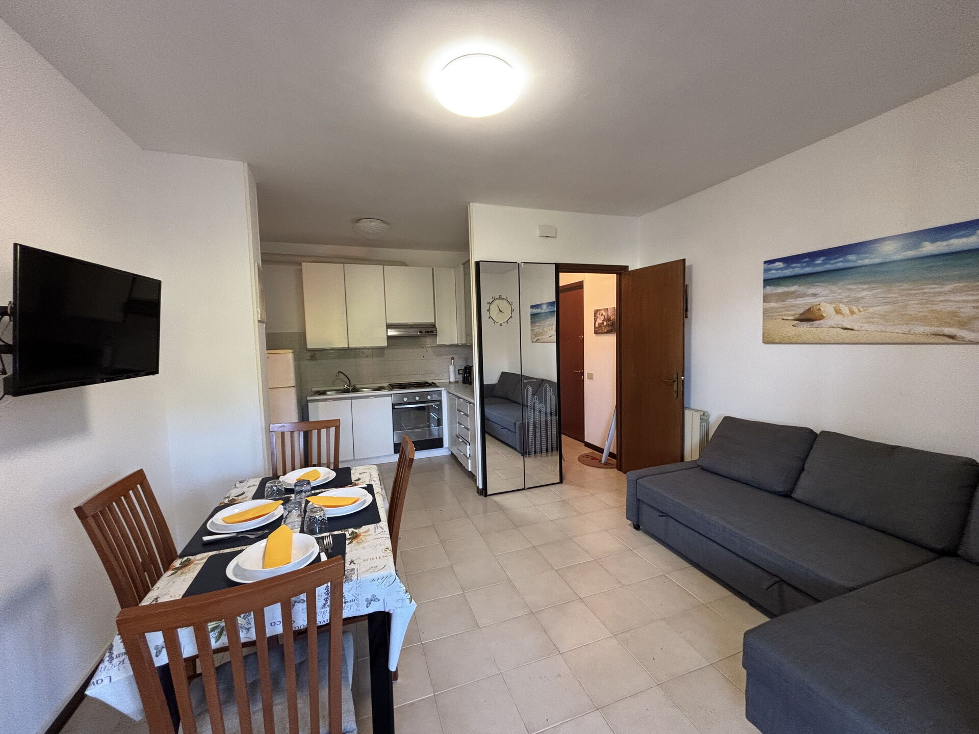 Wohnküche: gut ausgestattete Küche, Esstisch, Kühlschrank, Tiefkühler, Mikrowelle, Herd, Ofen, Doppel-Schlafsofa, TV, Ausgang auf die Terrasse.