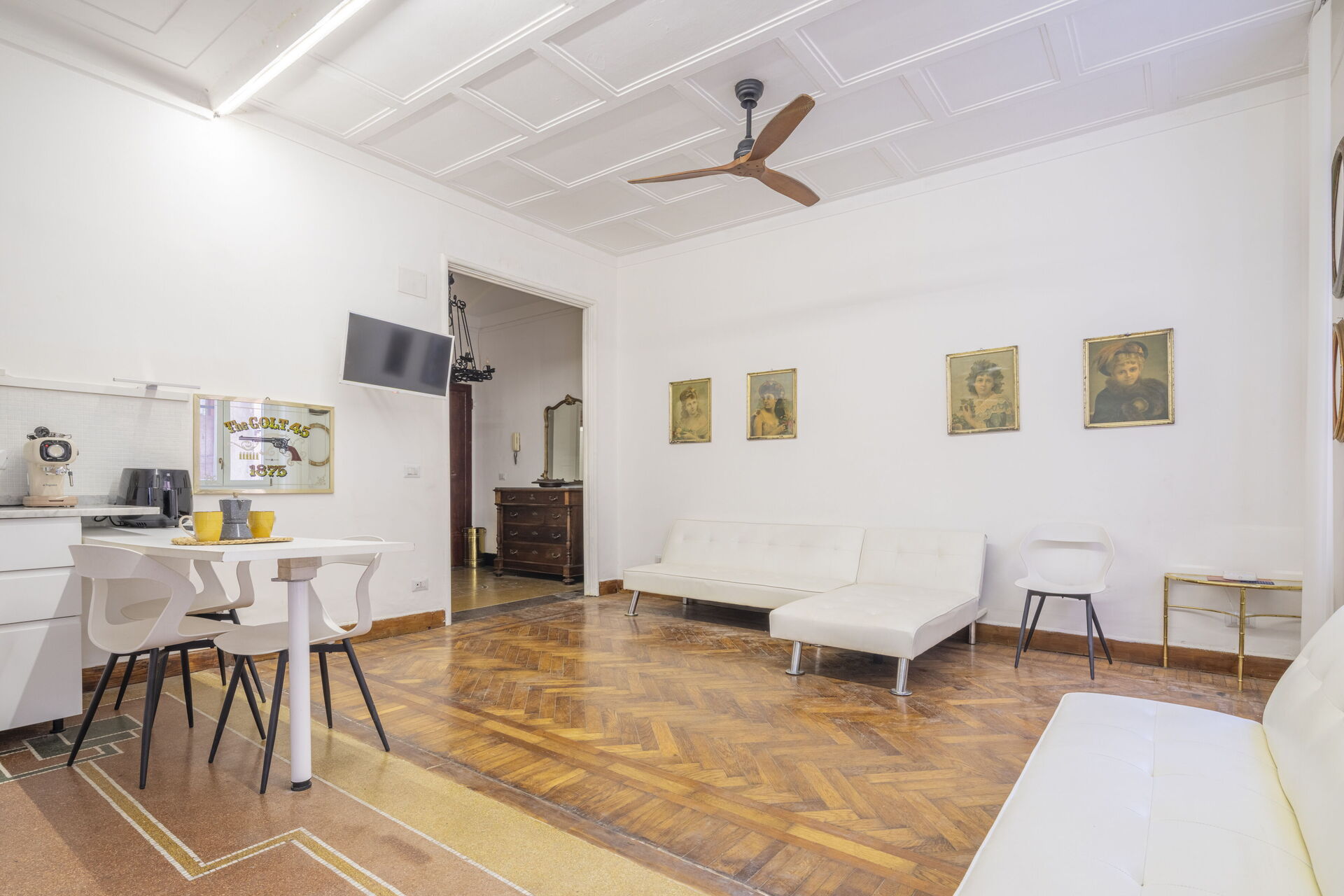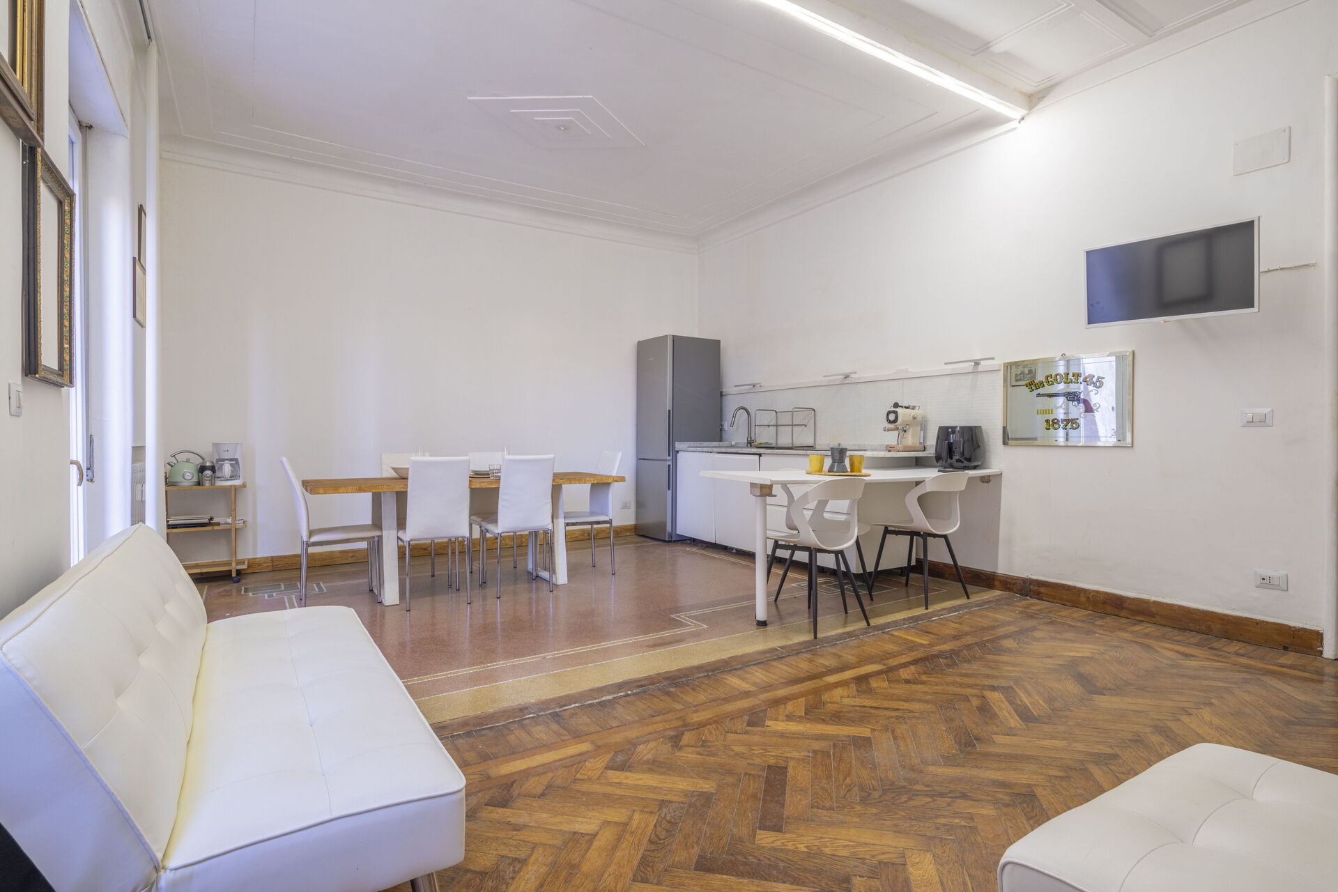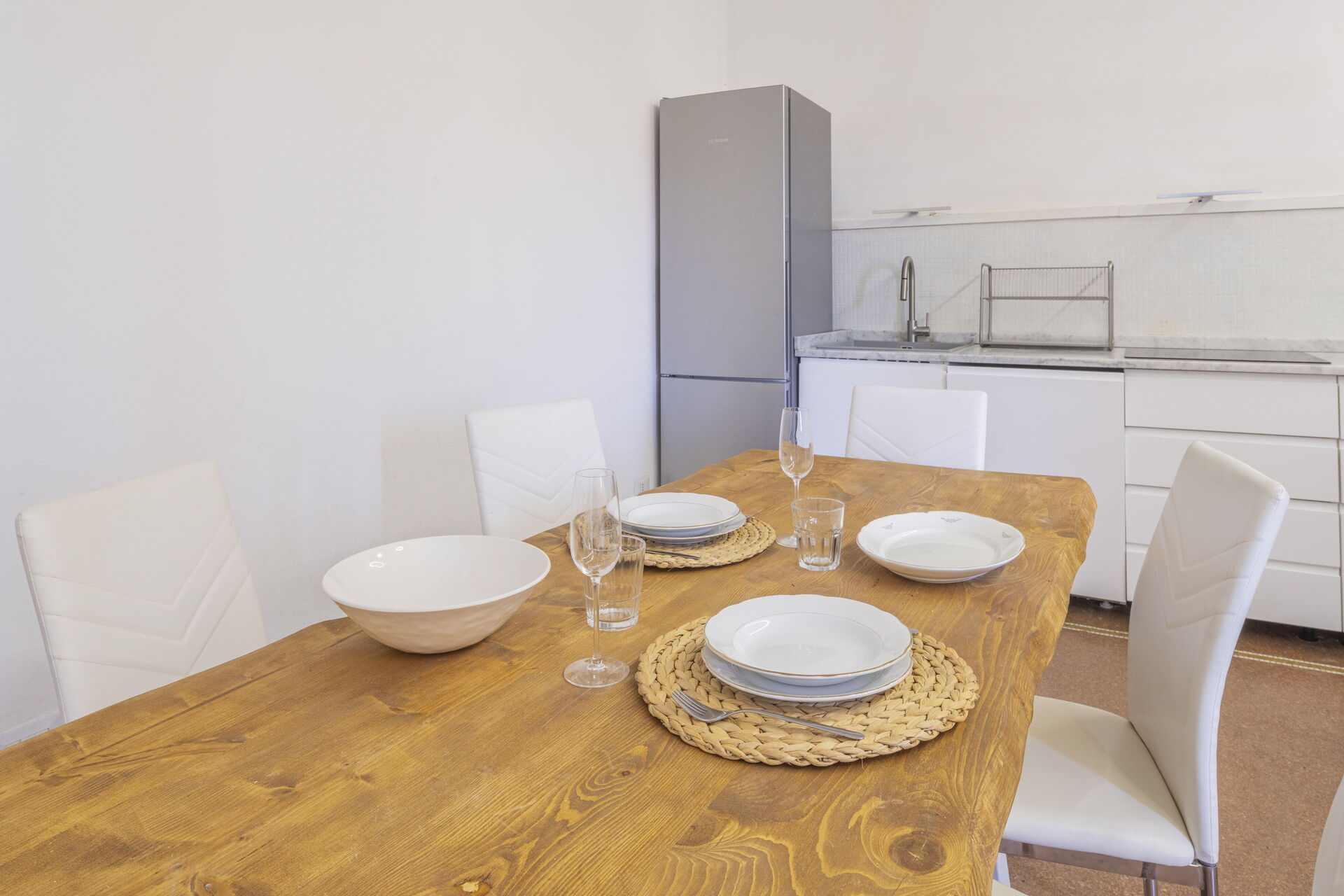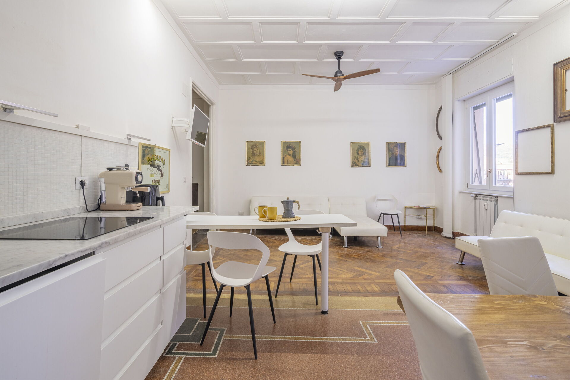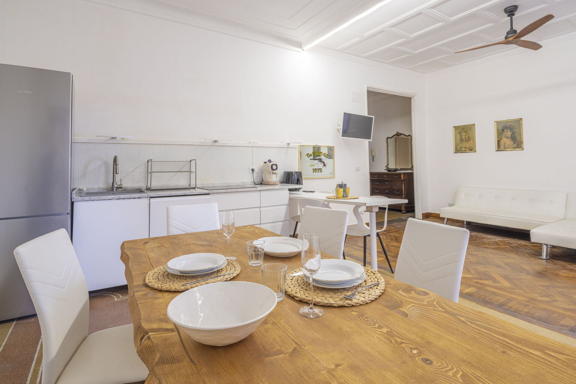 Wohnküche: gut ausgestattete Küche, Esstisch, Spülmaschine, Kühlschrank, Tiefkühler, Herd, Toaster, Italienische Kaffeemaschine, zwei Sofas, WiFi Internet, TV, Deckenventilator, Ausgang auf die Terrasse.