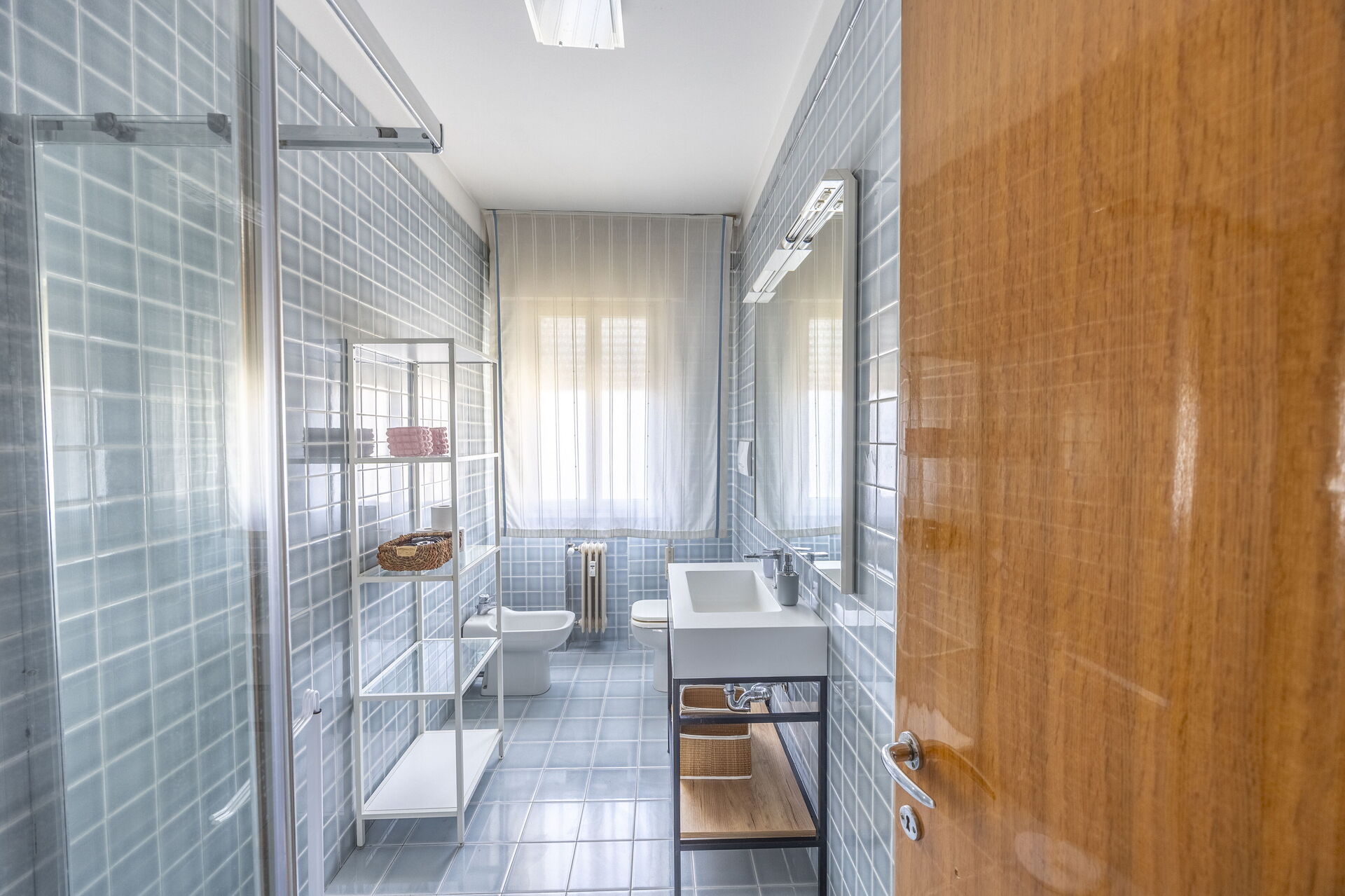 Badezimmer: Waschbecken, WC, Bidet, Dusche, Fön, Waschmaschine.
