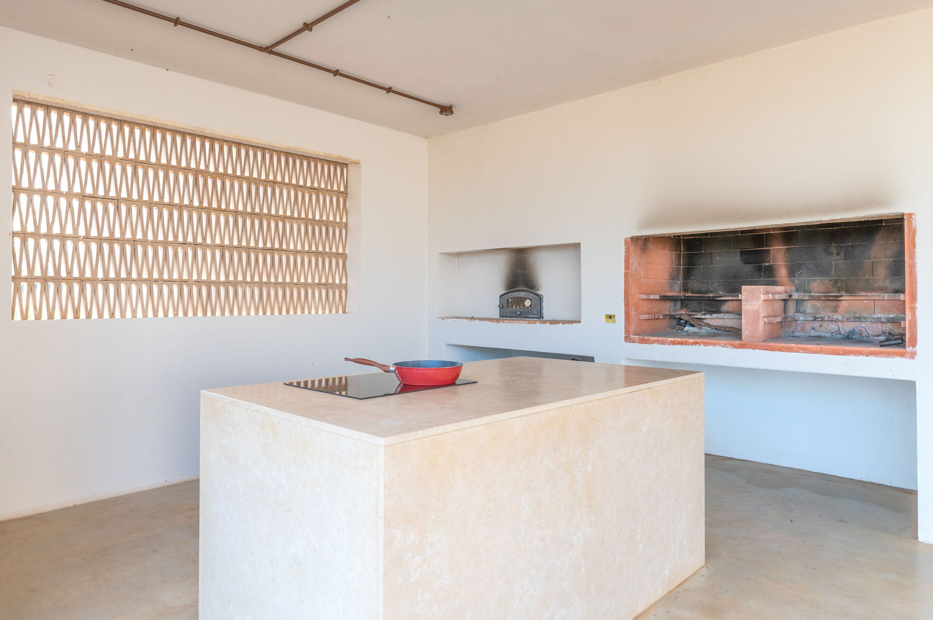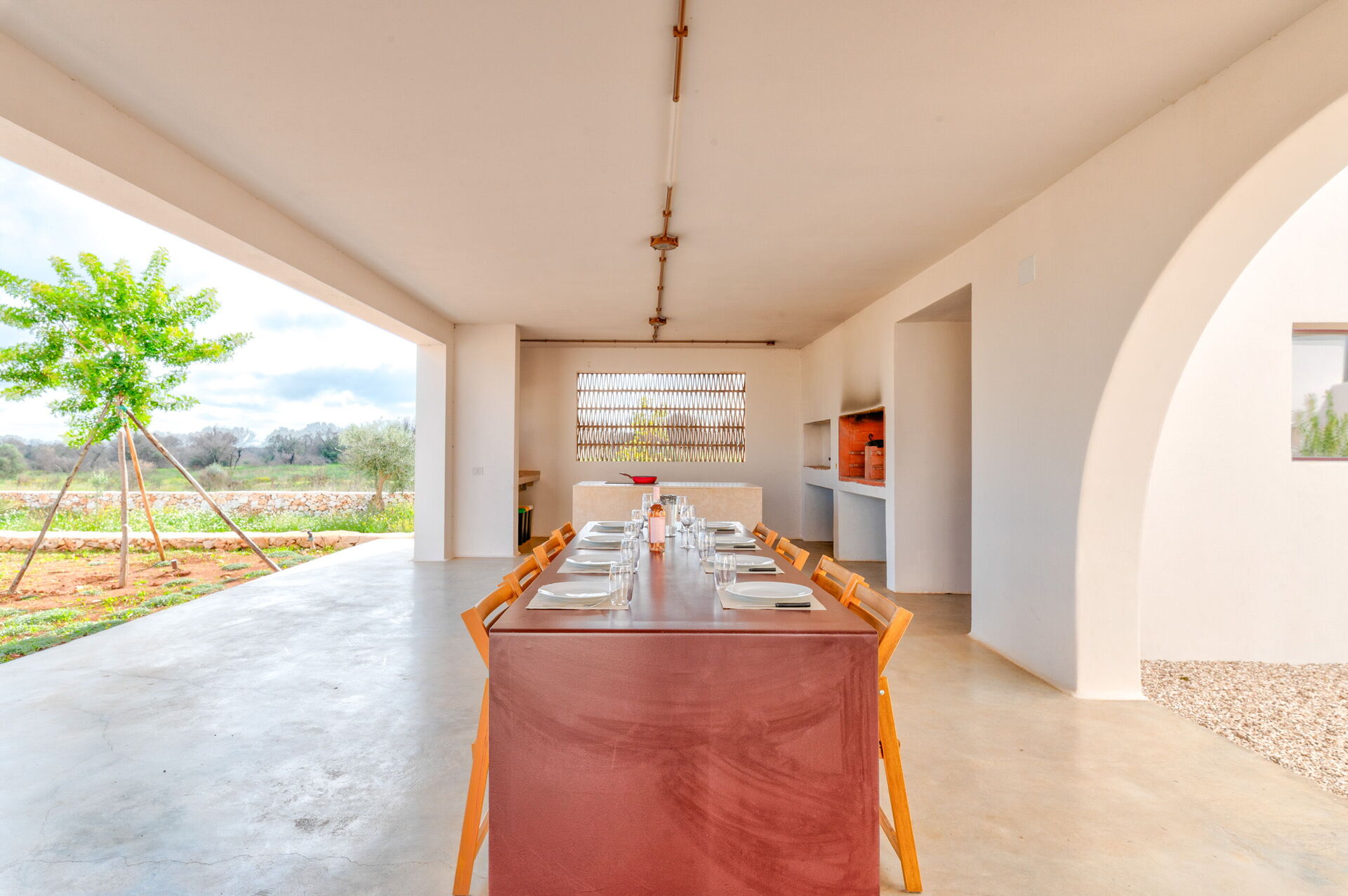 Outdoor Dining: Sheltered veranda with a 10-seater table, BBQ, and a traditional wood-fired oven.