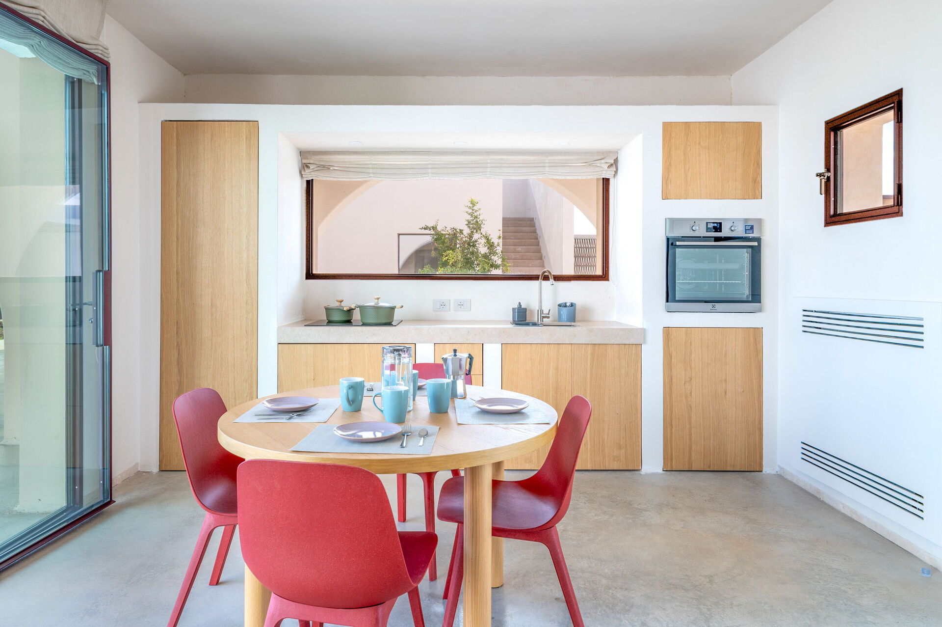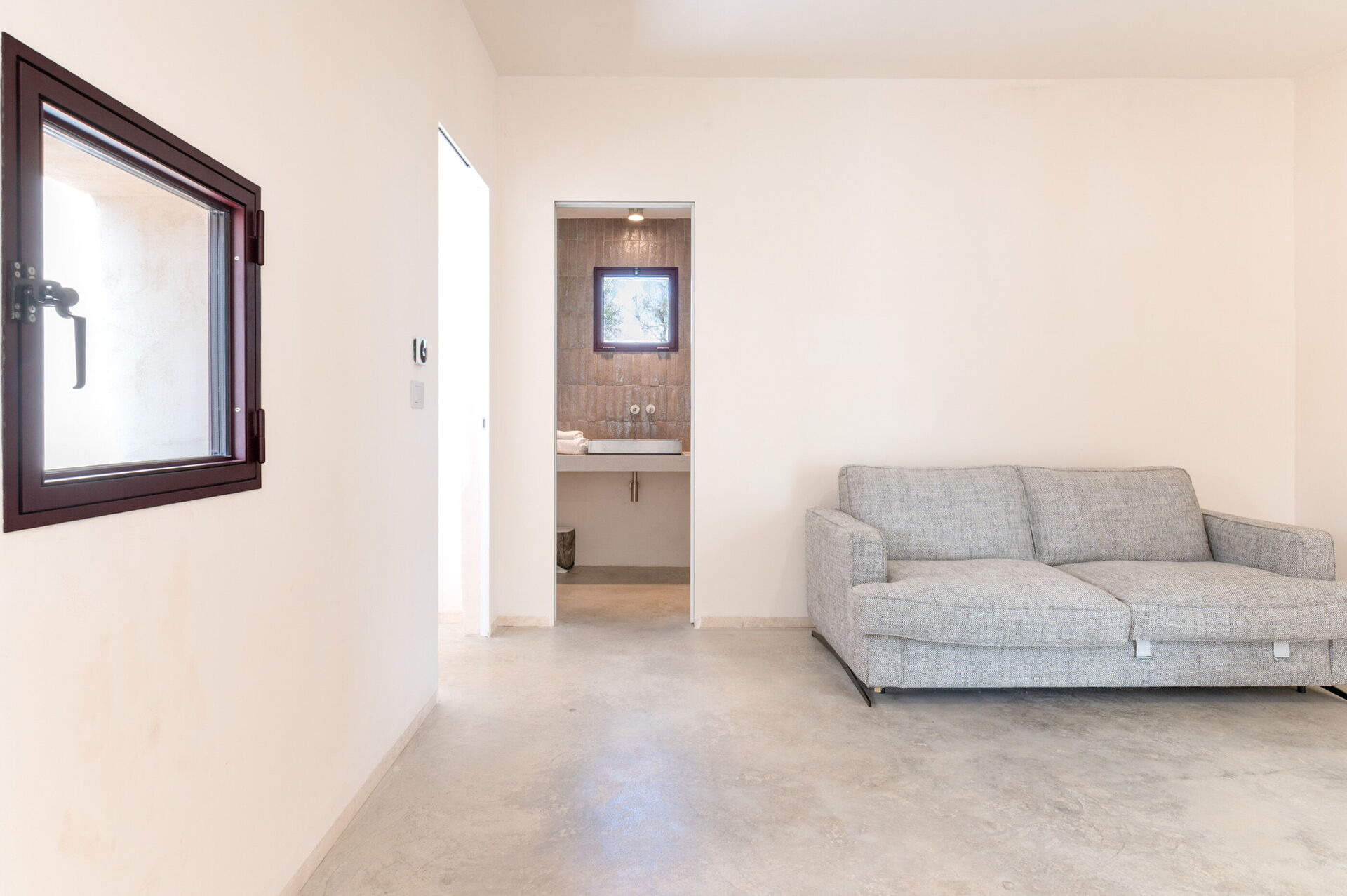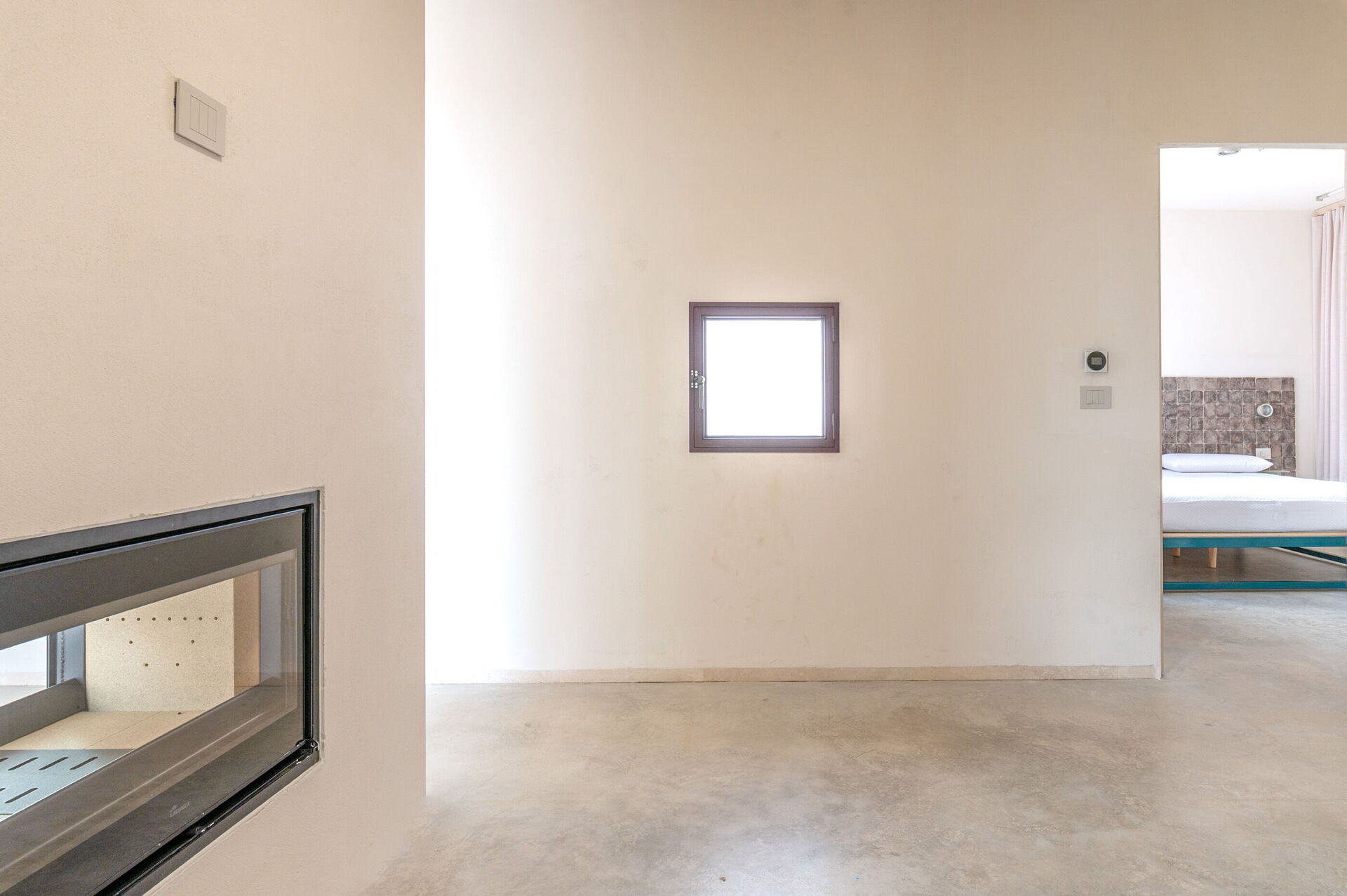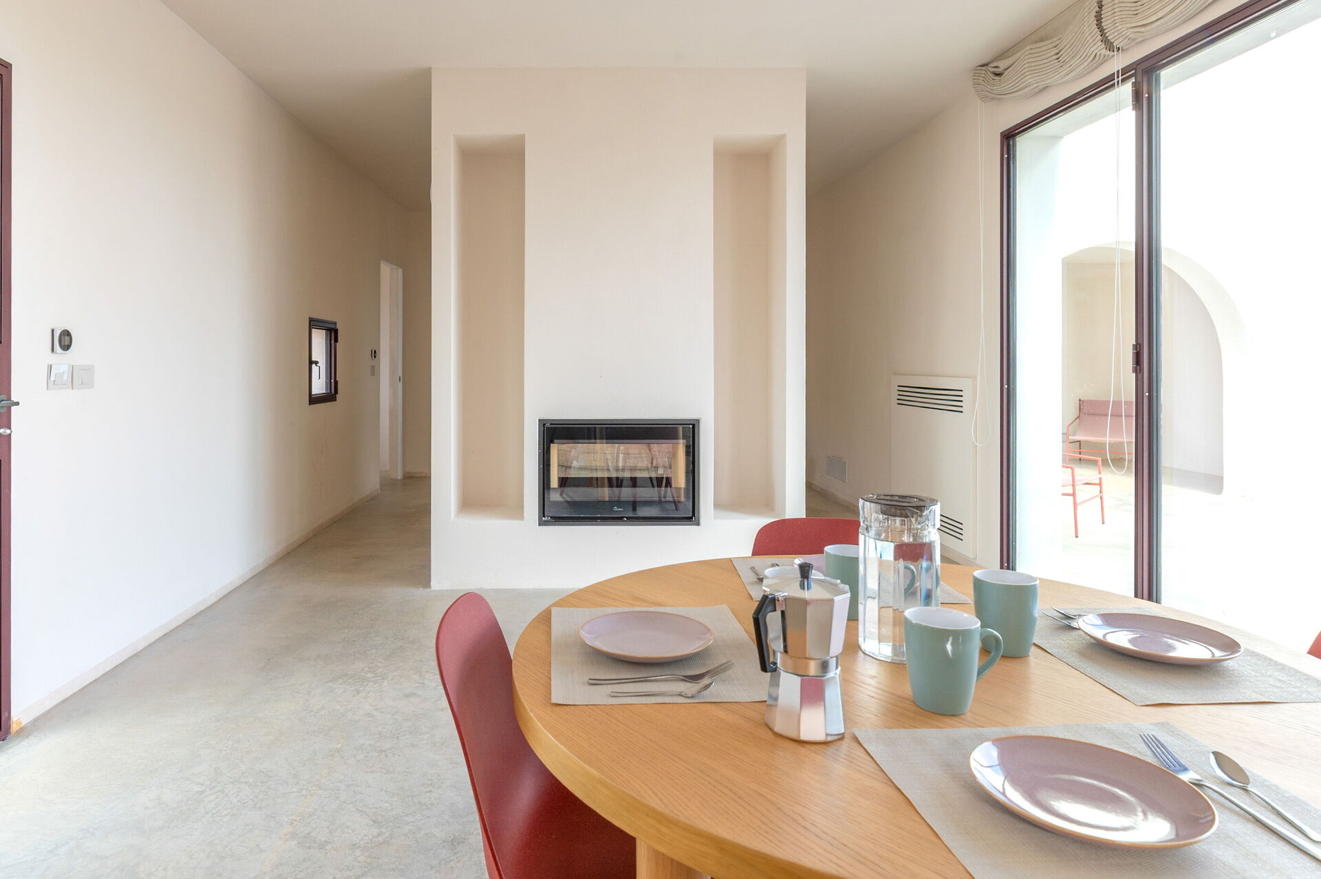 Living Area (Living & Kitchen): A welcoming open-space environment with a working fireplace, a double sofa bed for extra guests, and a dining area. The kitchen is Full Electric, equipped with an induction hob, oven, dishwasher, fridge-freezer, and dual coffee options (Nespresso capsule machine and filter coffee). The entire area is air-conditioned (with sensors to deactivate the system when doors or windows are open to support environmental sustainability) and offers direct access to the central courtyard
