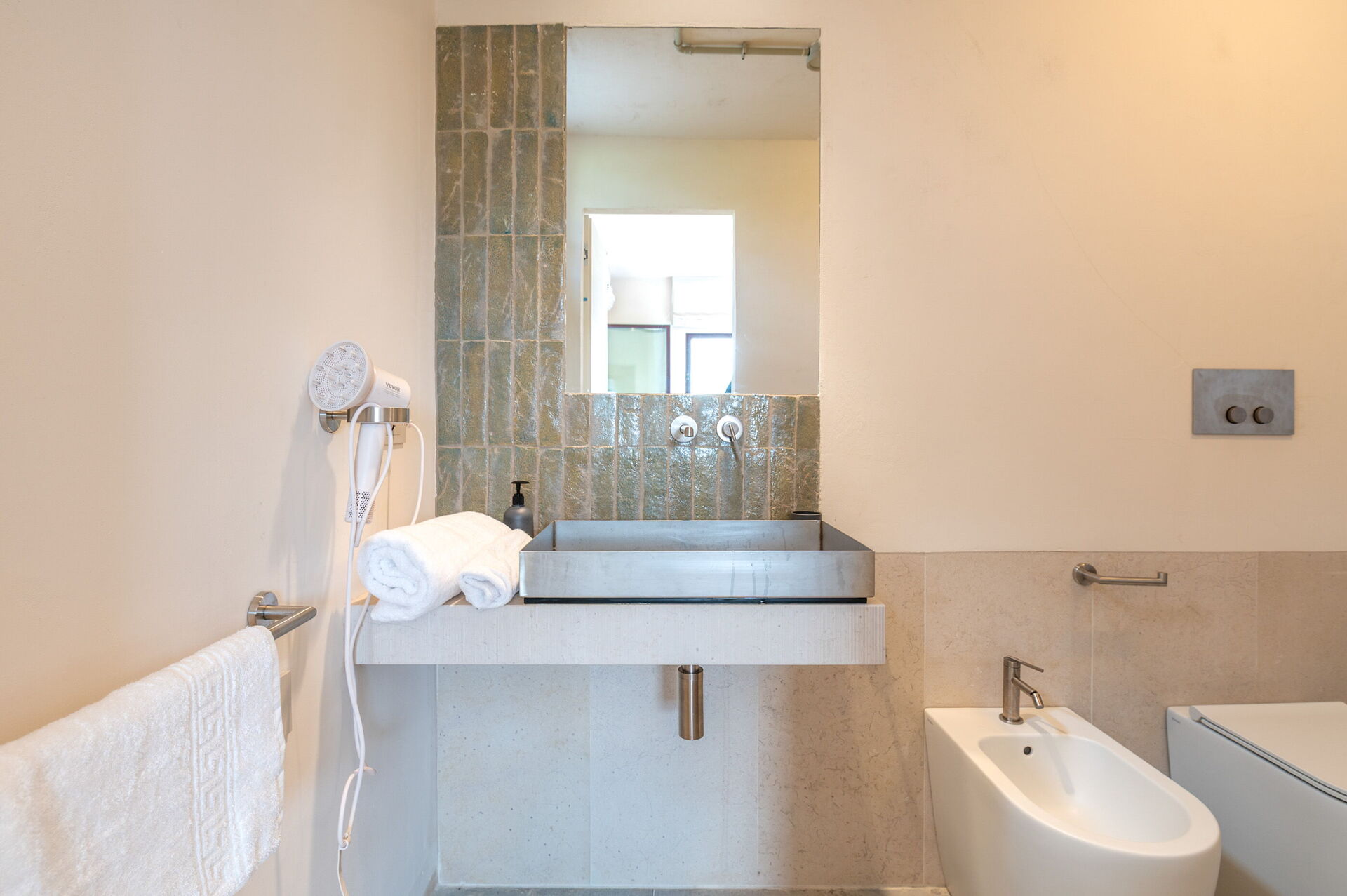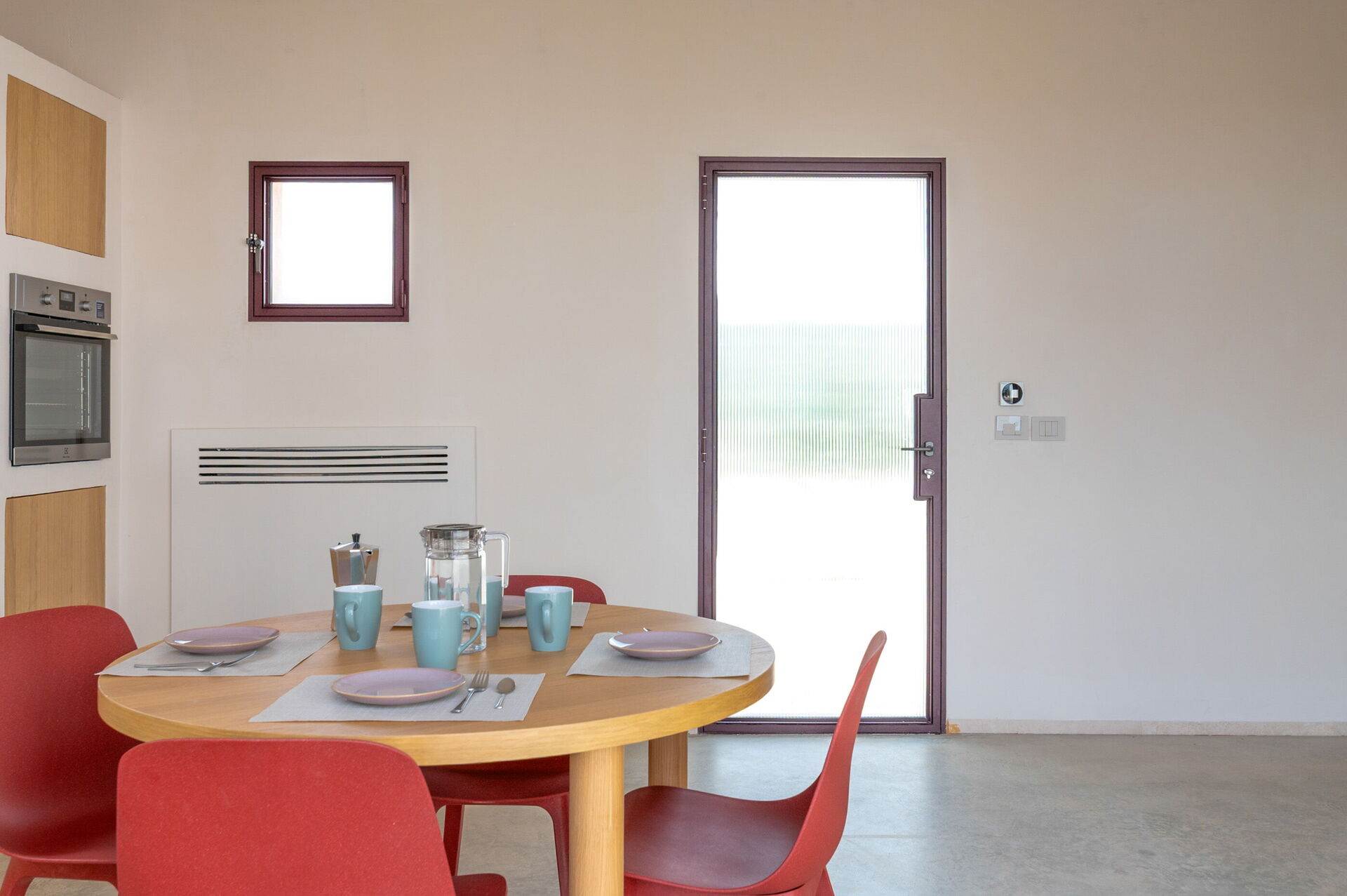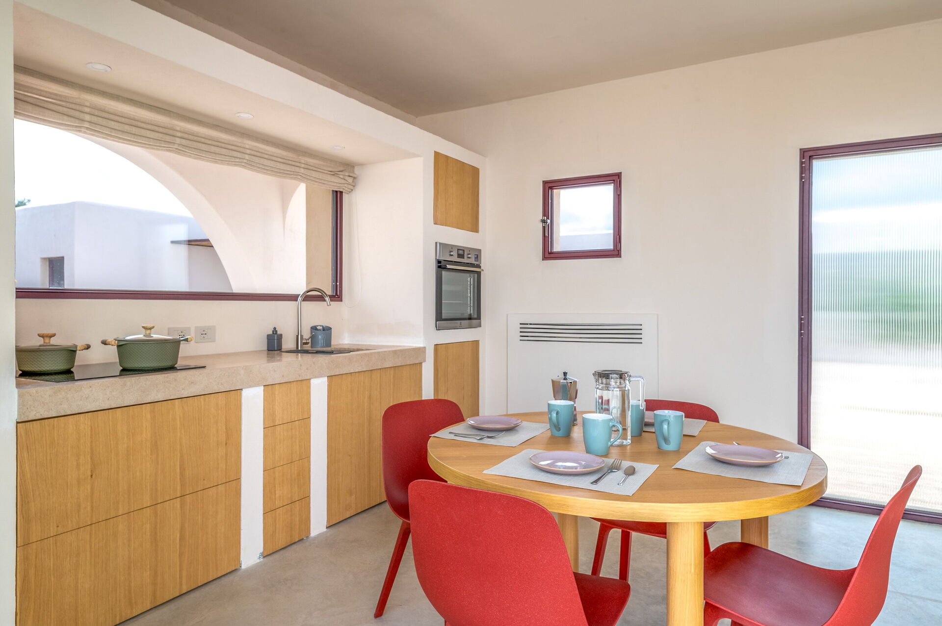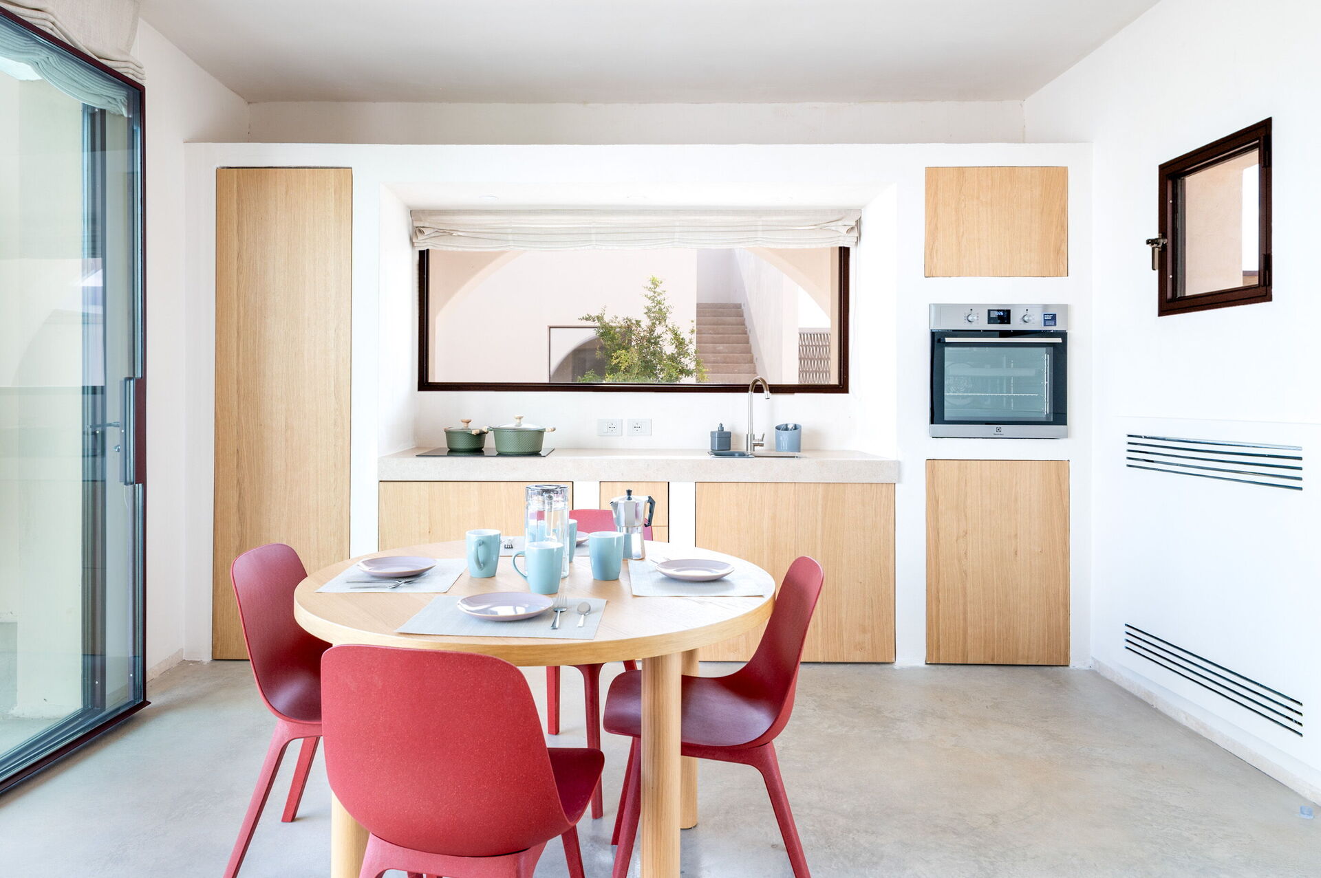 Living Area (Living & Kitchen): A welcoming open-space environment with a working fireplace, a double sofa bed for extra guests, and a dining area. The kitchen is Full Electric, equipped with an induction hob, oven, dishwasher, fridge-freezer, and dual coffee options (Nespresso capsule machine and filter coffee). The entire area is air-conditioned (with sensors to deactivate the system when doors or windows are open to support environmental sustainability) and offers direct access to the central courtyard