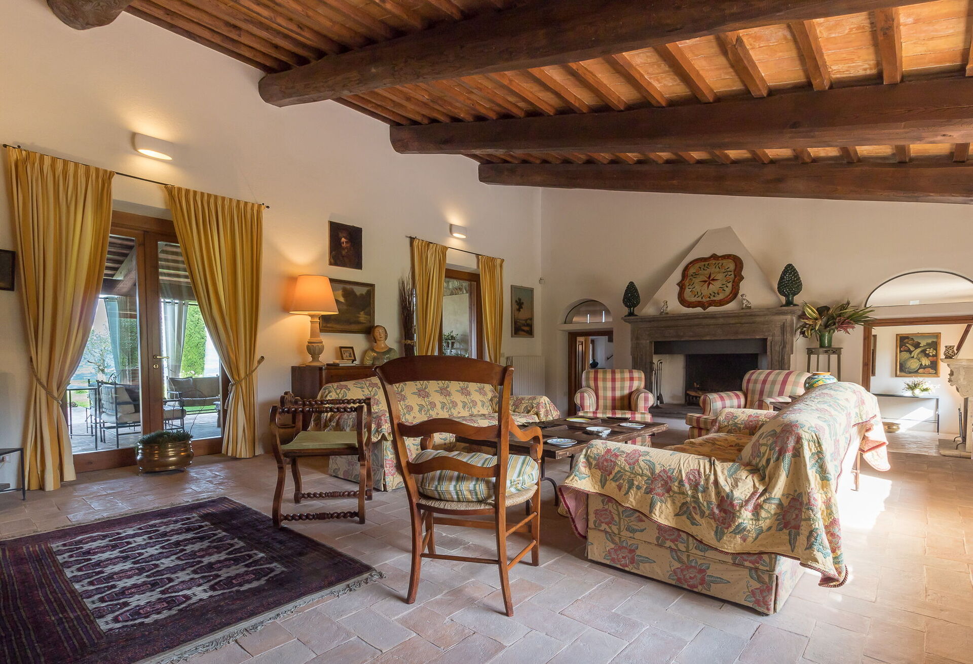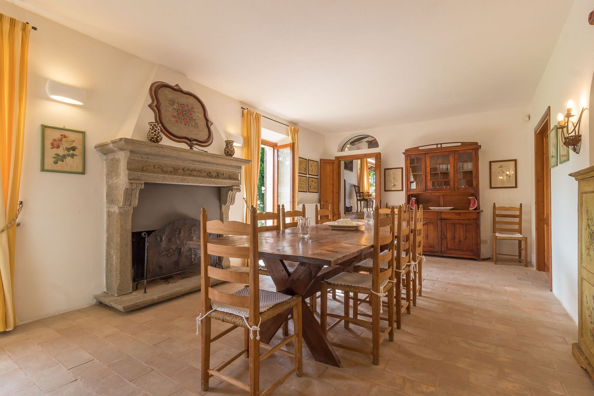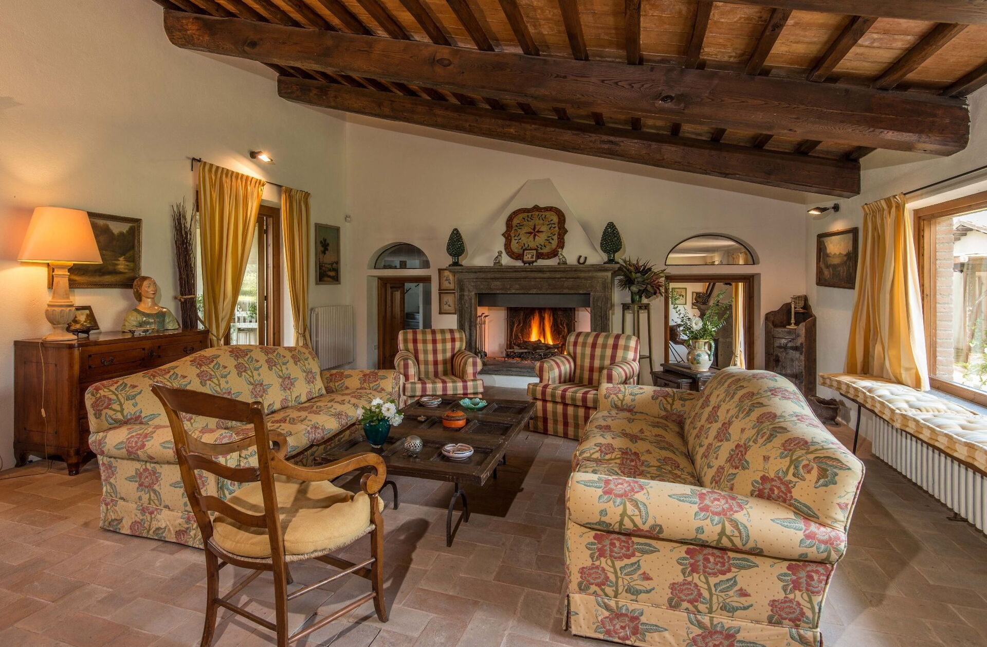 Sie finden diese weitläufige Ferienunterkunft durchdacht gestaltet, um bis zu 14 Gäste in 7 Schlafzimmern und 7 Badezimmern unterzubringen, verteilt auf das Haupthaus und ein Nebengebäude. Das Haupthaus verfügt über einen Eingang im Erdgeschoss, der Sie in ein erstes Wohnzimmer führt, das mit einem bequemen Chesterfield-Sofa und ein paar Sesseln ausgestattet ist und Sitzgelegenheiten für bis zu 7 Personen bietet. Angrenzend an diesen Bereich entdecken Sie ein großes Wohnzimmer mit funktionierendem Kamin und bequemen Sofas und Sesseln, die bis zu 10 oder 12 Personen Platz bieten, mit Flügeltüren, die zur überdachten Loggia führen, wo Sie entspannen und die Aussicht genießen können. Neben dem Wohnzimmer befindet sich ein großes Esszimmer mit funktionierendem Kamin, das bis zu 14 Personen Platz bietet. Das Erdgeschoss umfasst auch eine große Küche mit separatem Essbereich, funktionierendem Kamin und einem Tisch für 8 Personen, mit Flügeltüren, die zu einer Essterrasse und einem zweiten Wohnbereich im Freien führen. Ein Gästebad dient dieser Ebene. Das Erdgeschoss wird durch ein klimatisiertes Doppelzimmer mit Kingsize-Bett, separatem Wohnzimmer und begehbarem Kleiderschrank vervollständigt, begleitet von einem eigenen Badezimmer mit Badewanne mit Handbrause und separater Dusche. Die erste Etage bietet Schlafmöglichkeiten für bis zu 8 Personen und herrliche Ausblicke über die sanften Hügel und die Landschaft. Sie finden ein Hauptschlafzimmer mit Kingsize-Bett, funktionierendem Kamin und begehbarem Kleiderschrank, mit eigenem Badezimmer mit Dusche und Doppelwaschbecken. Drei weitere Schlafzimmer auf dieser Etage bieten flexible Schlafmöglichkeiten mit Einzelbetten, die zu Doppelbetten zusammengestellt werden können. Eines dieser Schlafzimmer verfügt über einen begehbaren Kleiderschrank, und ihre eigenen Badezimmer sind entweder mit Duschen oder einer Badewanne mit Handbrause ausgestattet. Das Nebengebäude, gegen Aufpreis verfügbar, bietet 2 zusätzliche klimatisierte Schlafzimmer. Ein Zweibett- oder Doppelzimmer mit Einzelbetten, die zusammengestellt werden können, hat Flügeltüren, die zum Garten führen, und ein eigenes Badezimmer mit Dusche. Ein Doppelzimmer mit Queensize-Bett hat eine Tür, die zum Garten führt, und ein eigenes Badezimmer mit Dusche.