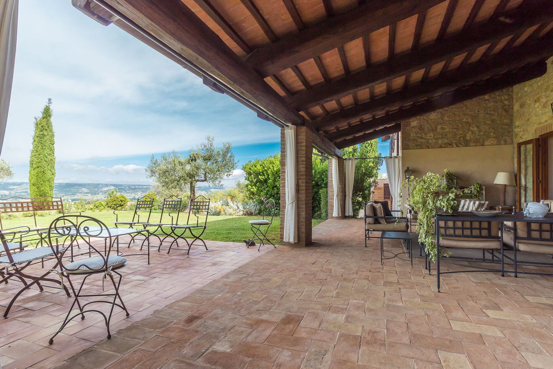 Sie werden auf dem gesamten Anwesen mehrere Wohnbereiche im Freien entdecken, die für Entspannung und Unterhaltung konzipiert sind. Eine elegant eingerichtete Loggia verfügt über bequeme Sofas mit freiem Blick über die umgebende Landschaft und bietet einen idealen Raum für nachmittägliche Gespräche. Ein zweites Wohnzimmer im Freien bietet zusätzlichen Platz zum Zusammenkommen, während eine dritte Pergola direkt neben der Küche einen Esstisch mit Sitzgelegenheiten für 14 Personen umfasst, perfekt um gemeinsam Mahlzeiten an der frischen Luft zu genießen. Der Panorama-Swimmingpool ist über einige Stufen vom Haus aus erreichbar, wo Sie auch eine weitere möblierte Terrasse und einen Tennisplatz mit verfügbaren Schlägern für Ihre Nutzung finden. Von dieser erhöhten Position aus wird die Aussicht noch beeindruckender und umfasst die Burg von Guardea und erstreckt sich bis zur Stadt Orvieto über die sanfte umbrische Landschaft. Das Anwesen ist von sanften Hügeln, Olivenhainen und kultivierten Feldern umgeben und schafft eine wunderbar friedliche Umgebung. Die gepflegten Gärten zeigen die natürliche Schönheit der Region mit sorgfältig gepflegten Rosen, Lavendel und verschiedenen blühenden Pflanzenarten auf dem 2 Hektar großen Grundstück.