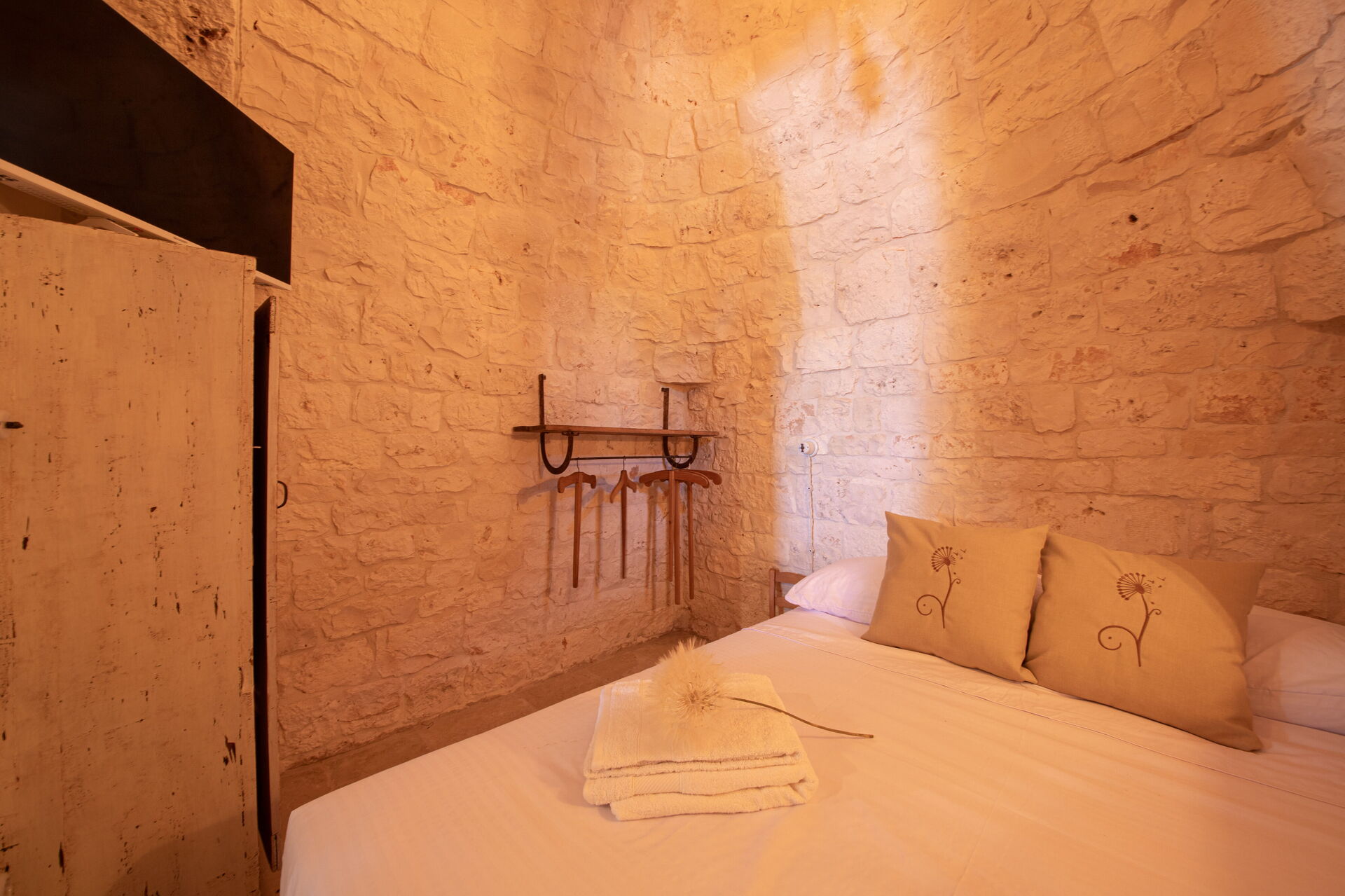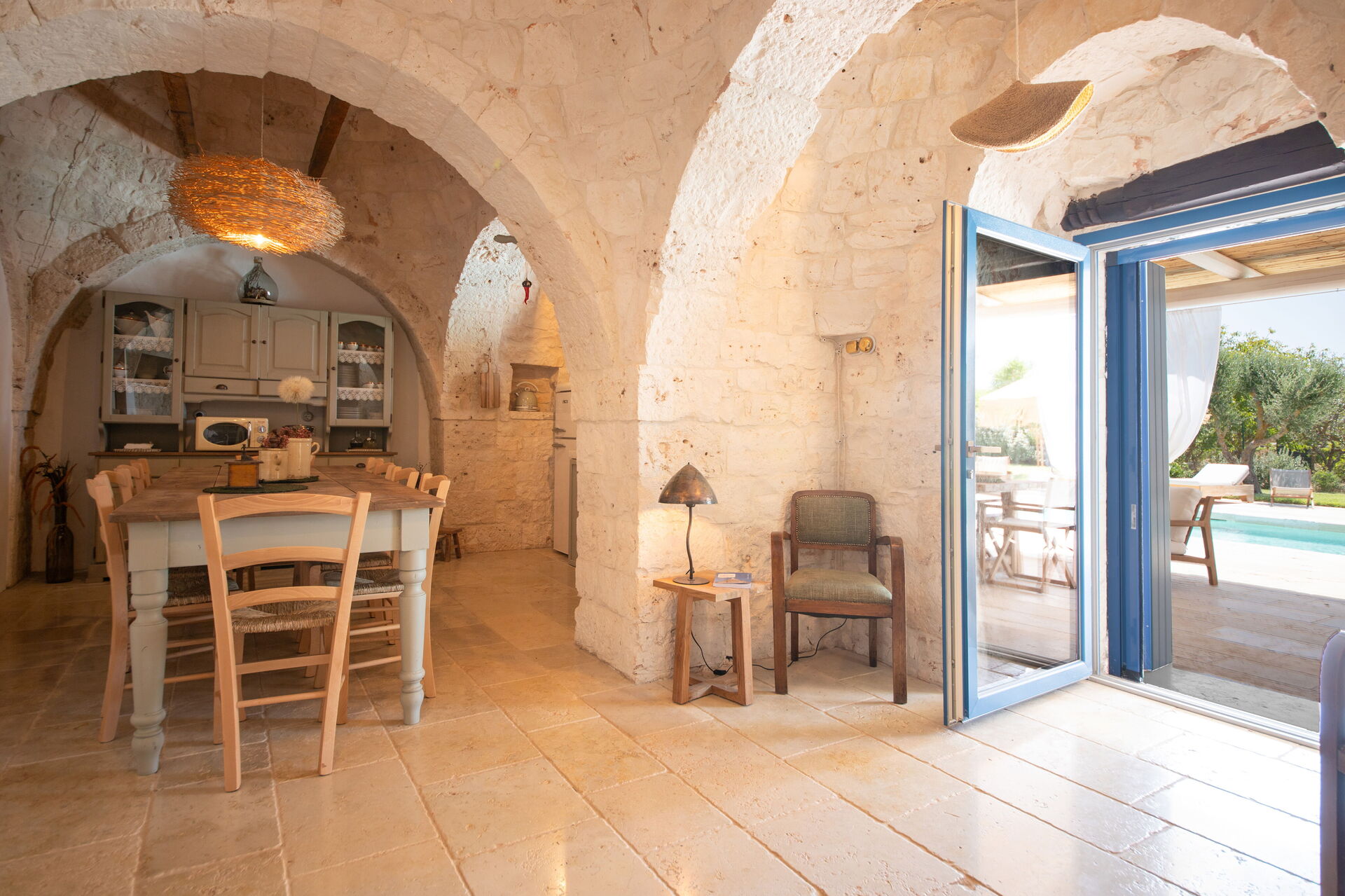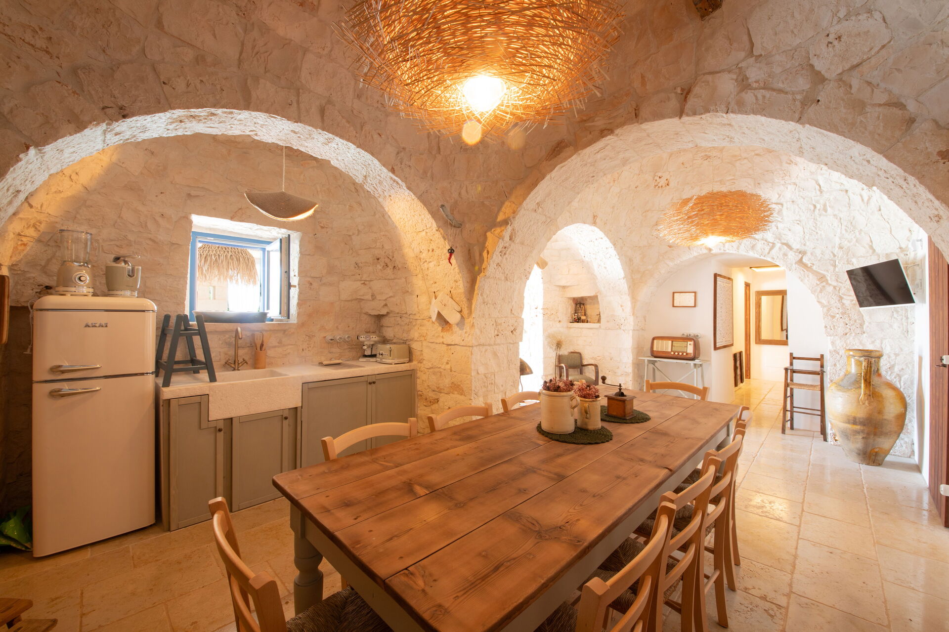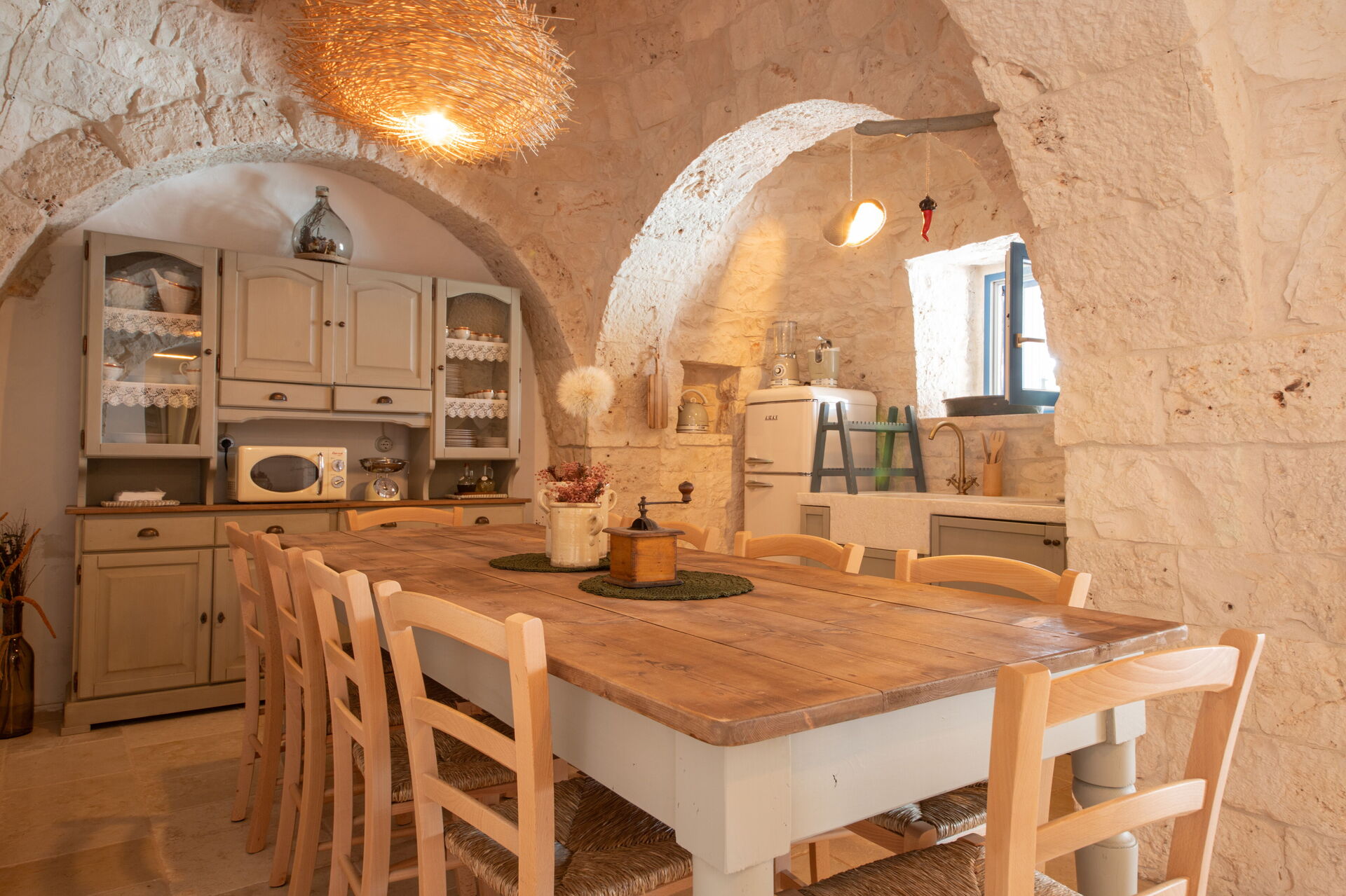 Nach Ankunft in Ihrem Ferienheim Trulli Valle D'Itria - Martina Franca werden Sie eine hübsche, saubere und gut gepflegte Unterkunft finden, ideal für einen erholsamen Apulien-Urlaub. Nach einem beschäftigten Tag, den Sie mit Museumsbesuchen verbracht haben, können Sie mit Familie und Freunden am Pool ein schönes, kühles Glas Wein genießen - einfach perfekt, um den Tag ganz ausgeruht ausklingen zu lassen. Draußen können Sie einen Grill und eine Veranda nutzen. Wenn Sie gerne für Familie und Freunde kochen, werden Sie sich über die gut ausgestattete Küche freuen mit Kaffeemaschine, Mikrowelle, Toaster, Herd und Kühlschrank, sowie ausreichend Geschirr und Besteck für bis zu acht Personen.