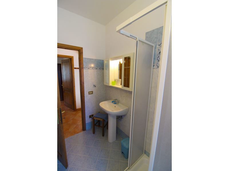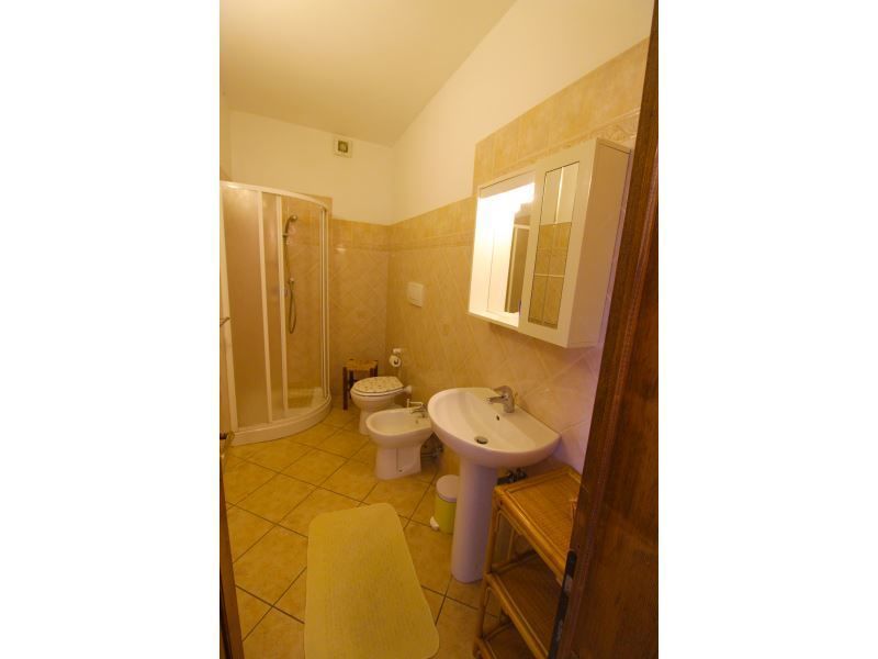 Wohnung im ersten Stock mit Eingang von der Außentreppe, bestehend aus einem großen Wohn-Esszimmer mit Kochnische, Kamin und Sofa, Schlafzimmer mit Doppelbett, Schlafzimmer mit zwei Einzelbetten und Bad mit Dusche.