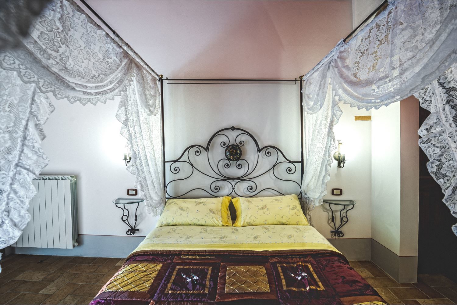 Erdgeschosswohnung im Gebäude Il Granaio: Zugang über den privaten, mit Tisch und Stühlen zum Essen im Freien ausgestatteten, kleinen Bogengang, Wohn-/Esszimmer mit Küchenzeile und Doppelschlafsofa, zwei Doppelzimmer jeweils mit Privatbad (Dusche), Suite mit Französisch Fenster auf die Veranda, mit einem Doppelzimmer mit Himmelbett und Kamin, eigenes Bad mit Dusche und Jacuzzi für zwei Personen mit Farbtherapie. Private Gartenlaube mit Tisch und Stühlen zum Essen im Freien.