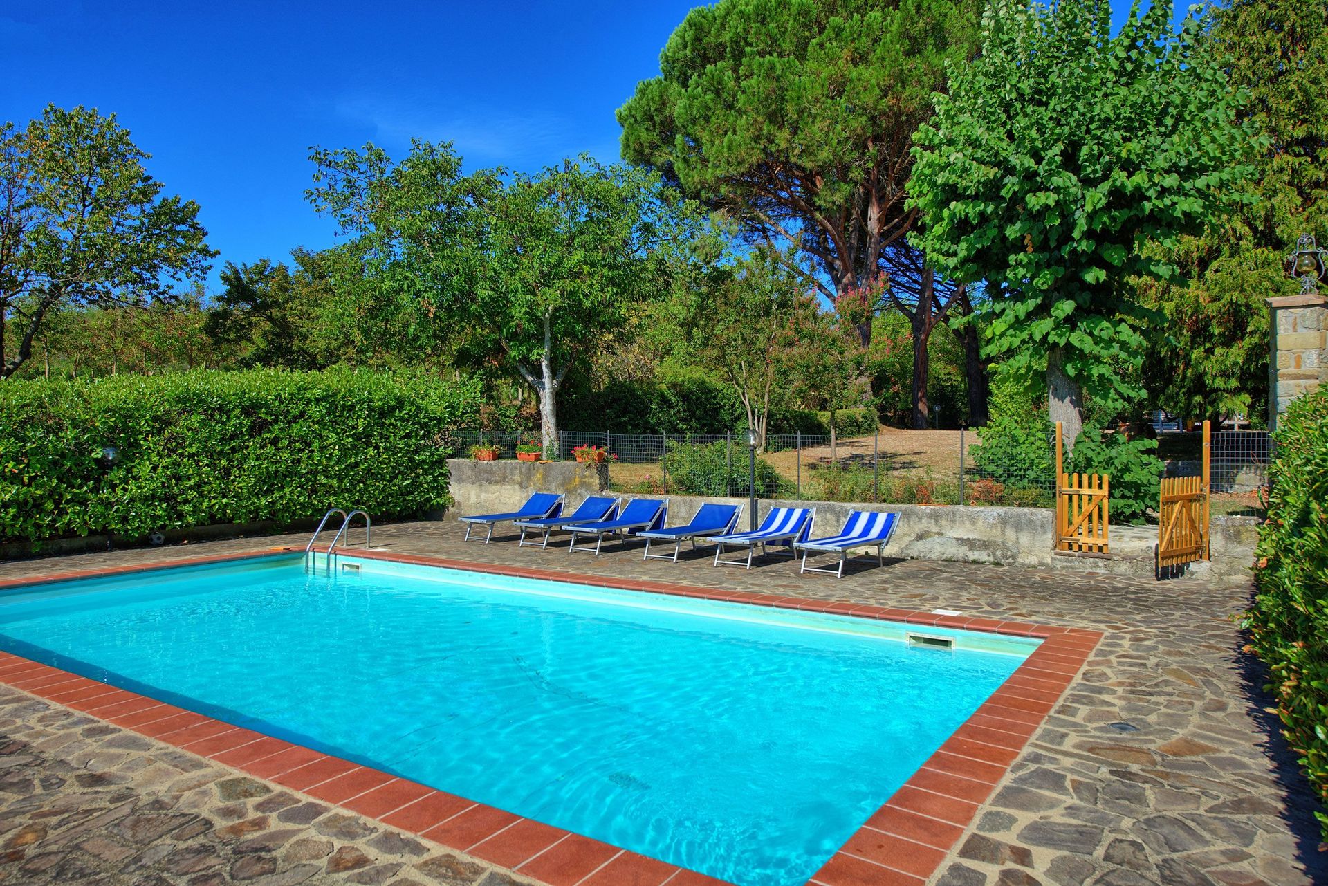 Um das Haus herum gibt es einen schönen Parkgarten, der vollständig umzäunt ist und teilweise von alten Bäumen beschattet wird. Das Schwimmbad ist eingezäunt und mit Liegestühlen ausgestattet. Ein fantastischer Ort zum Entspannen und Sonnenbaden an heißen Sommertagen. Es gibt auch einen Grillplatz, der mit Tischen, Stühlen und Bänken ausgestattet ist, um draußen zu essen und den Panoramablick auf die Chianti-Hügel mit Freunden oder der Familie zu genießen.