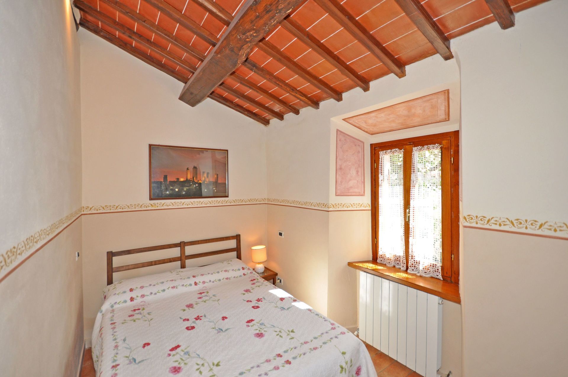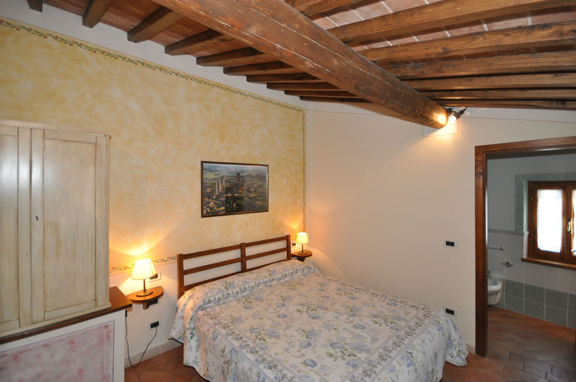 7 Stufen weiter unten: Doppelzimmer mit Ehebett und eigenem Bad mit Dusche.