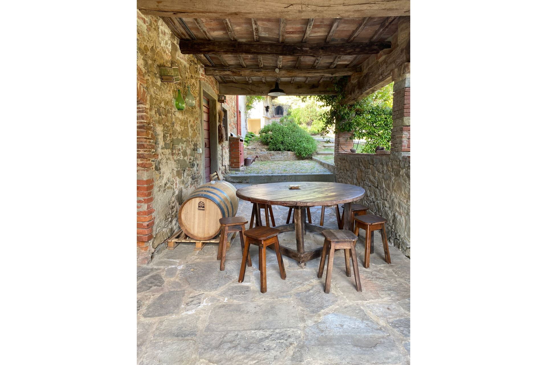 ERDGESCHOSS: Laube mit Tisch und Stühlen, antiker Stall mit Futterkrippe und antikem Fussboden aus stein, Tische und Bänke um im Freien zu entspannen, Waschküche.
