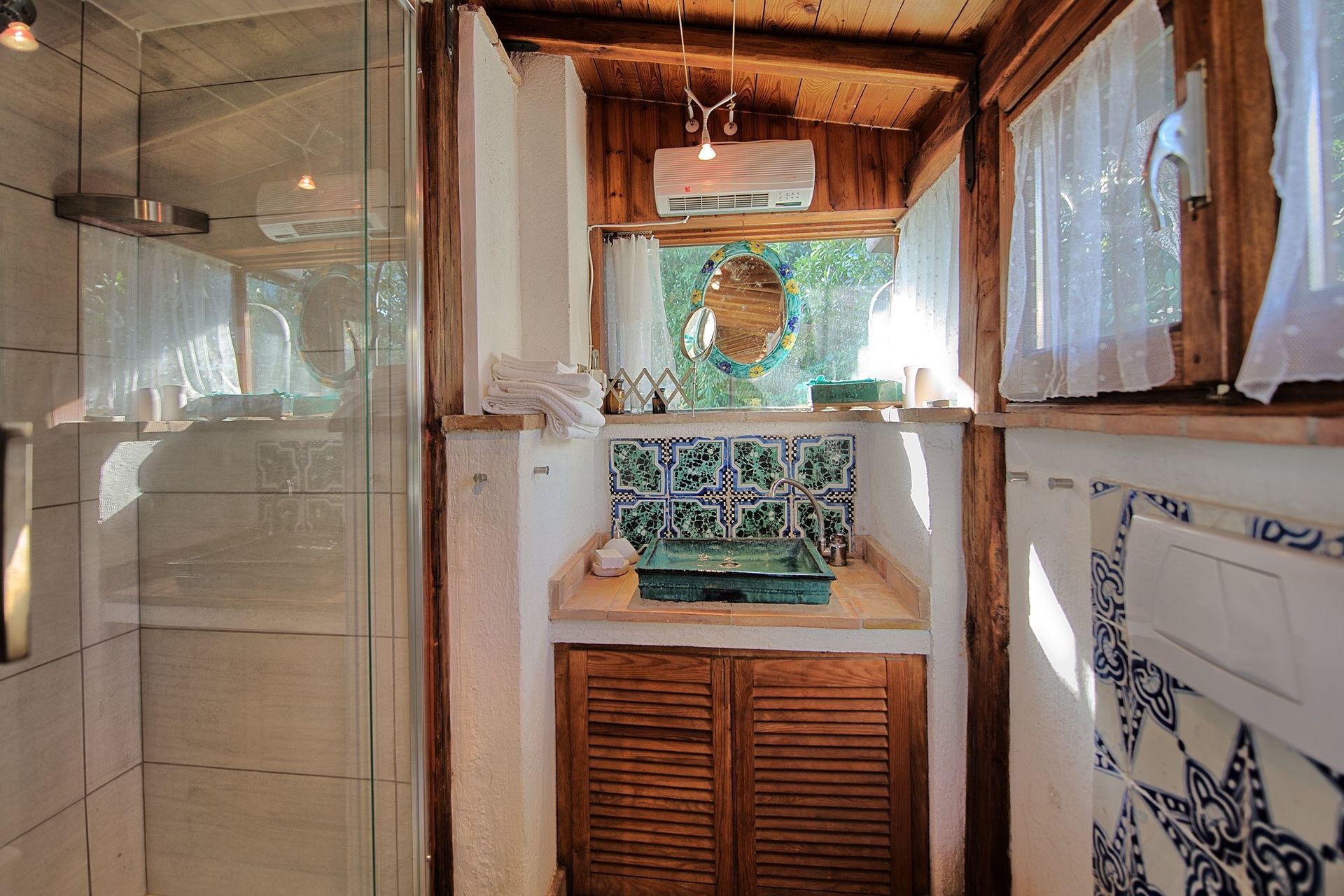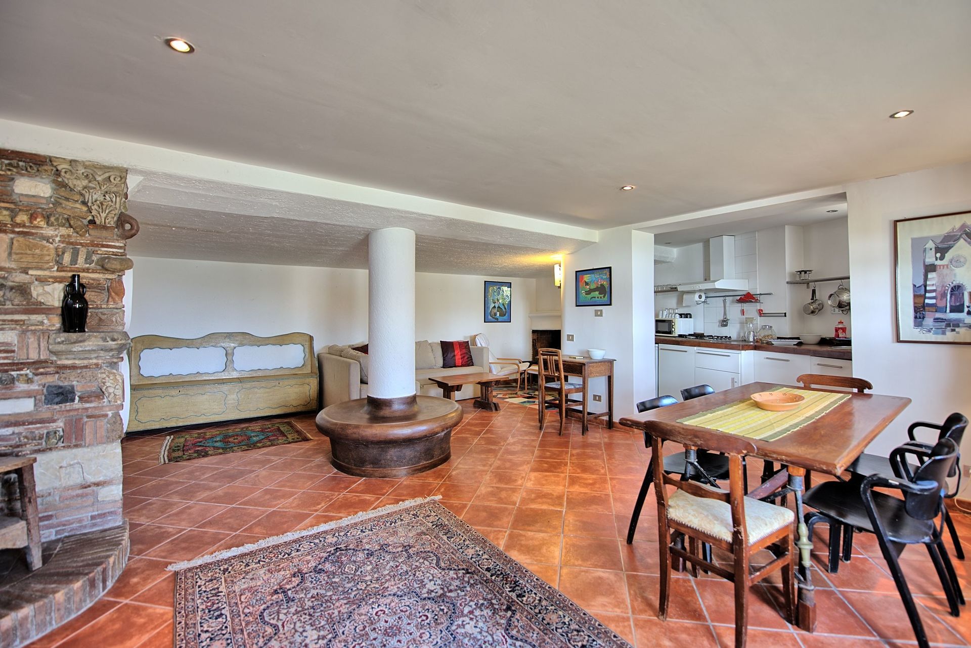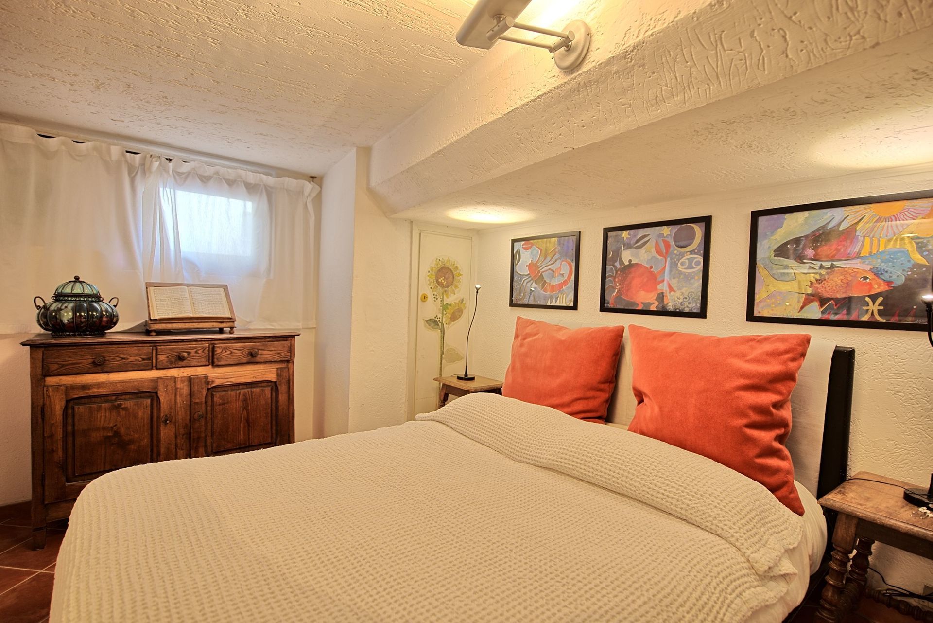 Oberes Stockwerk: Wohnzimmer mit grossen Fenterfronten, Doppelzimmer mit Ehebett (Klimaanlage), Bad mit Dusche (ohne Bidet).